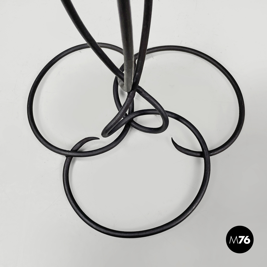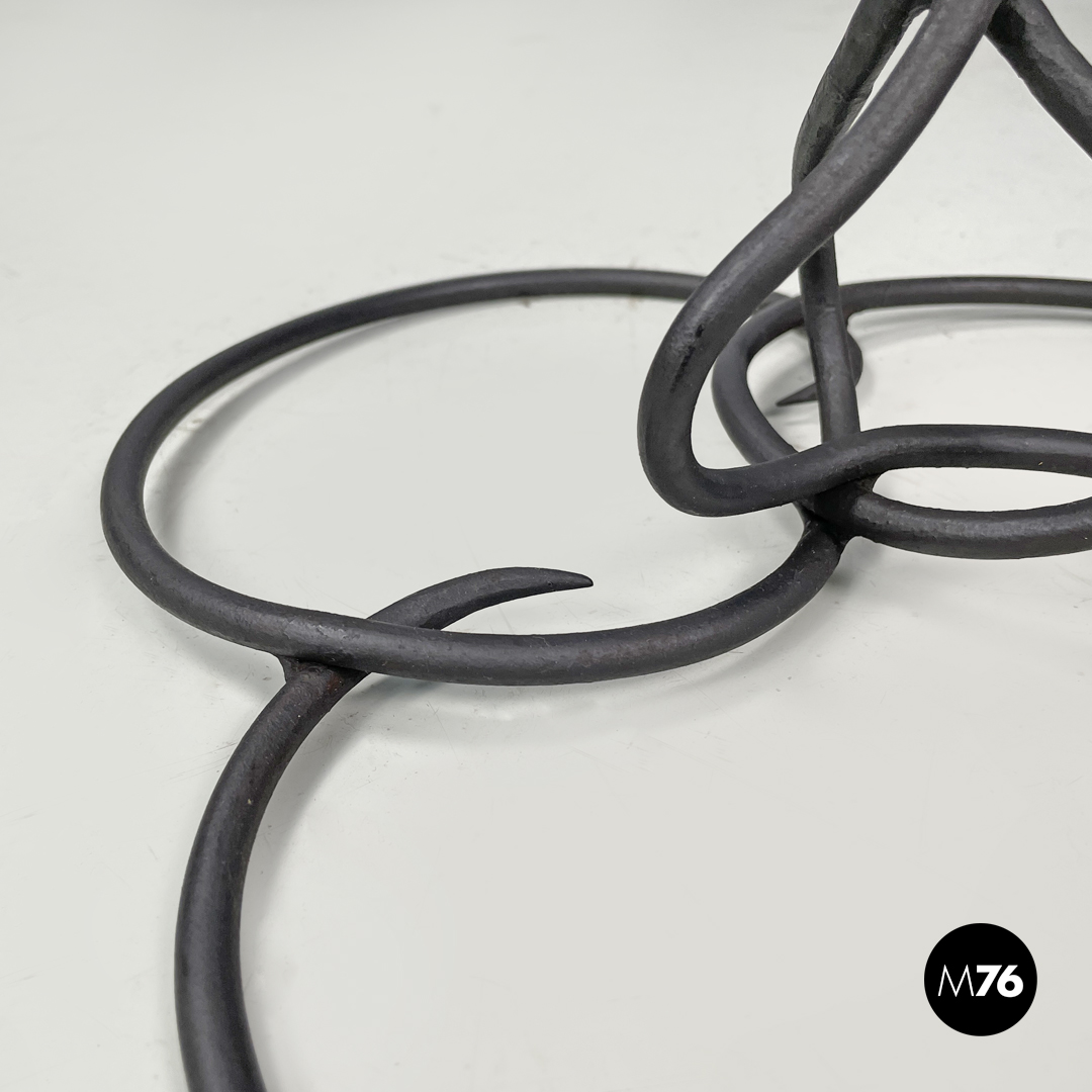 Tavolo da caffè a base tonda. La struttura è in tondino di ferro battuto verniciato nero con piano tondeggiante composto da tre “spicchi” smaltati di colore bianco giallo e grigio. Il tavolino ricorda la forma di un fiore infatti lo stelo e la base sono intrecciati con forme che richiamano il mondo naturale. Utilizzabile anche in ambiente esterno come un terrazzo o un giardino.