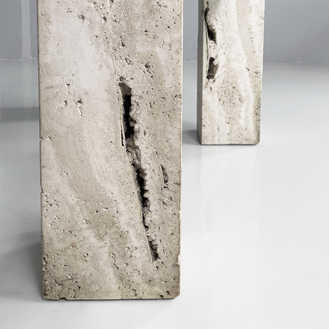 La struttura presenta quattro gambe a sezione quadrata in travertino nei quali si incastra il piano.