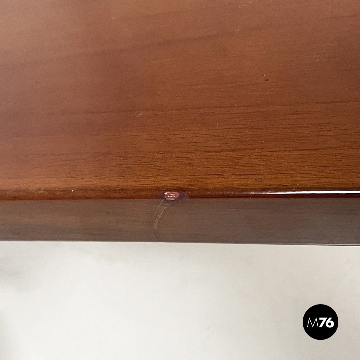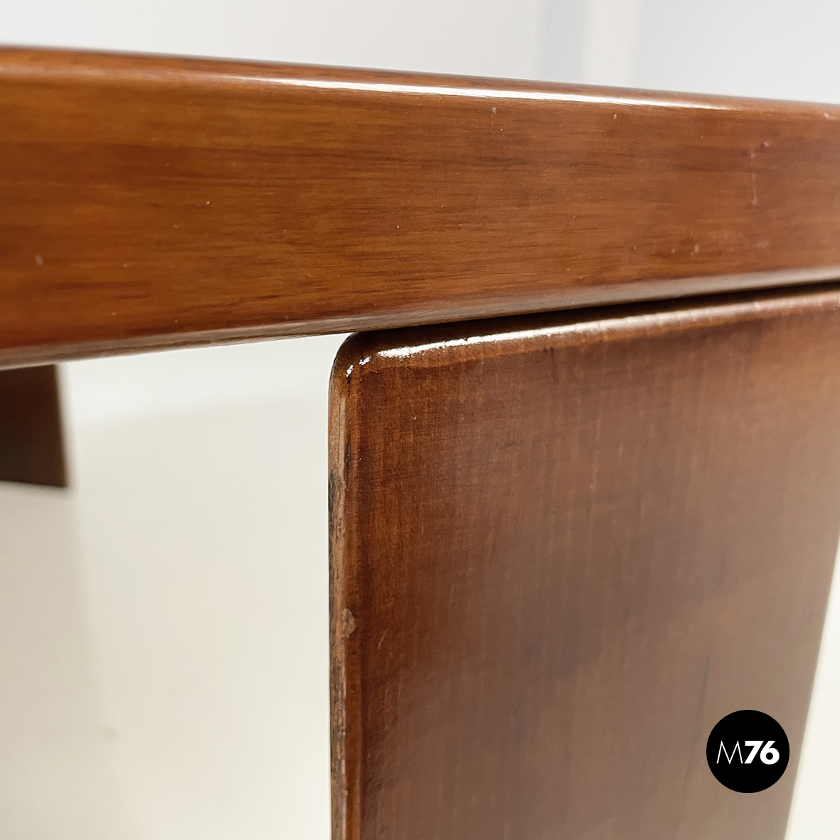 Tavolo da caffè con pianto quadrato in legno scuro. Le quattro zampe che sorreggono il piano sono a sezione triangolare anche esse in legno scuro.