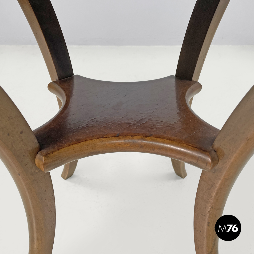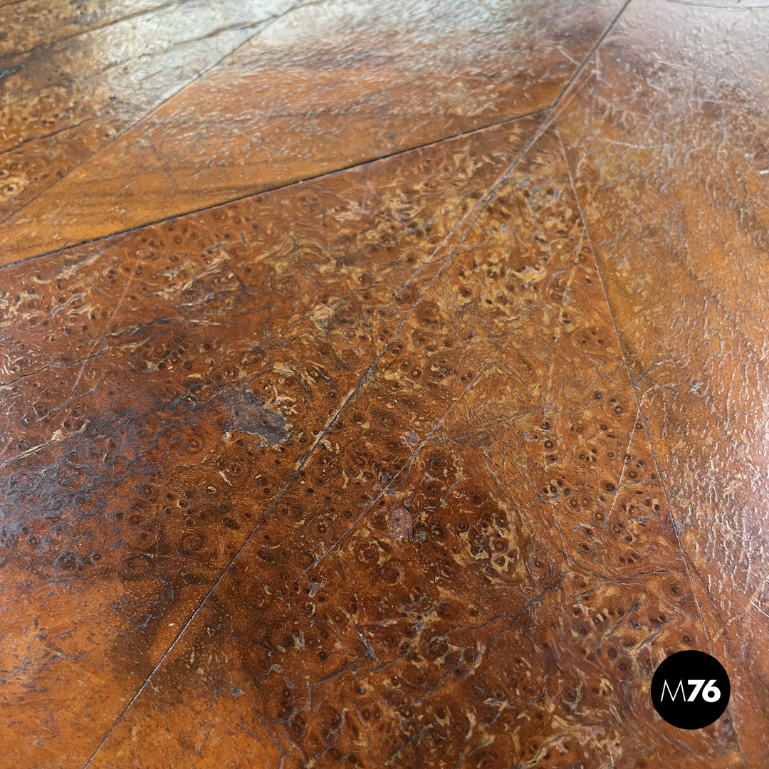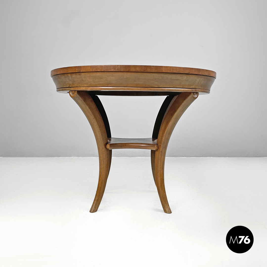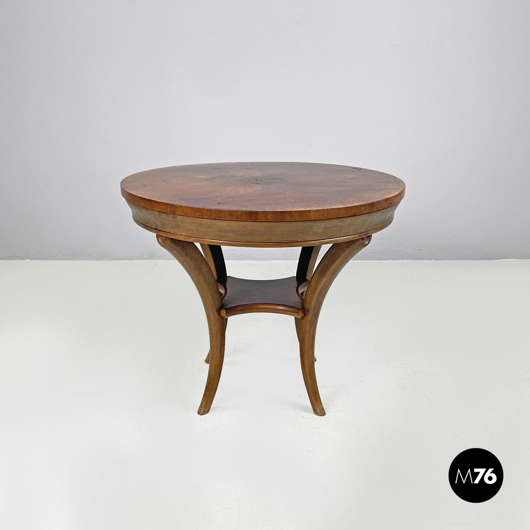Tavolo da caffè tondo interamente in legno. Il piano è decorato con intarsi geometrici che ricordano forma di una stella al centro la decorazione è tonda e di un legno più scuro tendente al grigio e al verde scuro. Le quattro gambe presentano un profilo stondato e seguono una linea curva dal piano si stringono verso il centro per poi allargarsi all’appoggio a terra con una mensola al centro.