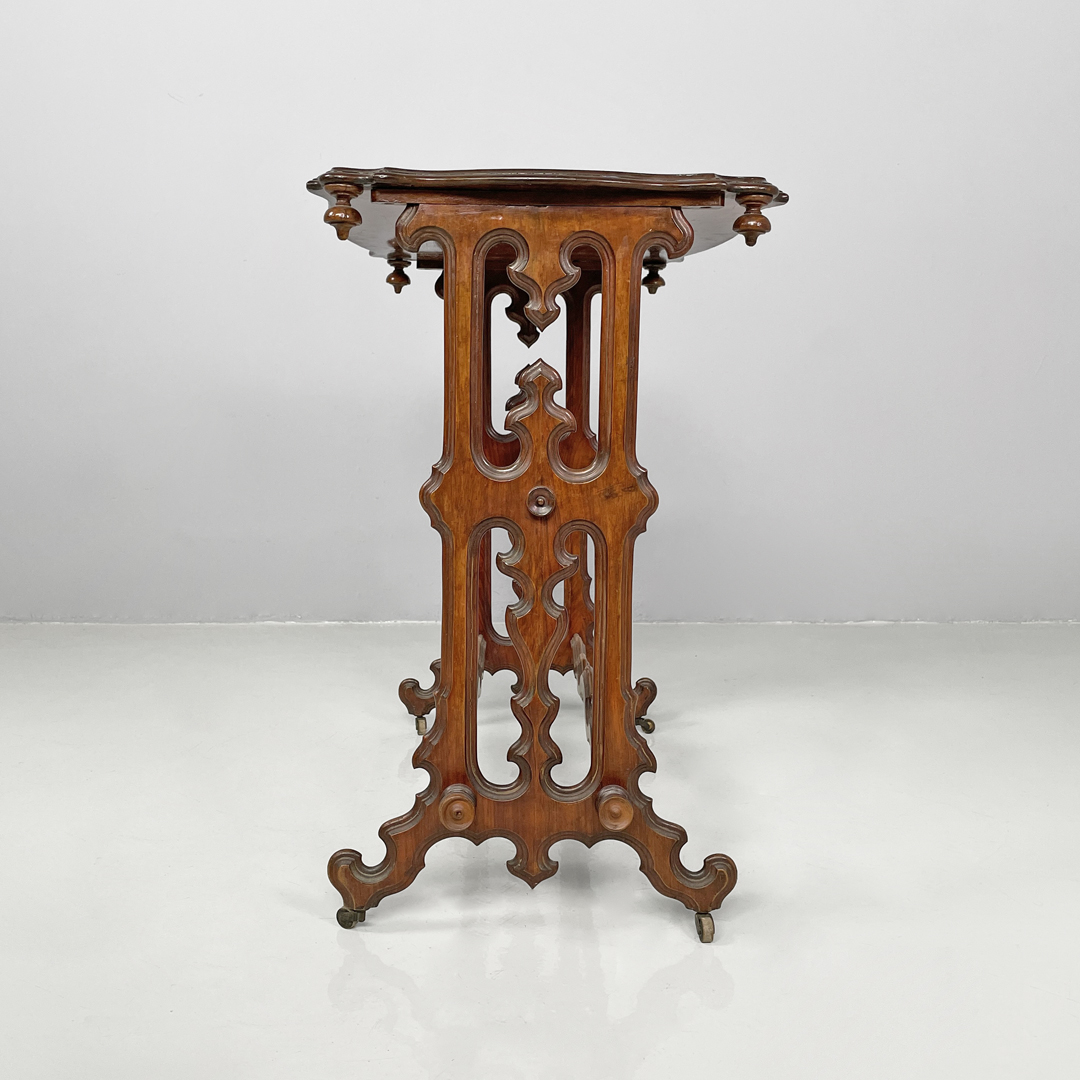 Tavolo da caffè di forma rettangolare interamente in legno finemente lavorato. Il piano presenta una decorazione centrale ovale. Le gambe con profili decorati seguono linee tondeggianti e curve, le gambe sono unite da tre travi, anch’esse decorate con lo stesso motivo. I piedini sono dotati di ruote.