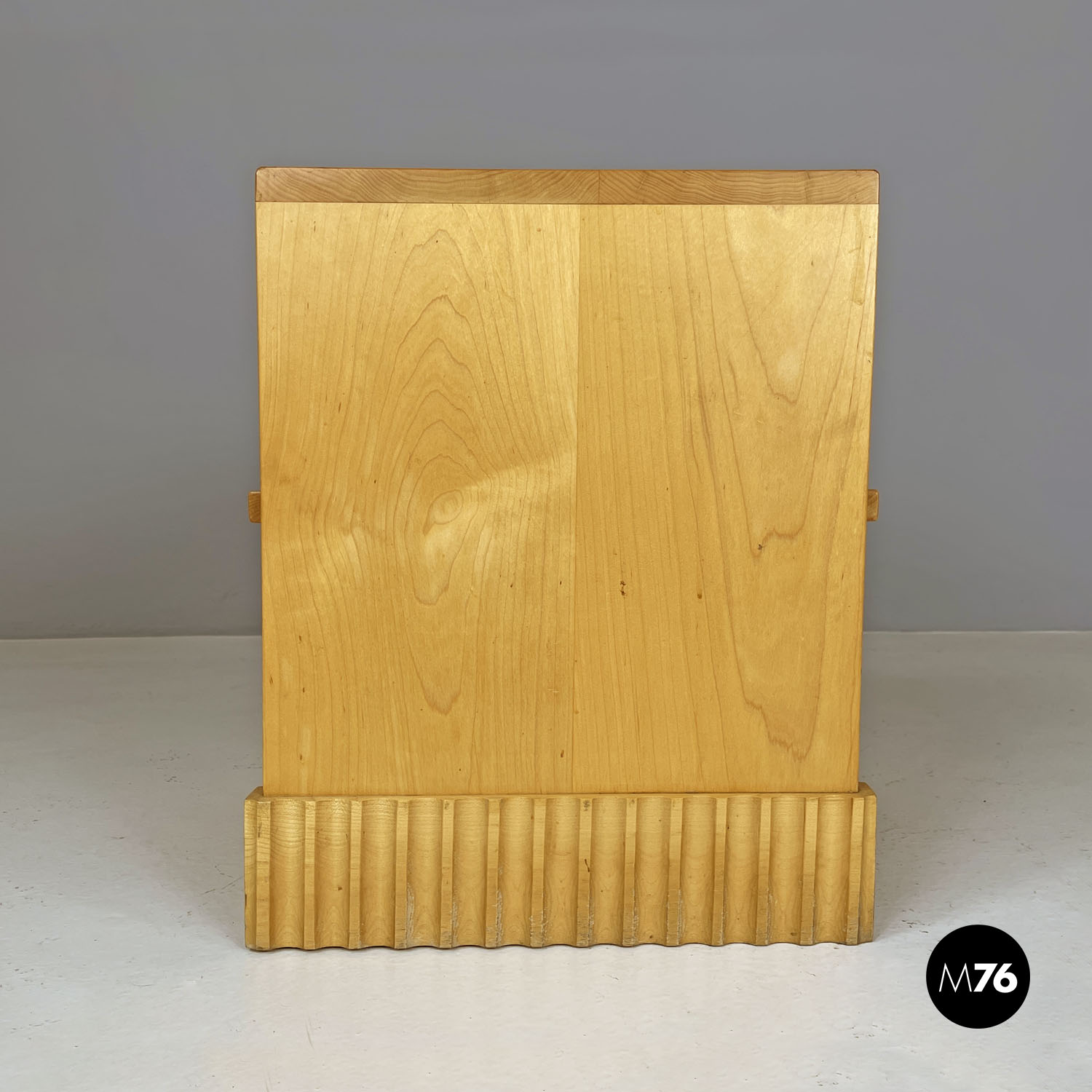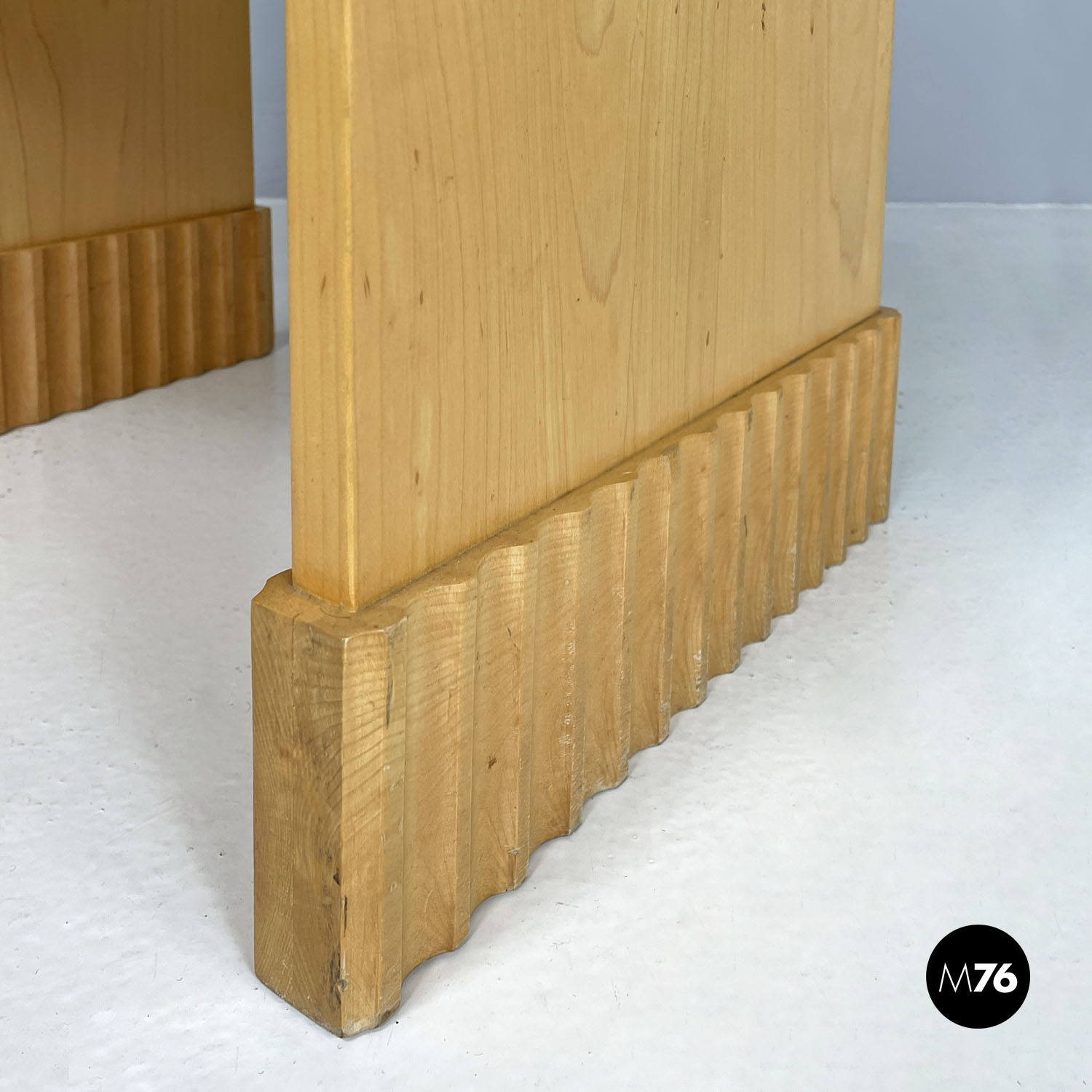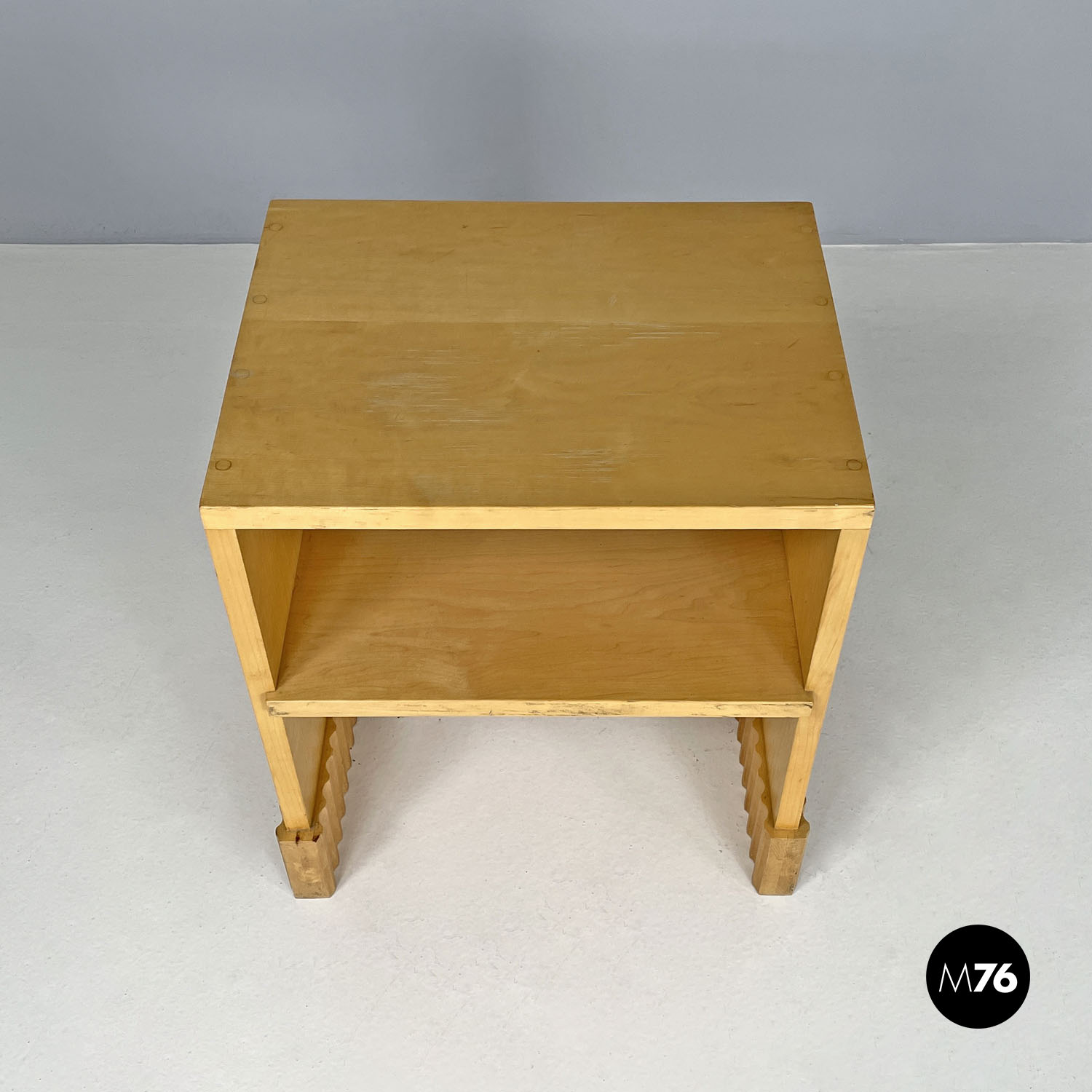 Tavolo da caffè con piano rettangolare in legno. Presenta una mensola nella parte centrale della struttura. Le due gambe della stessa lunghezza del piano e della struttura terminano all’appoggio a terra con una decorazione geometrica tondeggiante. Utilizzabile anche come comodino.