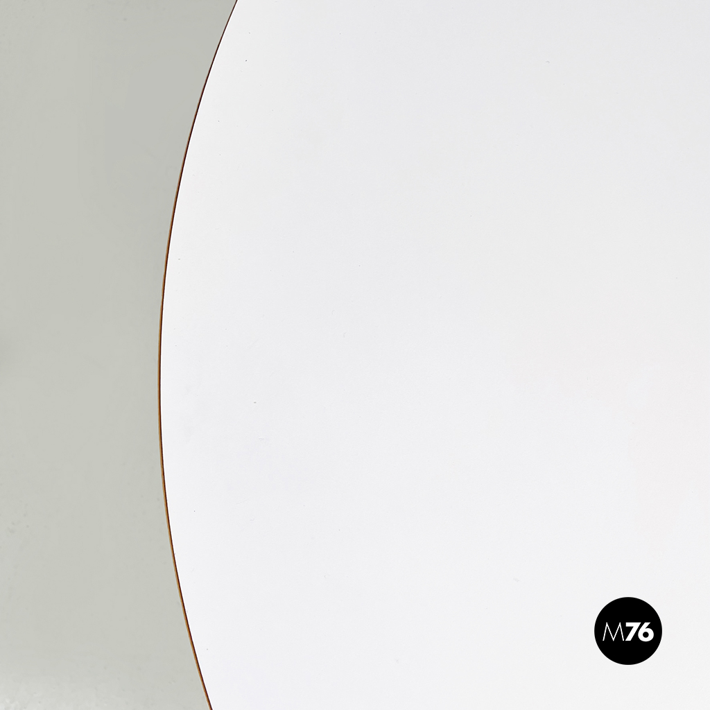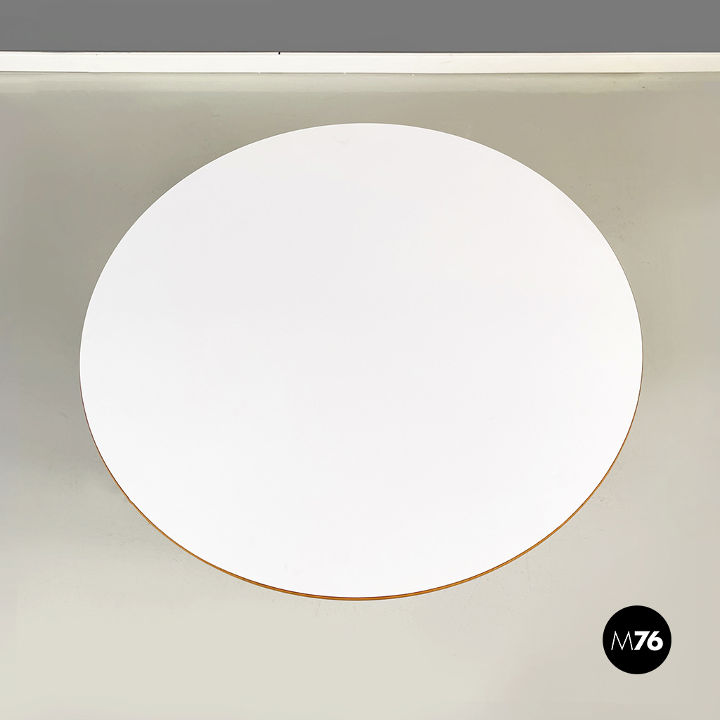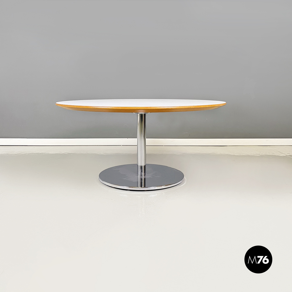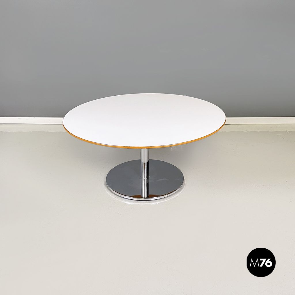Tavolo da caffè con piano tondo in legno con superficie in legno mdf bianco. La struttura a sezione tonda è in metallo. Base tonda in metallo.