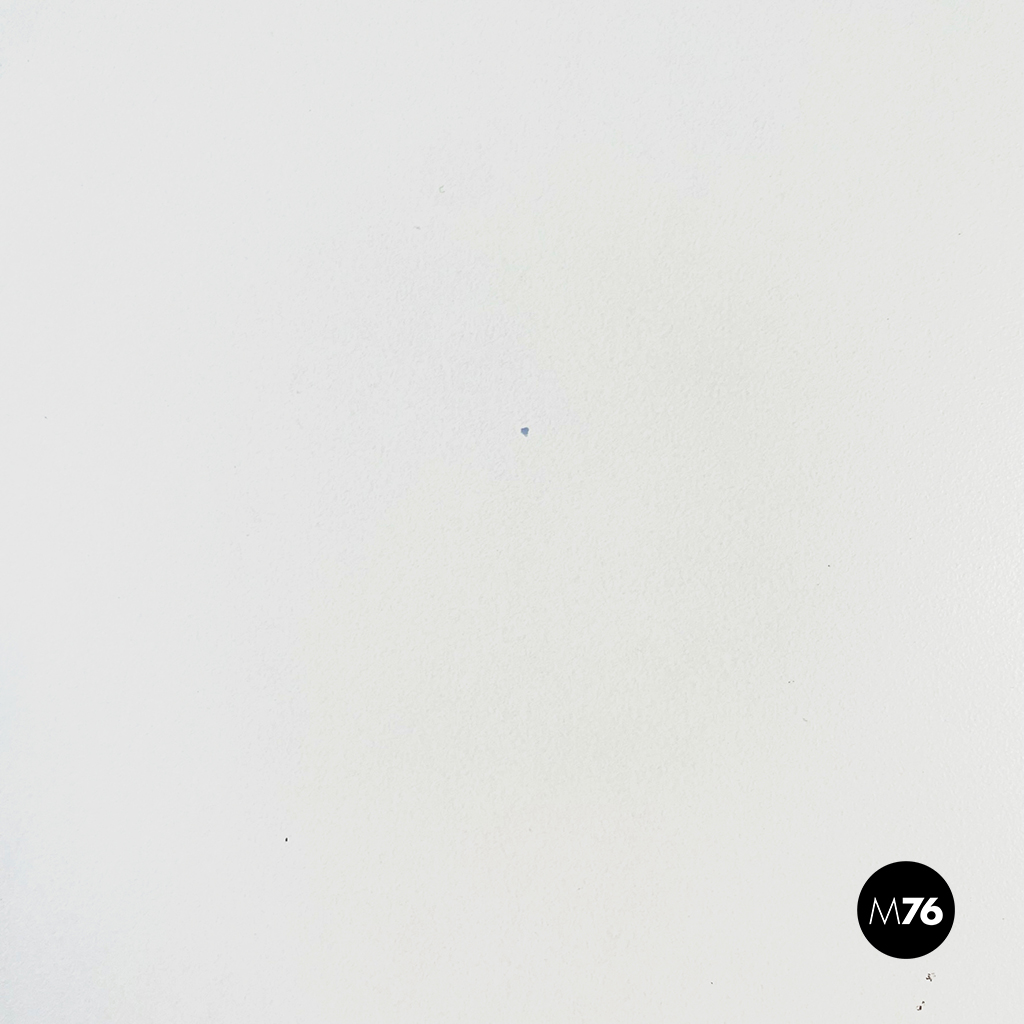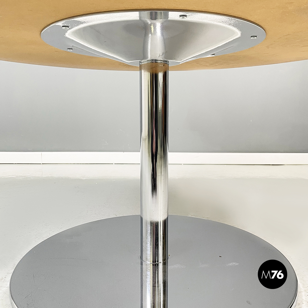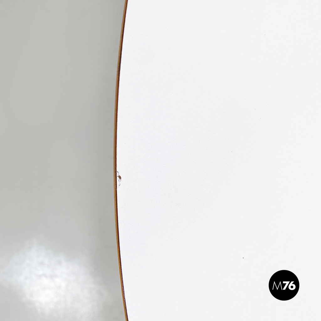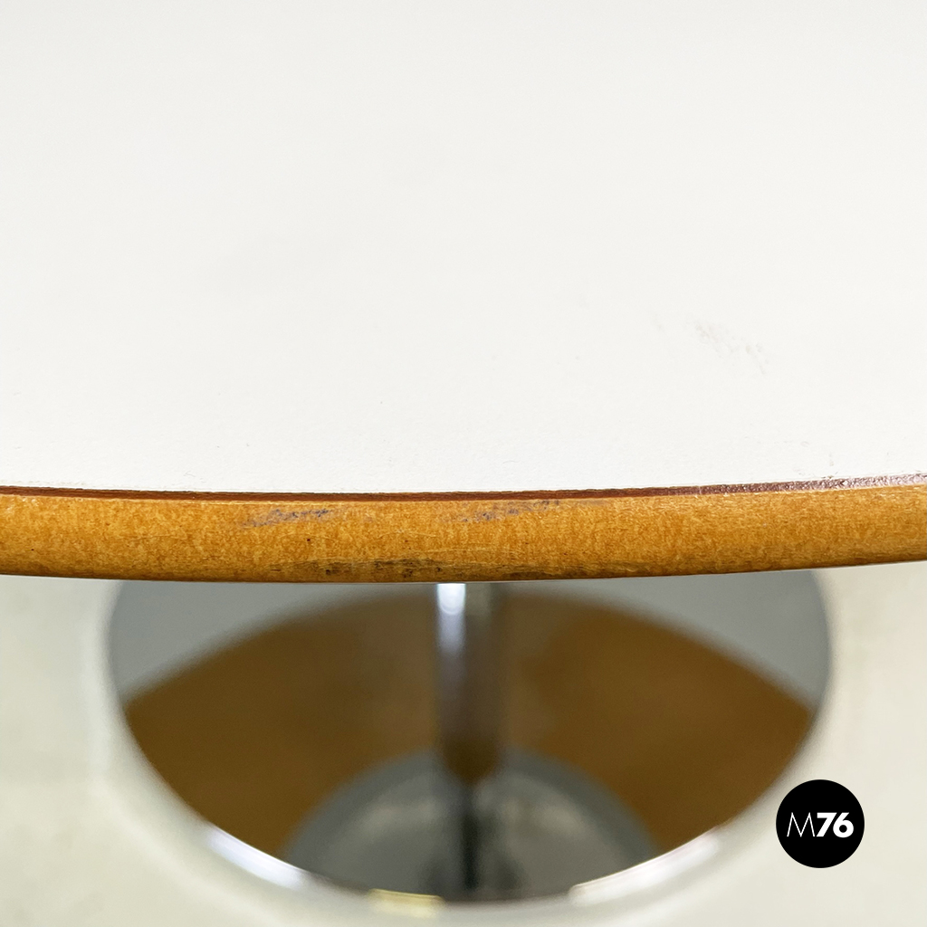 Tavolo da caffè con piano tondo in legno con superficie in legno mdf bianco. La struttura a sezione tonda è in metallo. Base tonda in metallo.
