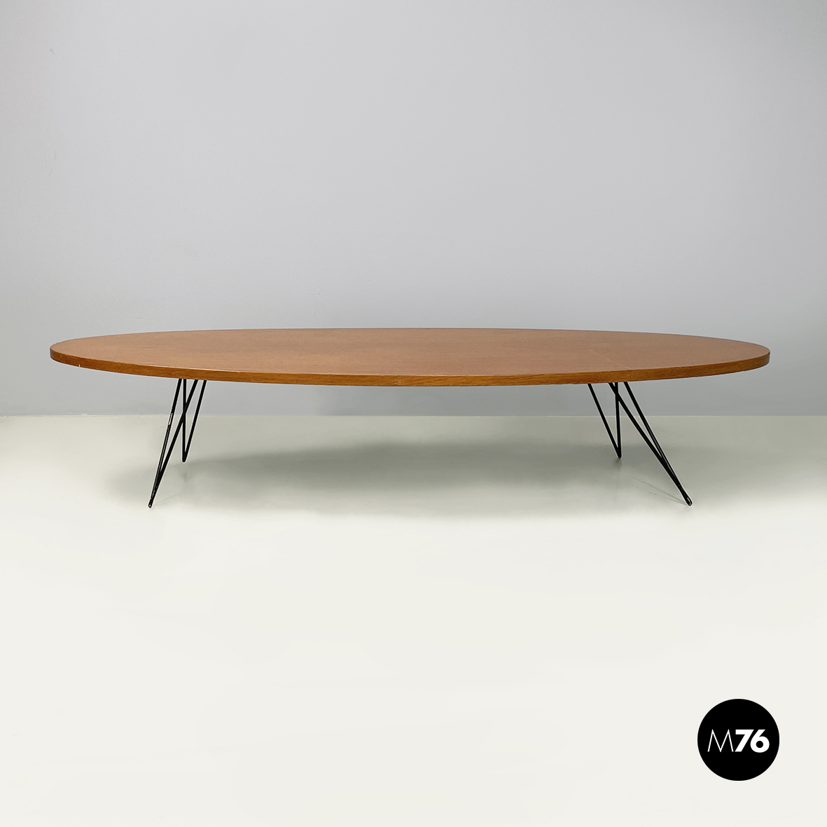 Tavolo da caffè con piano ovale in legno. Le zampe a V sono in tondino di metallo verniciato nero.