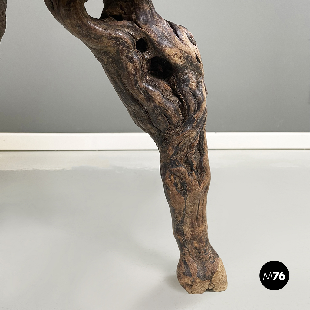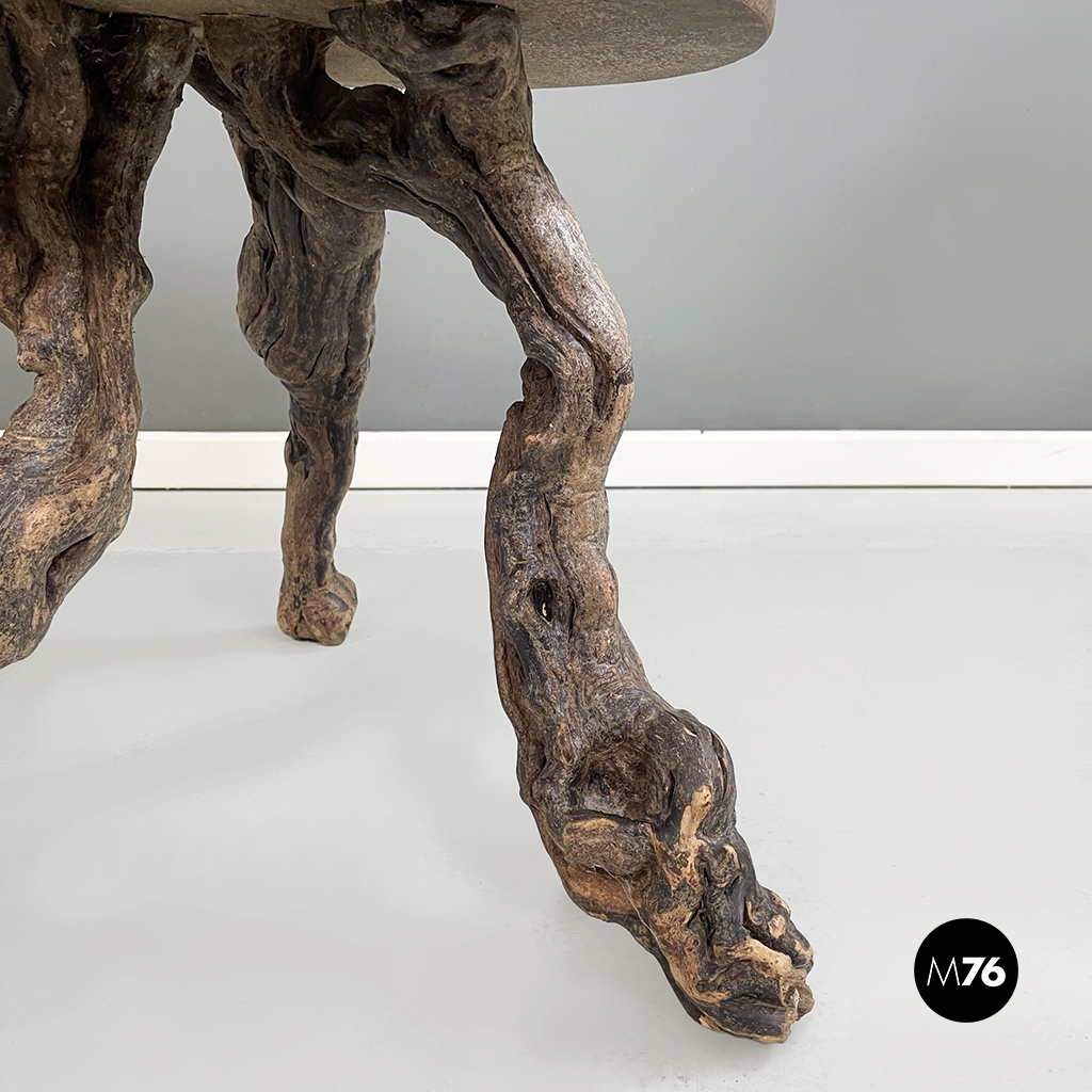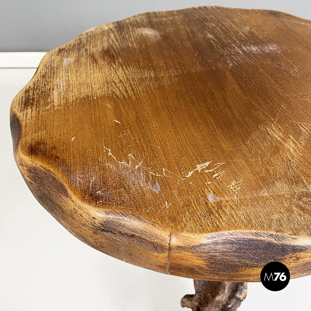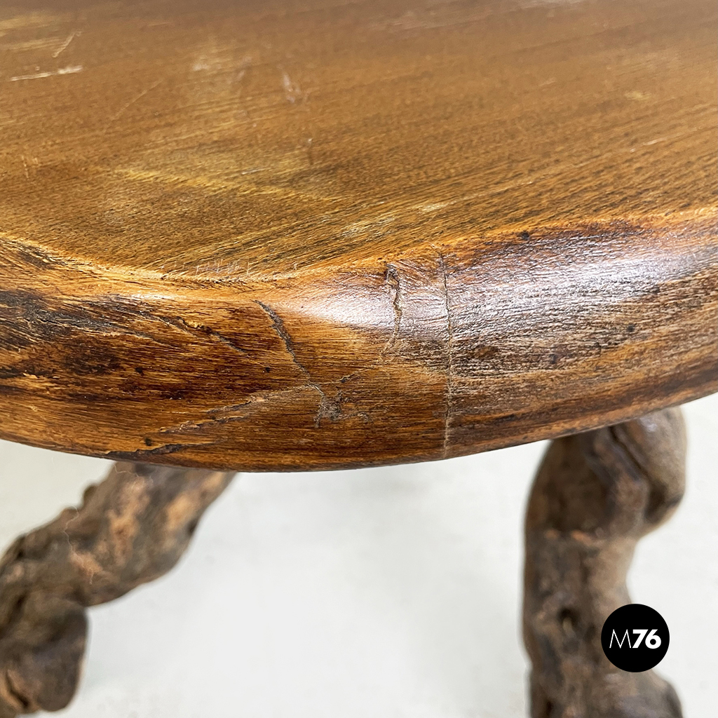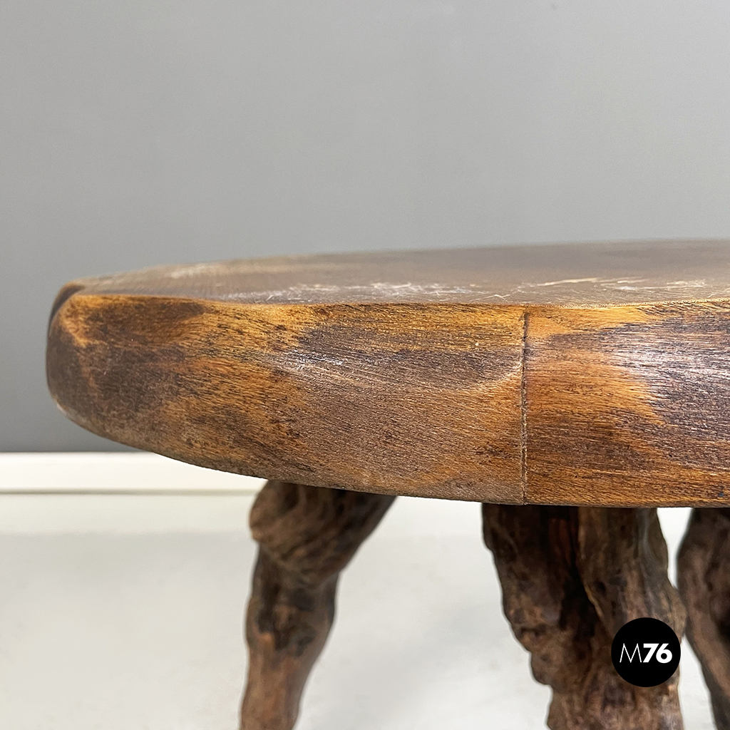 Tavolo da caffè rustico con piano tondo con profilo ondulato in legno. Le tre zampe sono rami grossi e nodosi. Appartenente al design organico. Può essere utilizzato anche come sgabello.
