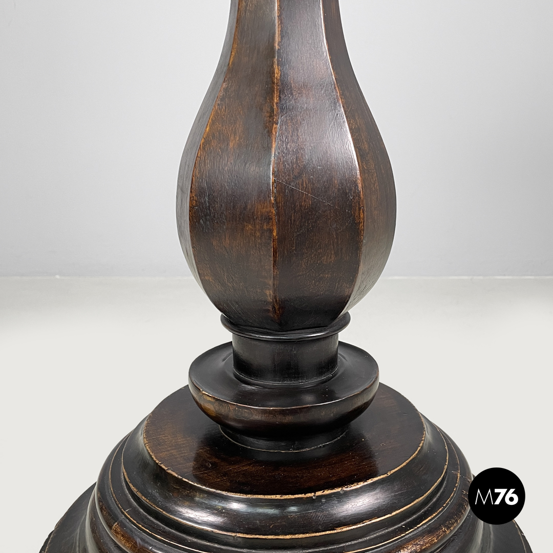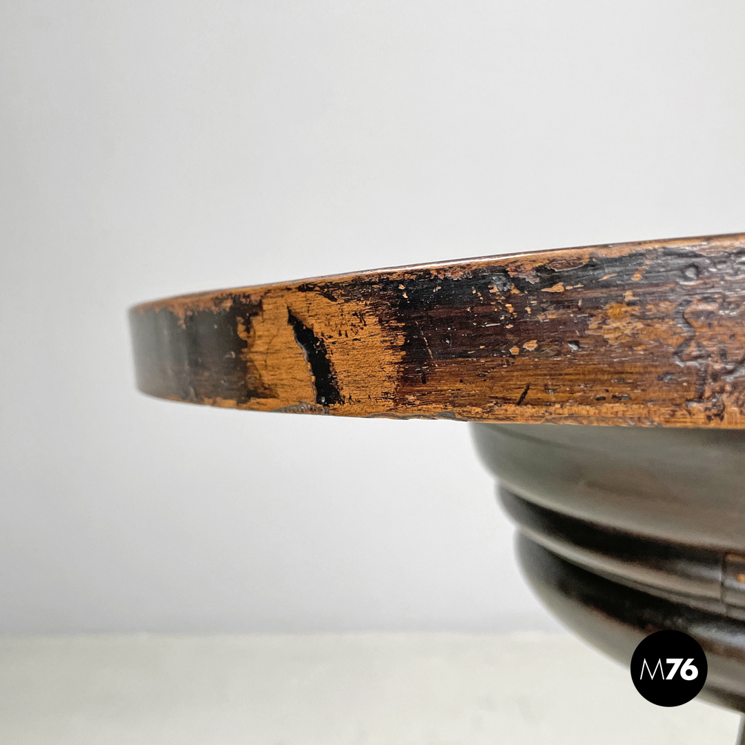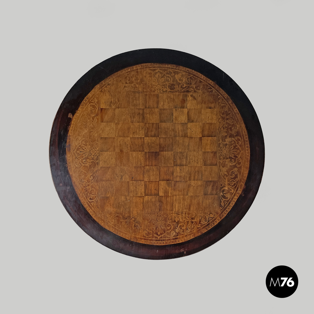 Tavolo da caffè o da servizio tondo in legno. Il piano è decorato con una scacchiera ai quattro lati invece con ghirigori floreali. Lo stelo centrale è a sezione tonda e segue linee curve nella parte bassa si allarga a formare una base tonda tornita. I quattro piedini sono a forma di zampa di leone.