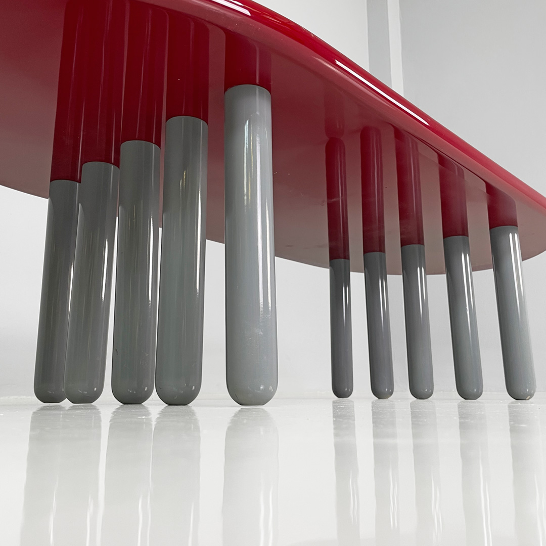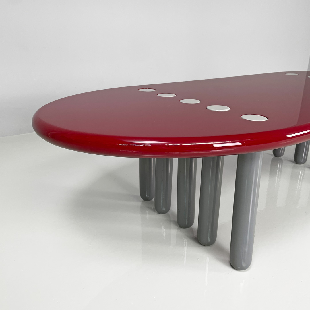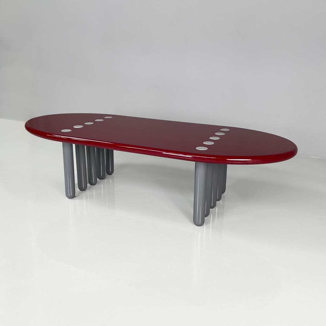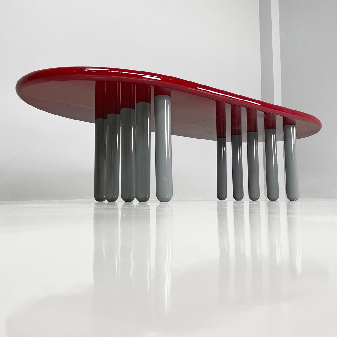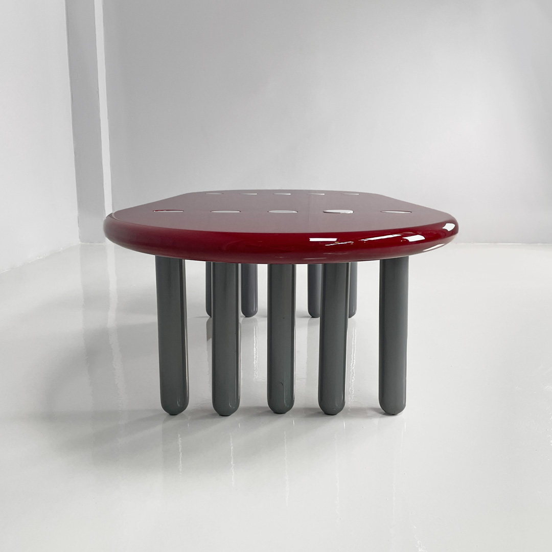 Tavolo da caffè interamente in legno laccato lucido bordeaux con dieci gambe grigie.