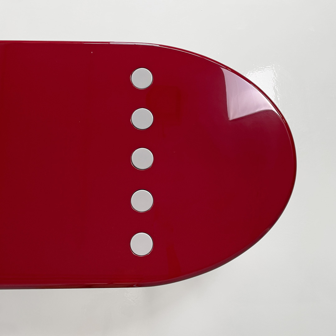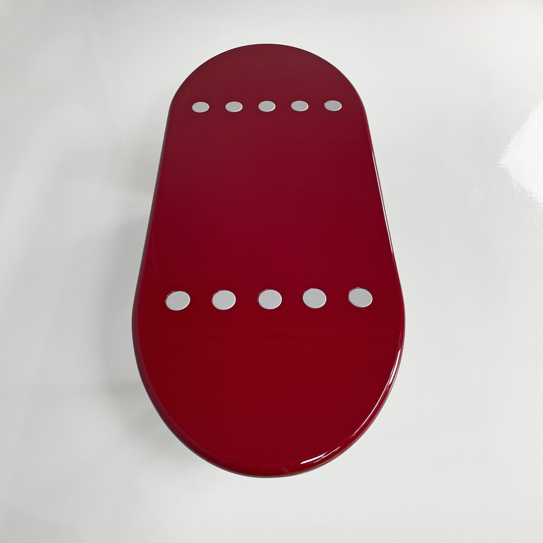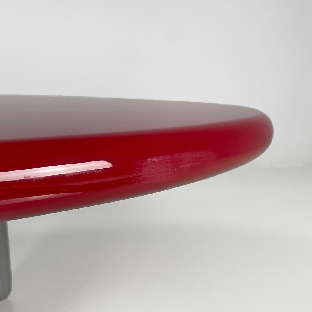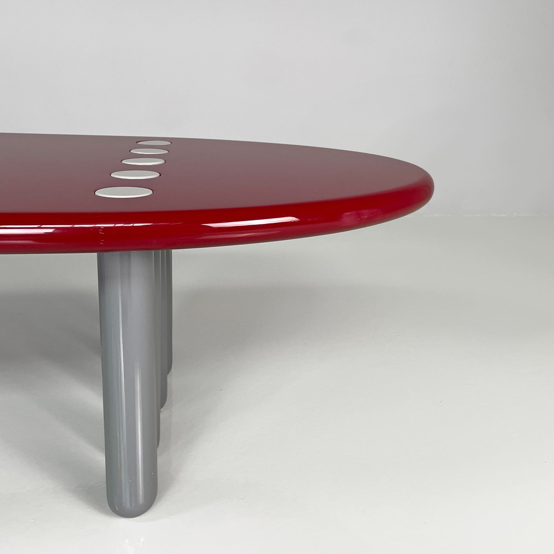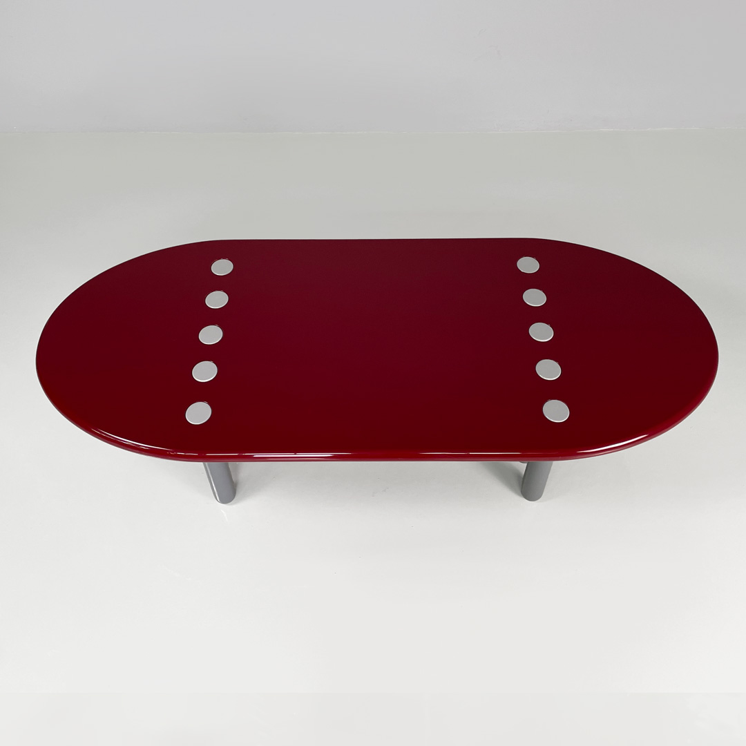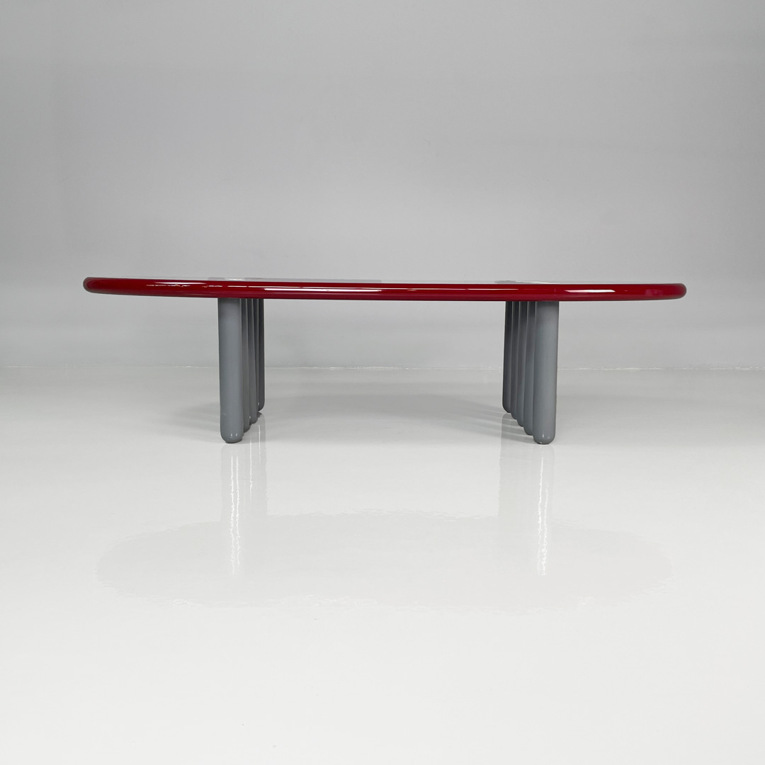 Tavolo da caffè interamente in legno laccato lucido bordeaux con dieci gambe grigie.