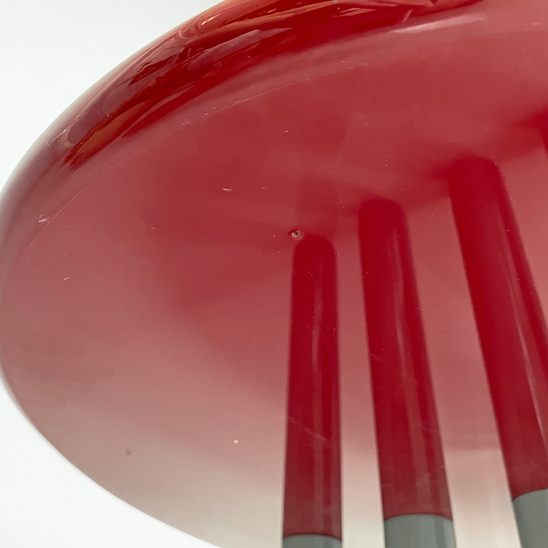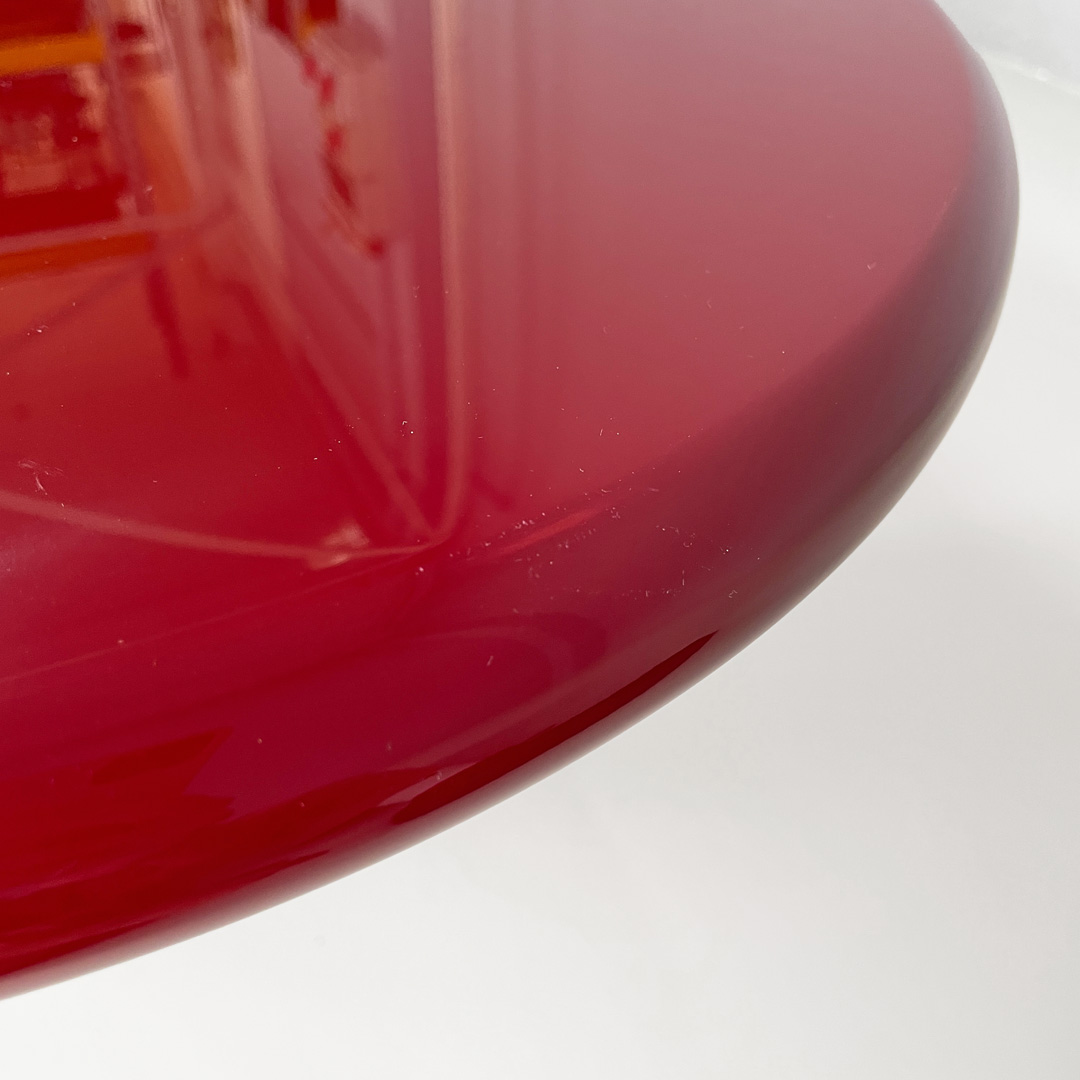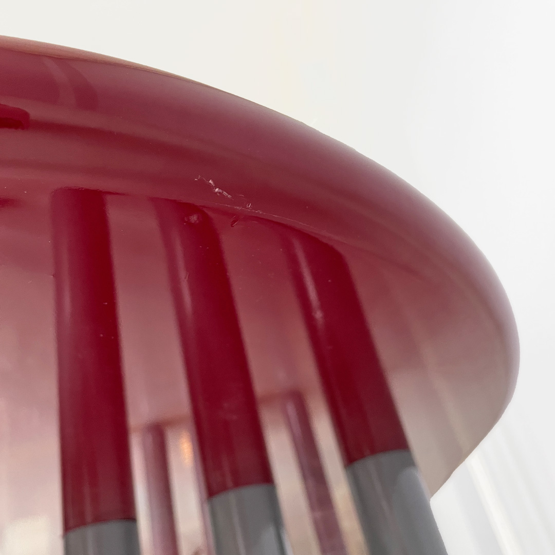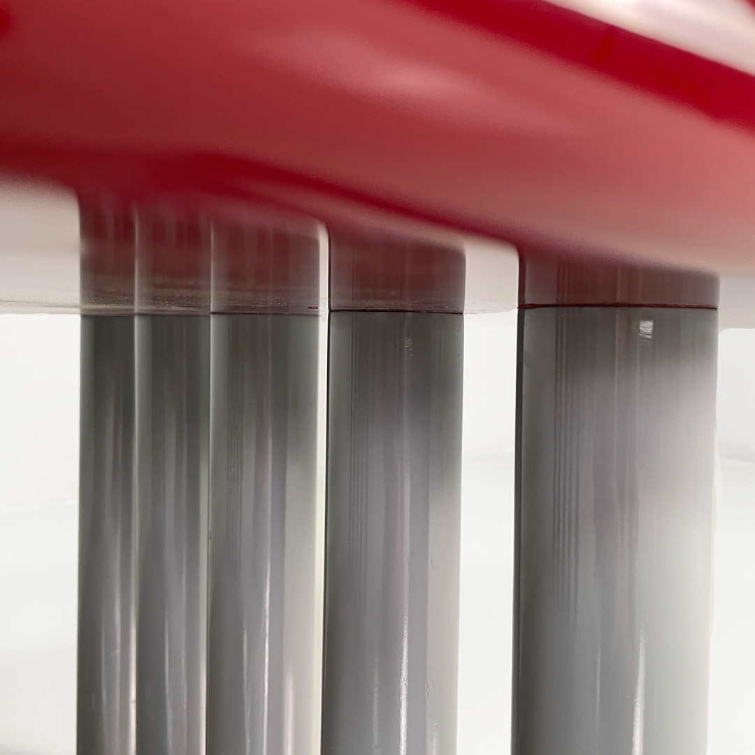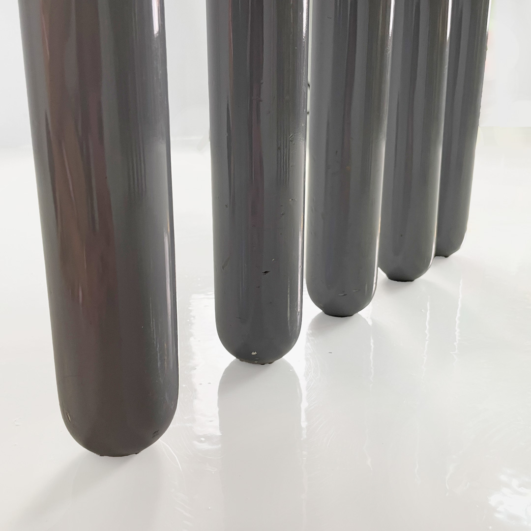 Tavolo da caffè interamente in legno laccato lucido bordeaux con dieci gambe grigie.