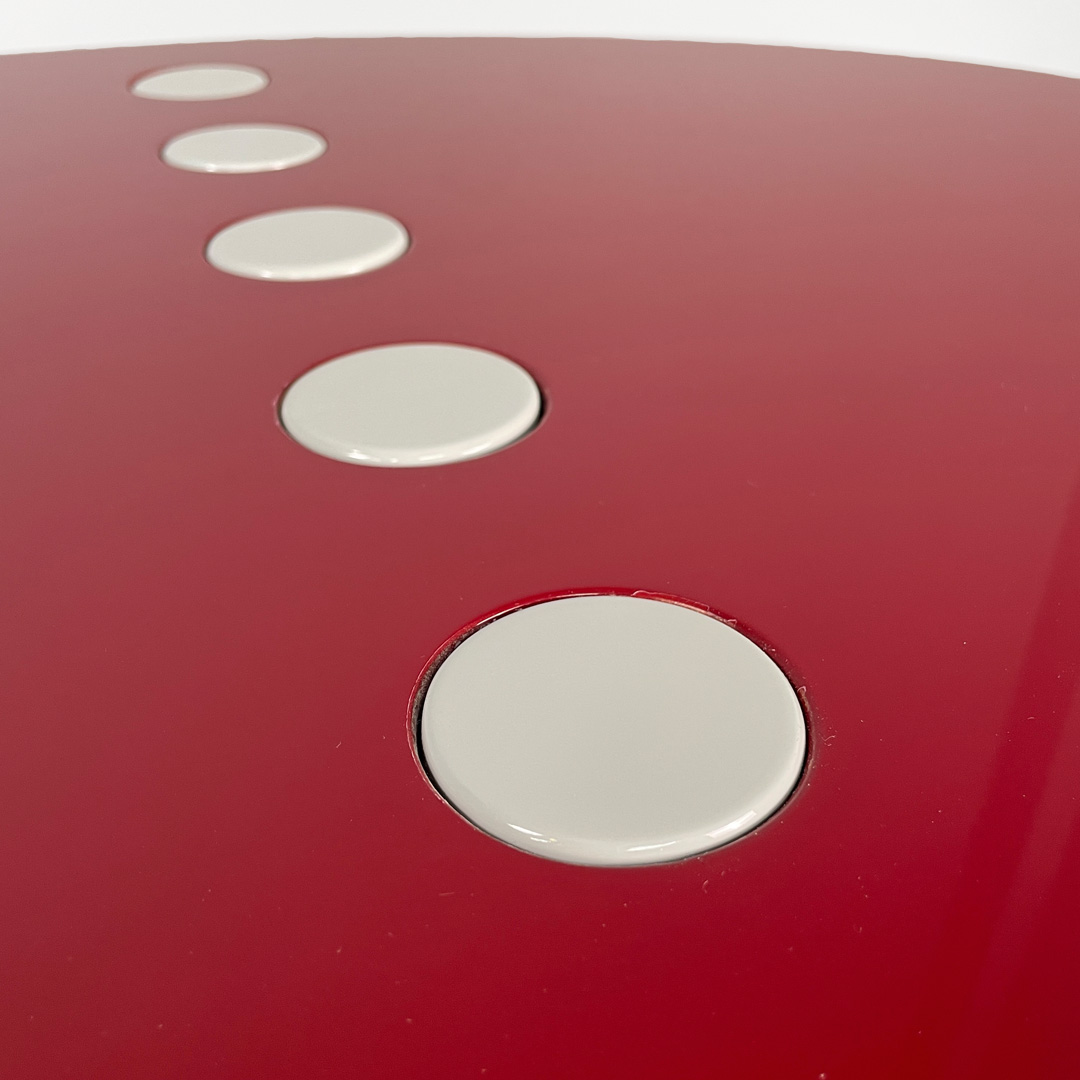 Il piano è ovale e presenta dei tondi bianchi in corrispondenza delle gambe a sezione tonda.