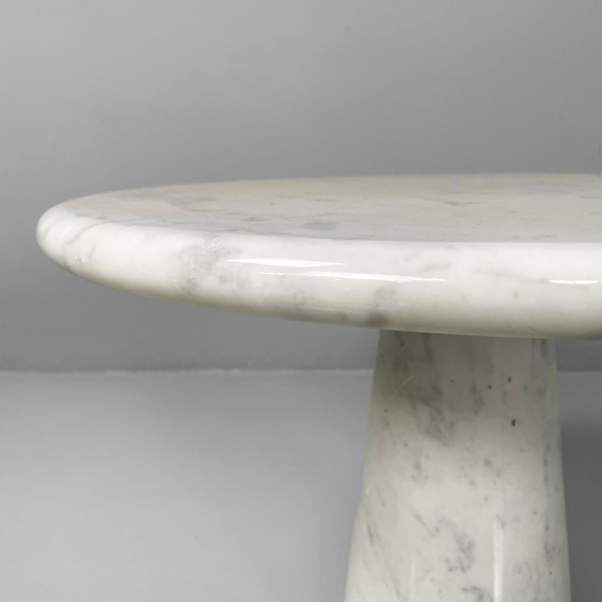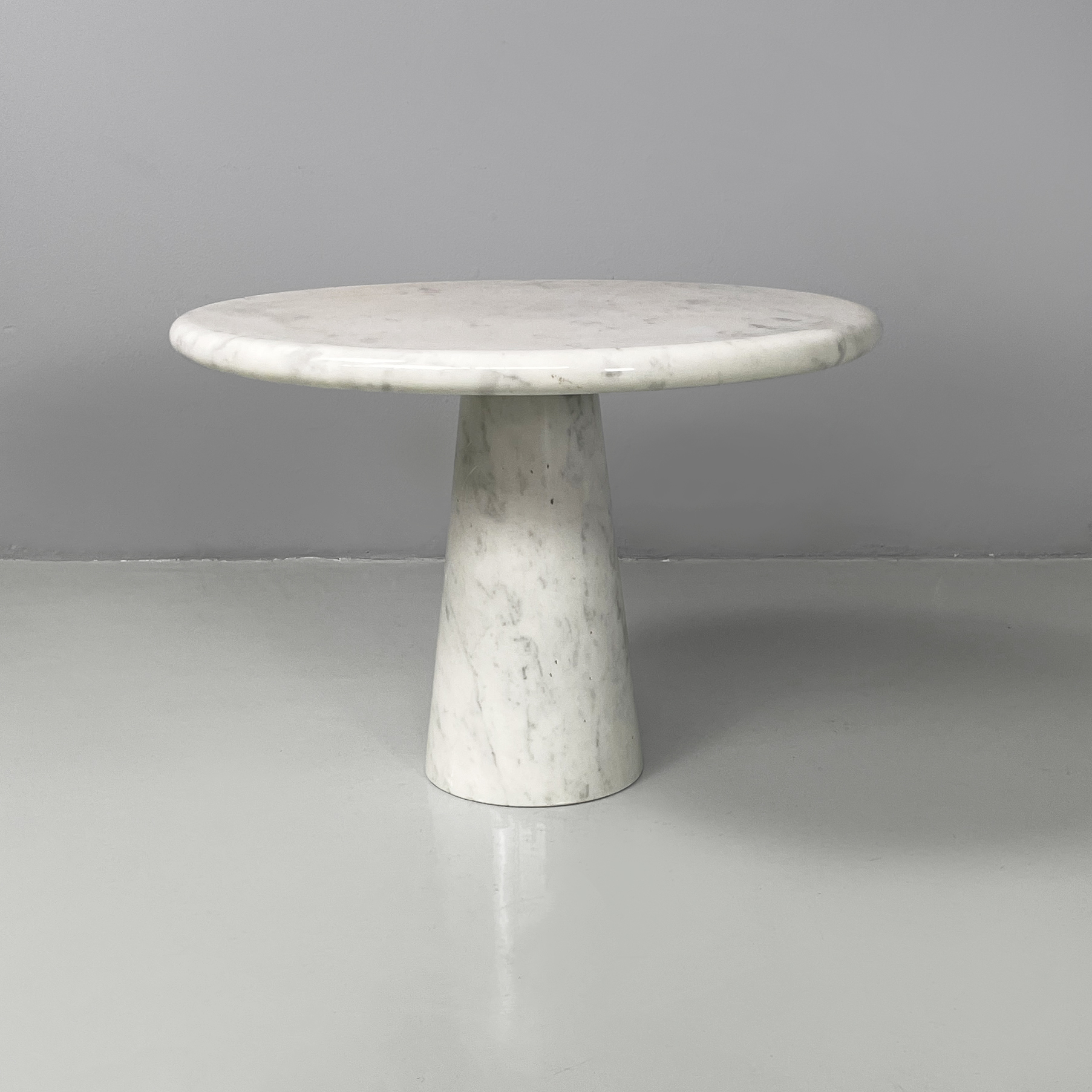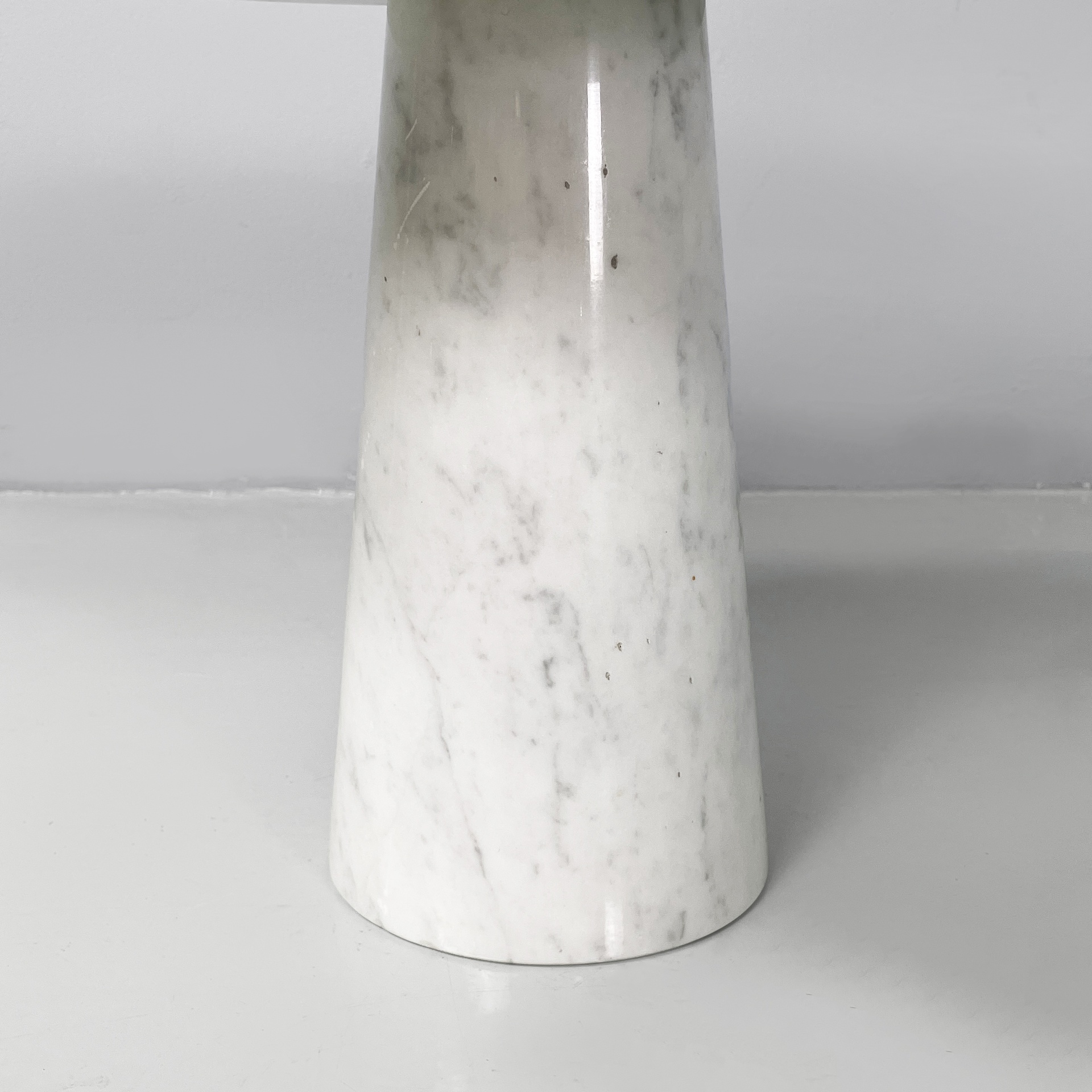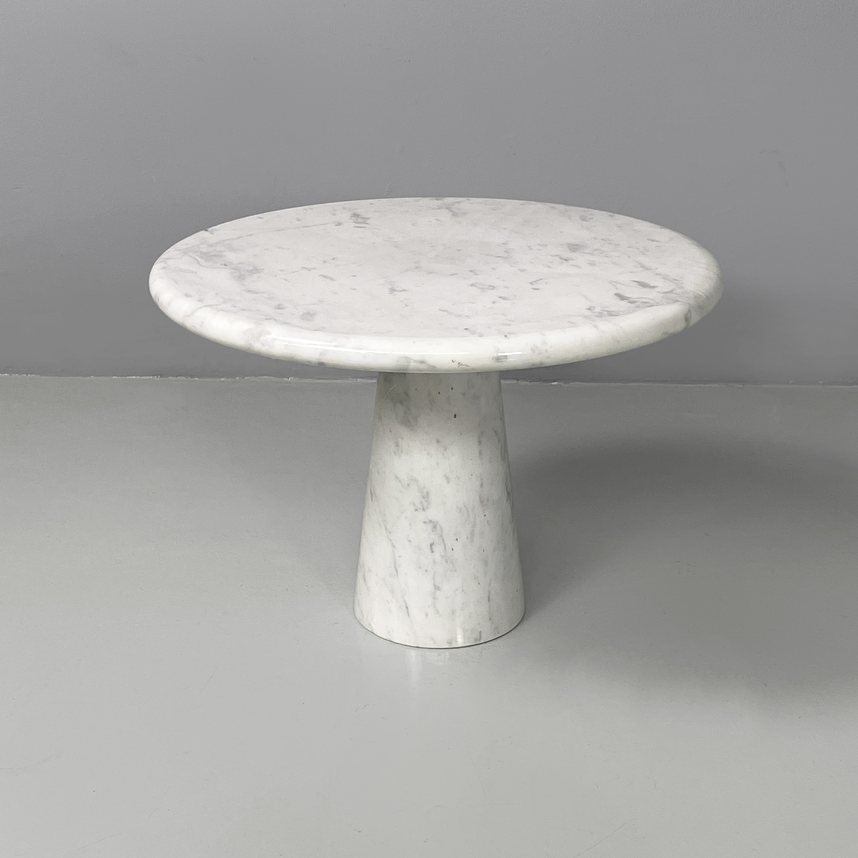 Tavolo da caffè interamente in marmo. Il piano tondo con bordi arrotondati è poggiato su una base conica.