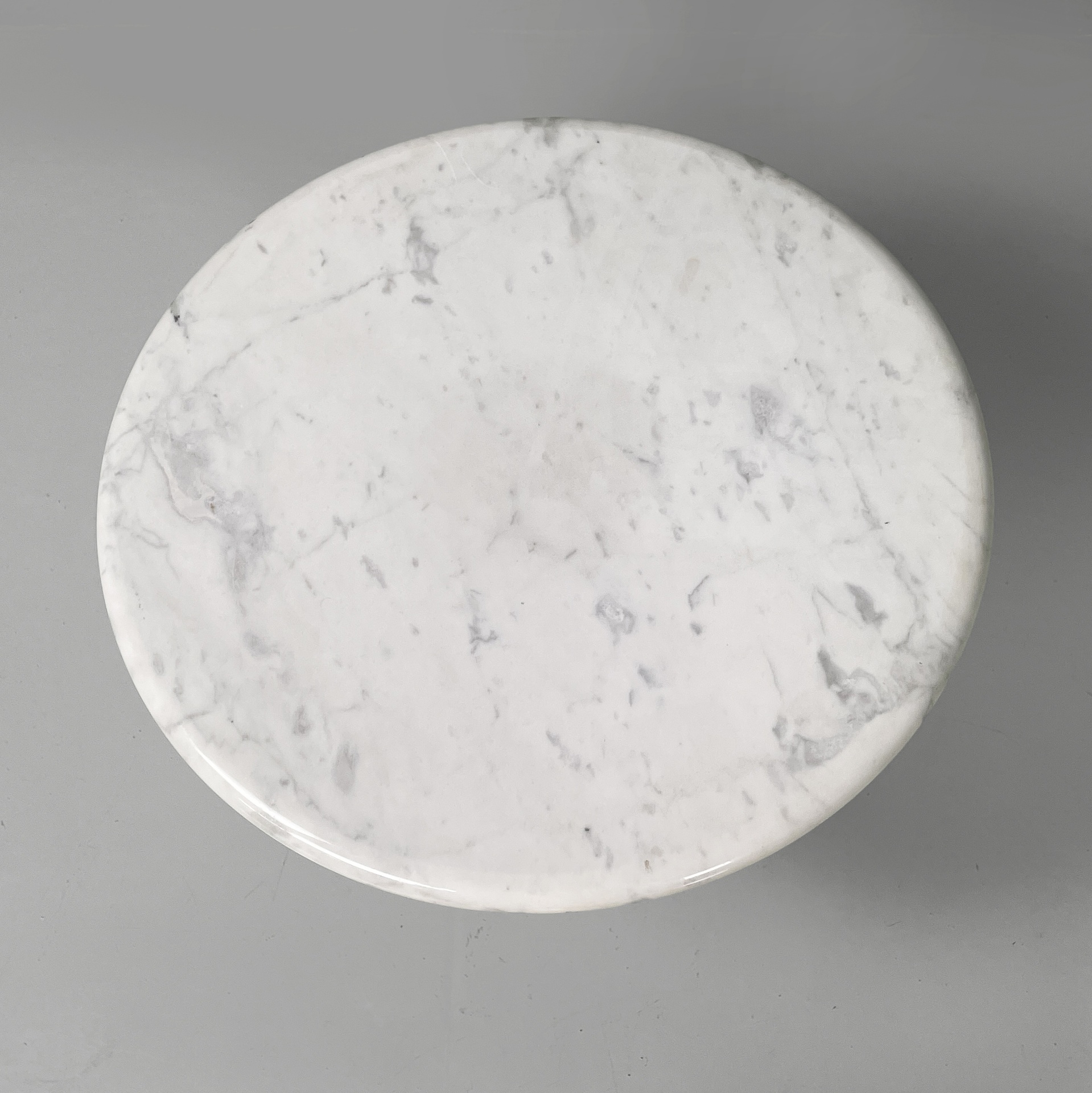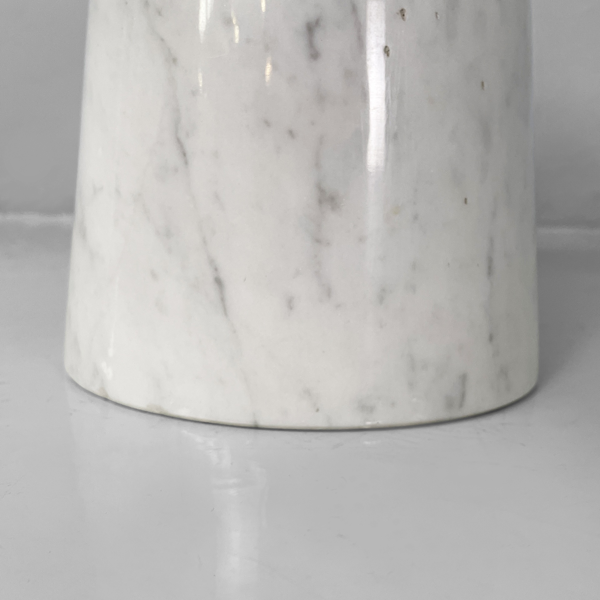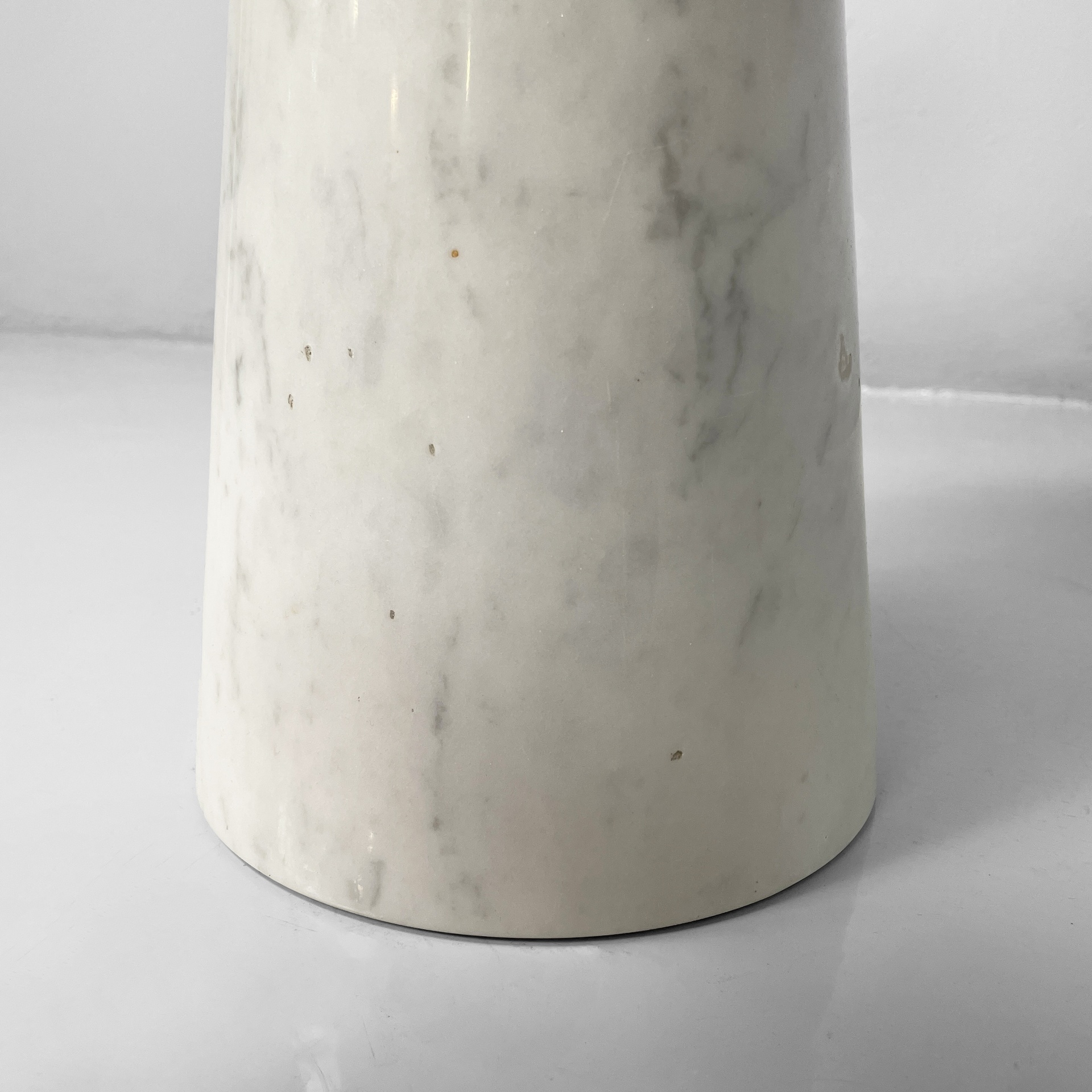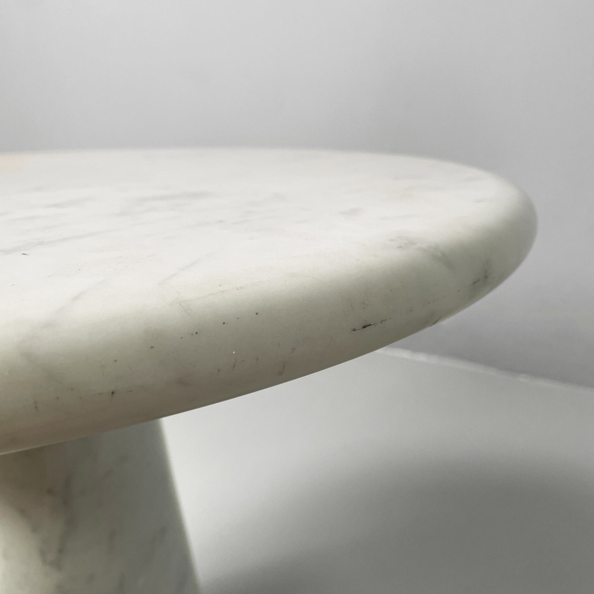 Tavolo da caffè interamente in marmo. Il piano tondo con bordi arrotondati è poggiato su una base conica.