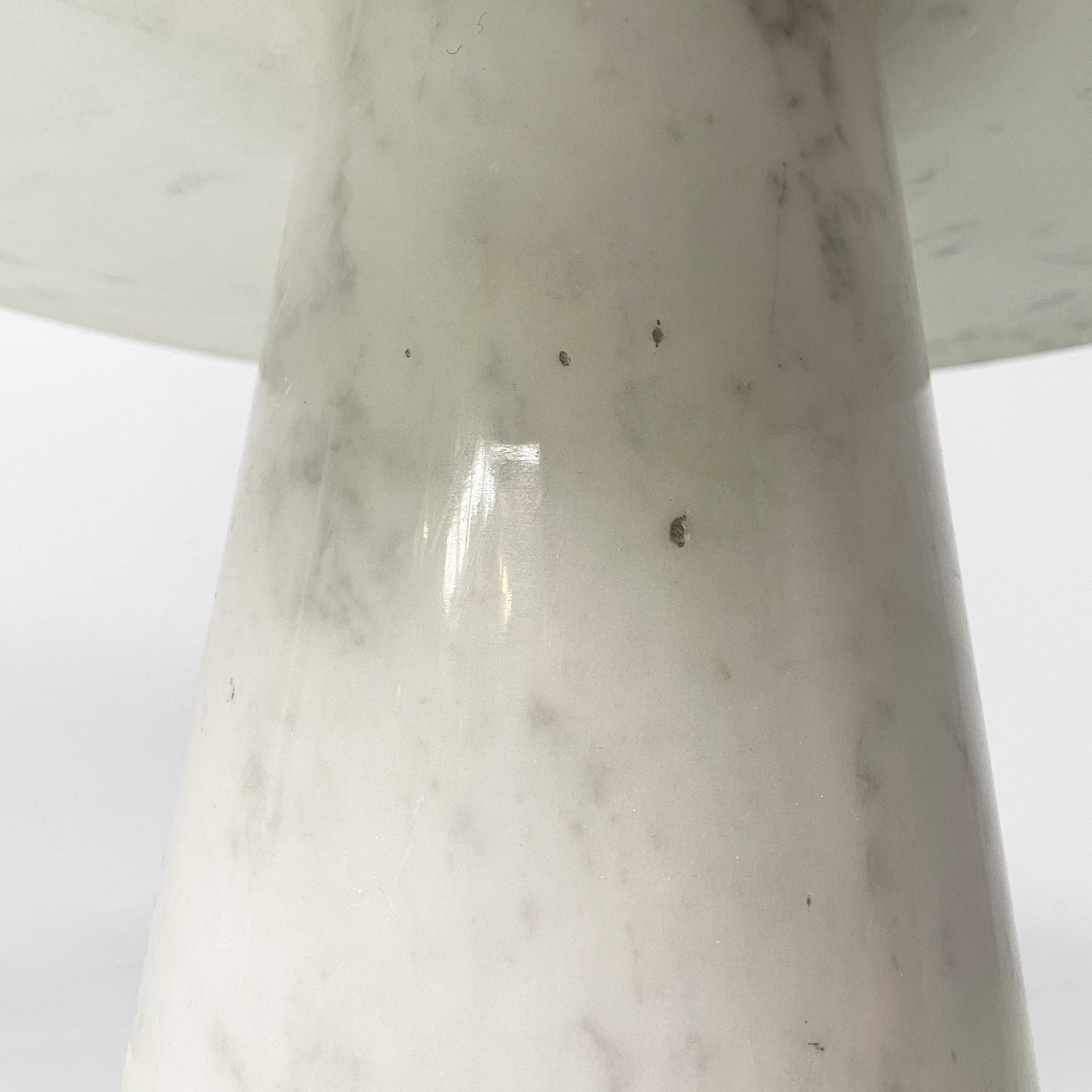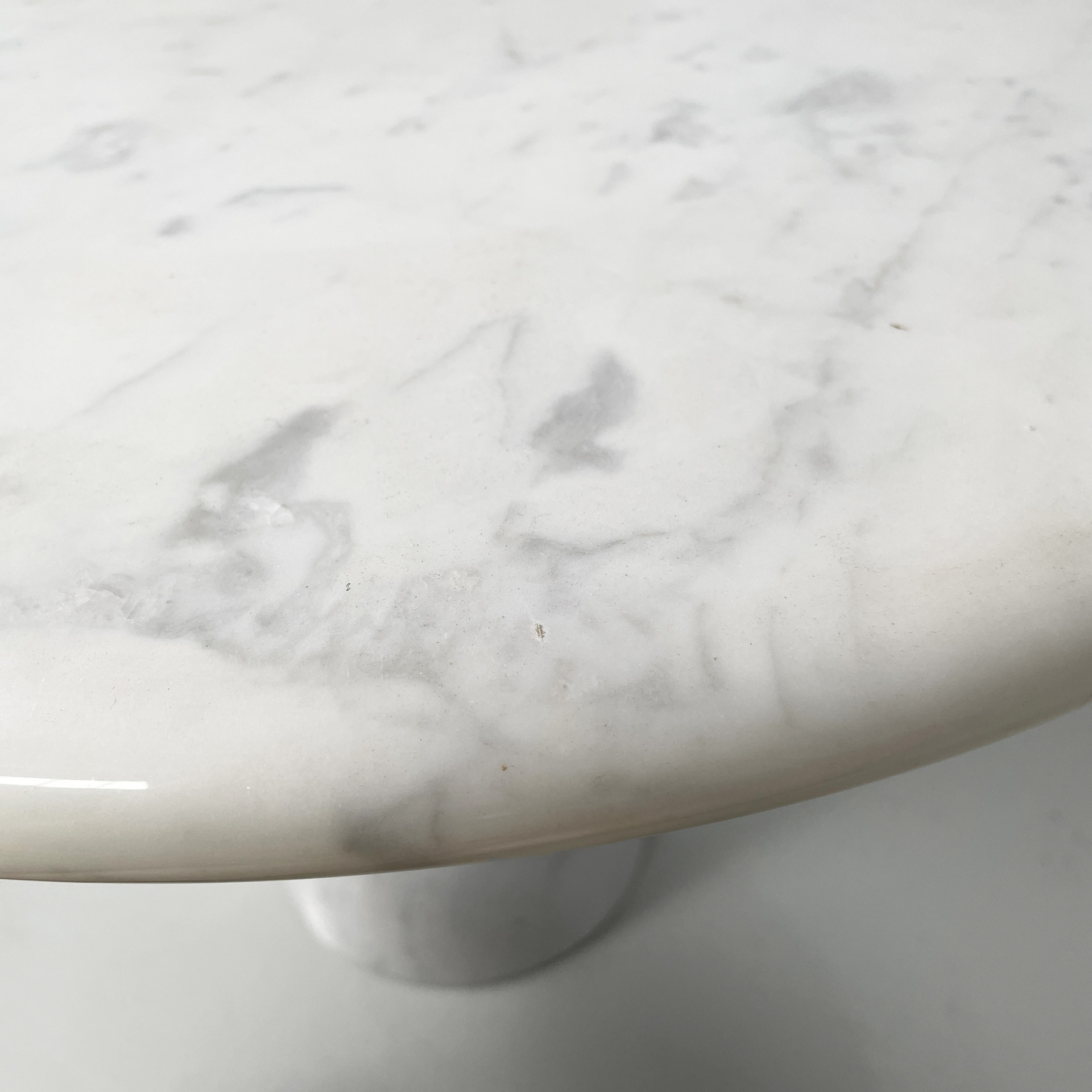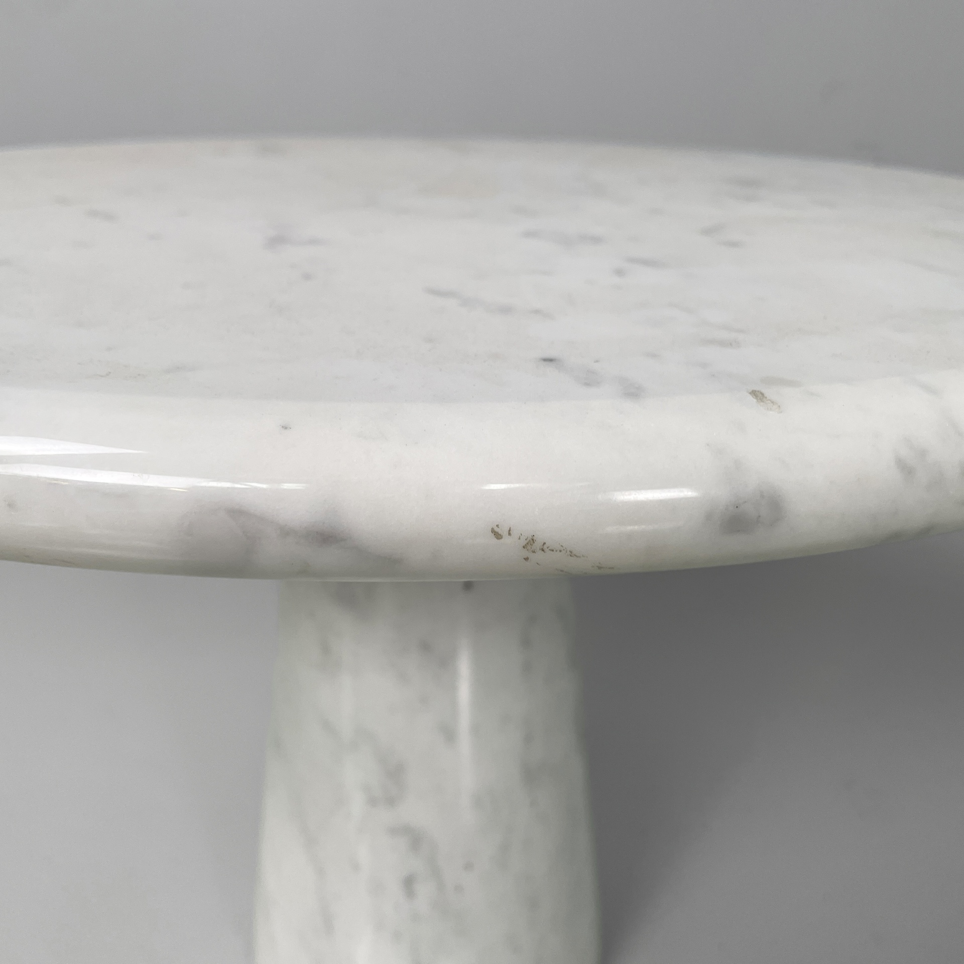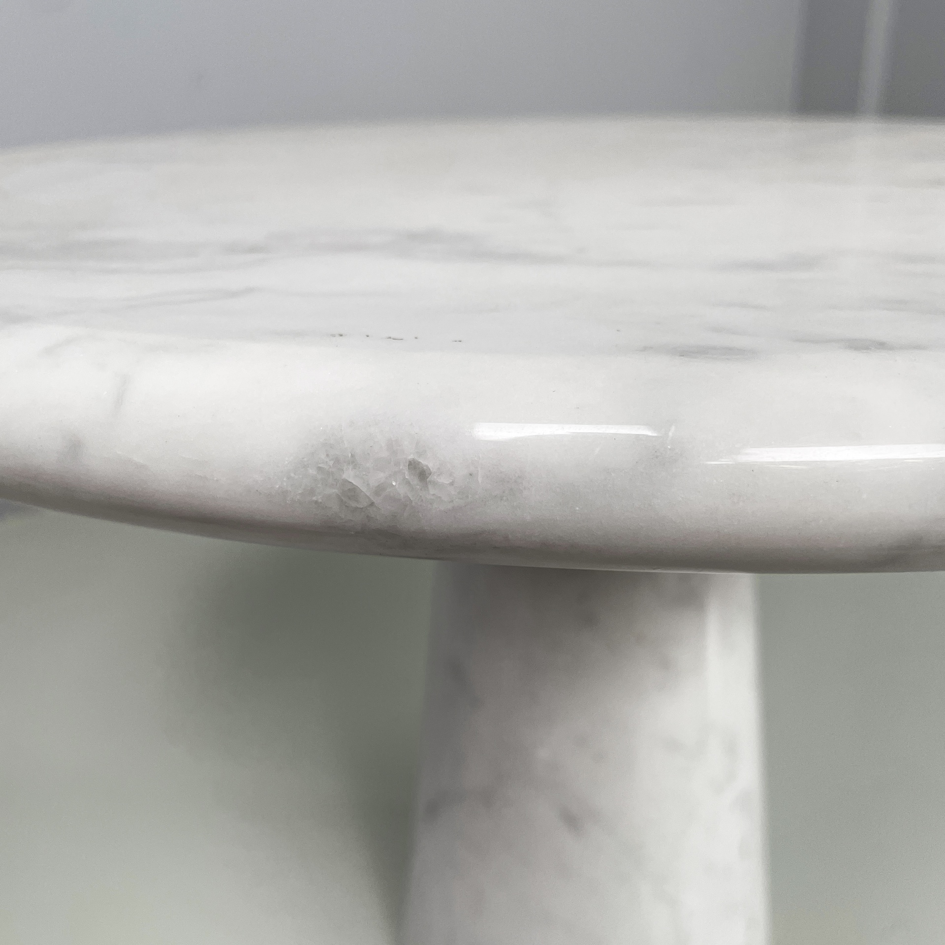 Tavolo da caffè interamente in marmo. Il piano tondo con bordi arrotondati è poggiato su una base conica.