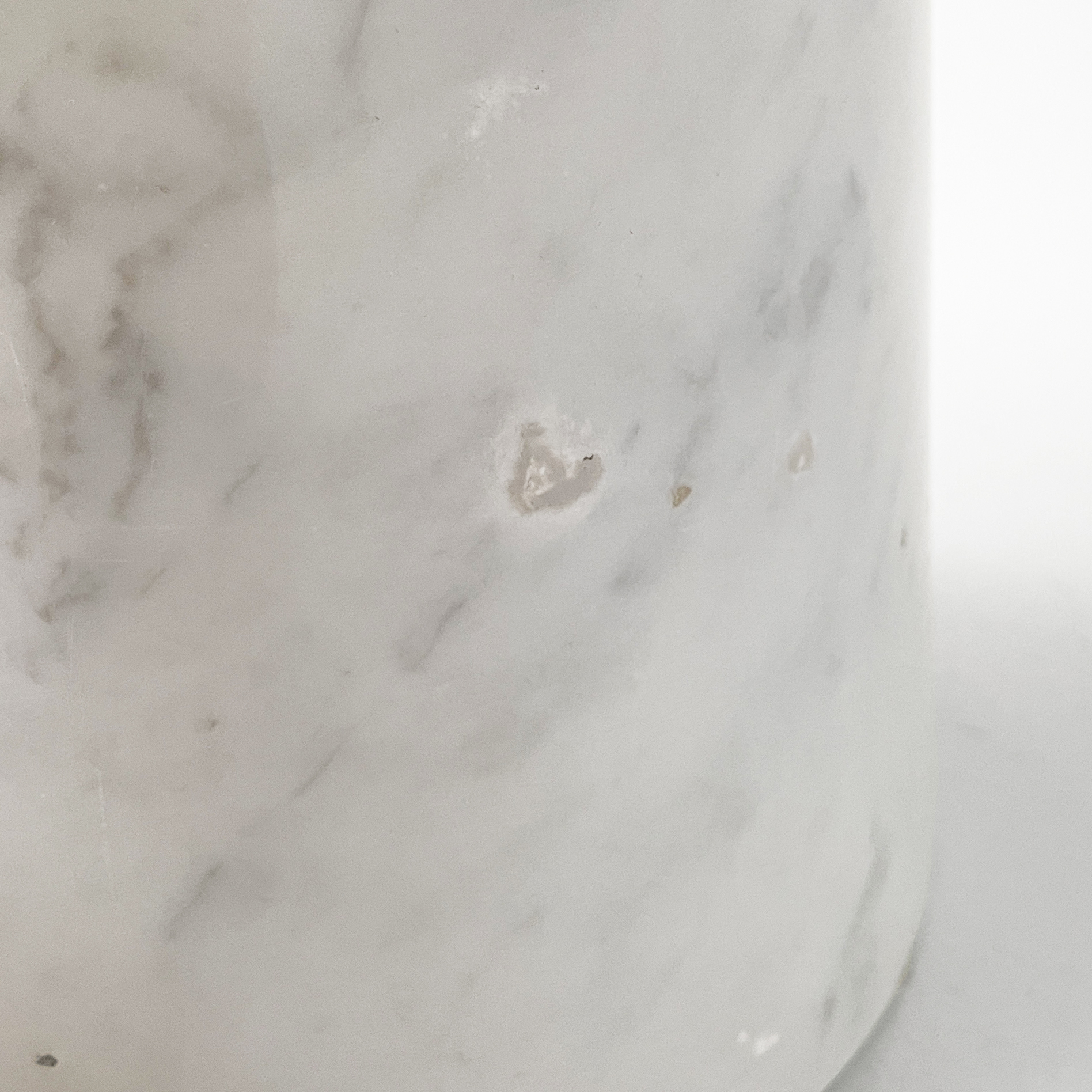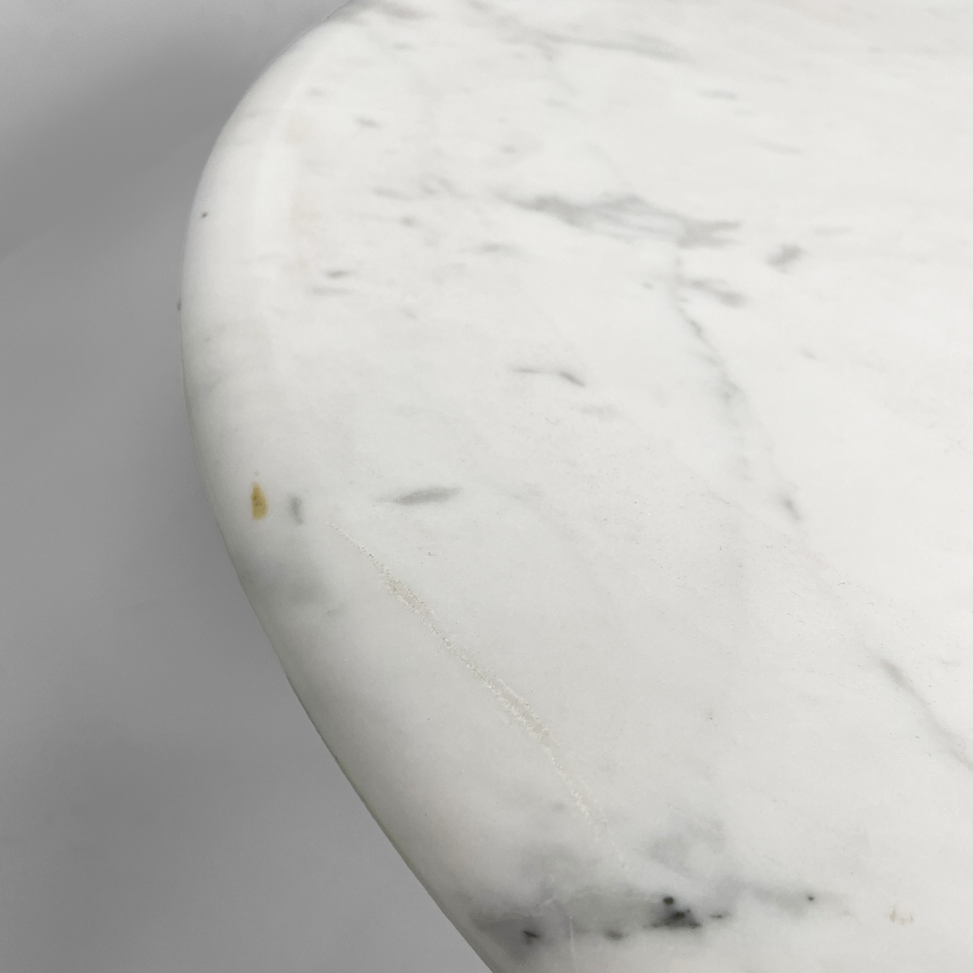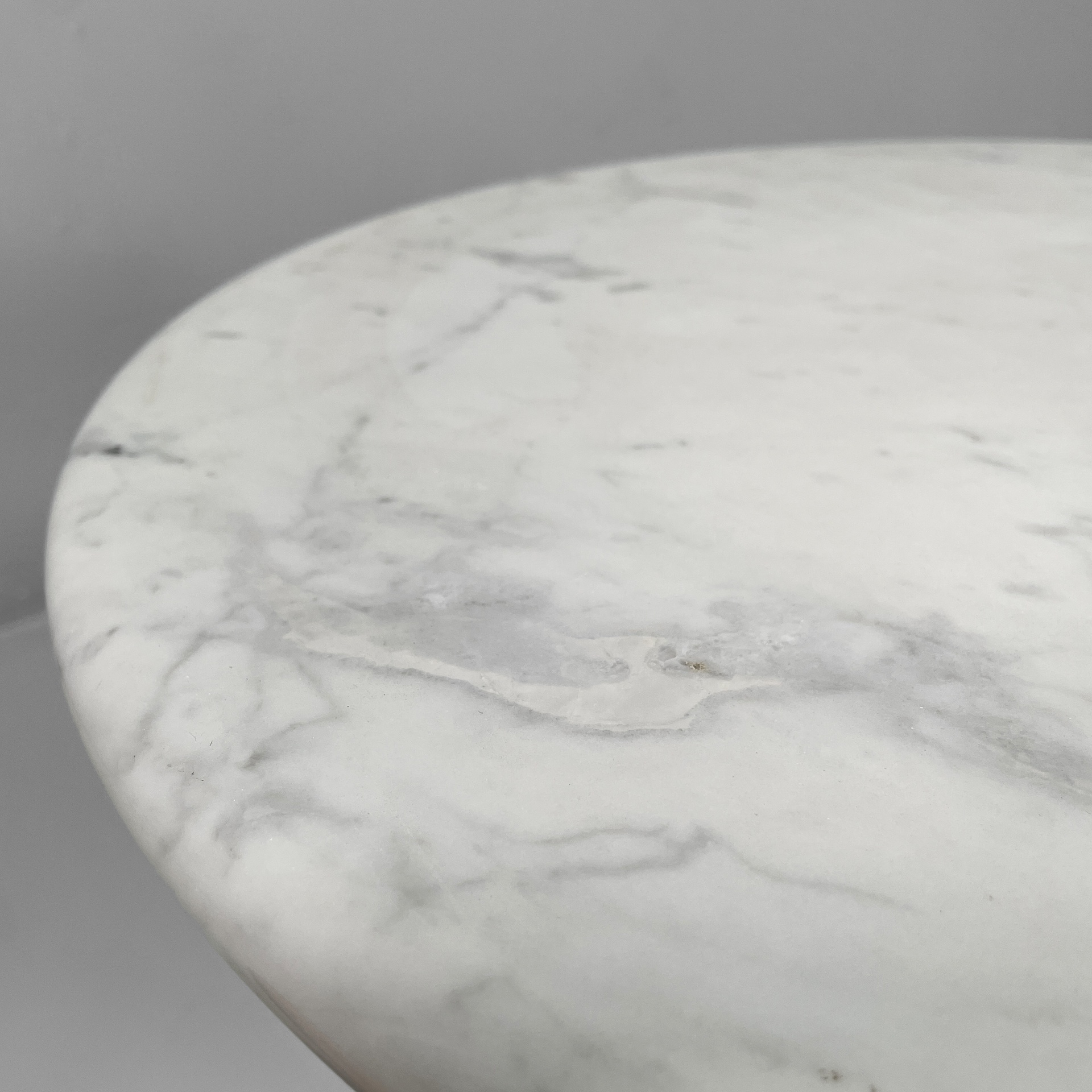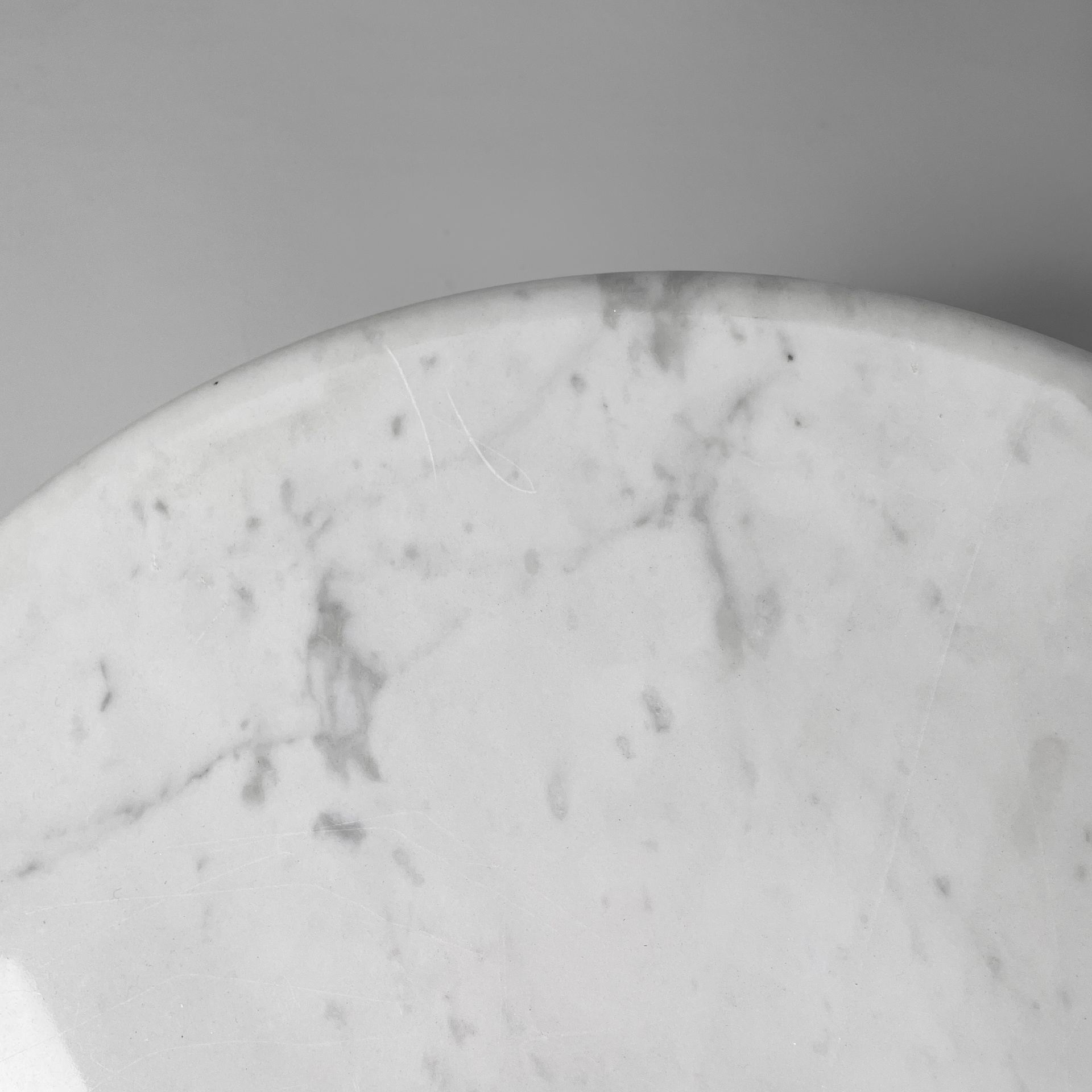 Tavolo da caffè interamente in marmo. Il piano tondo con bordi arrotondati è poggiato su una base conica.
