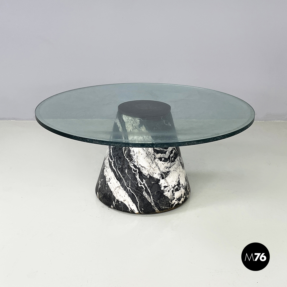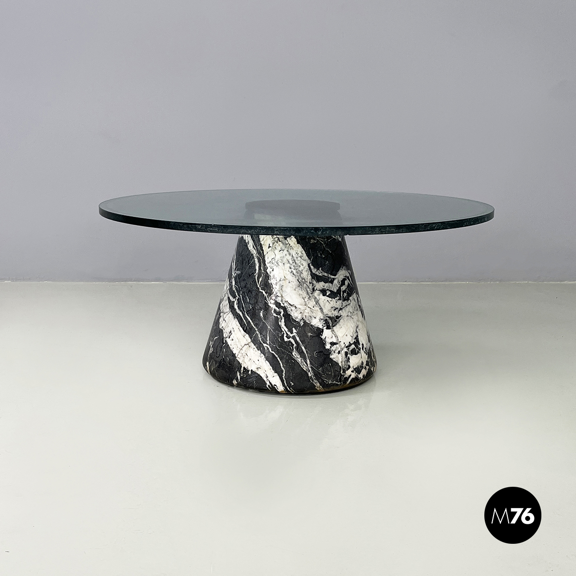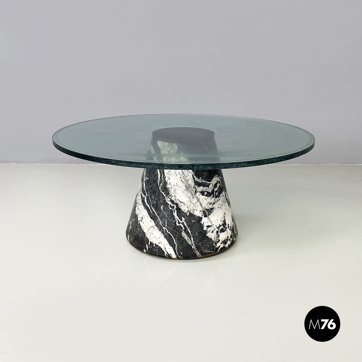 Tavolo da caffè con piano tondo in vetro color acquamarina di grosso spessore. La base conica su cui poggia il vetro è in marmo nero e bianco. Adatto ad uso esterno come in giardino.
