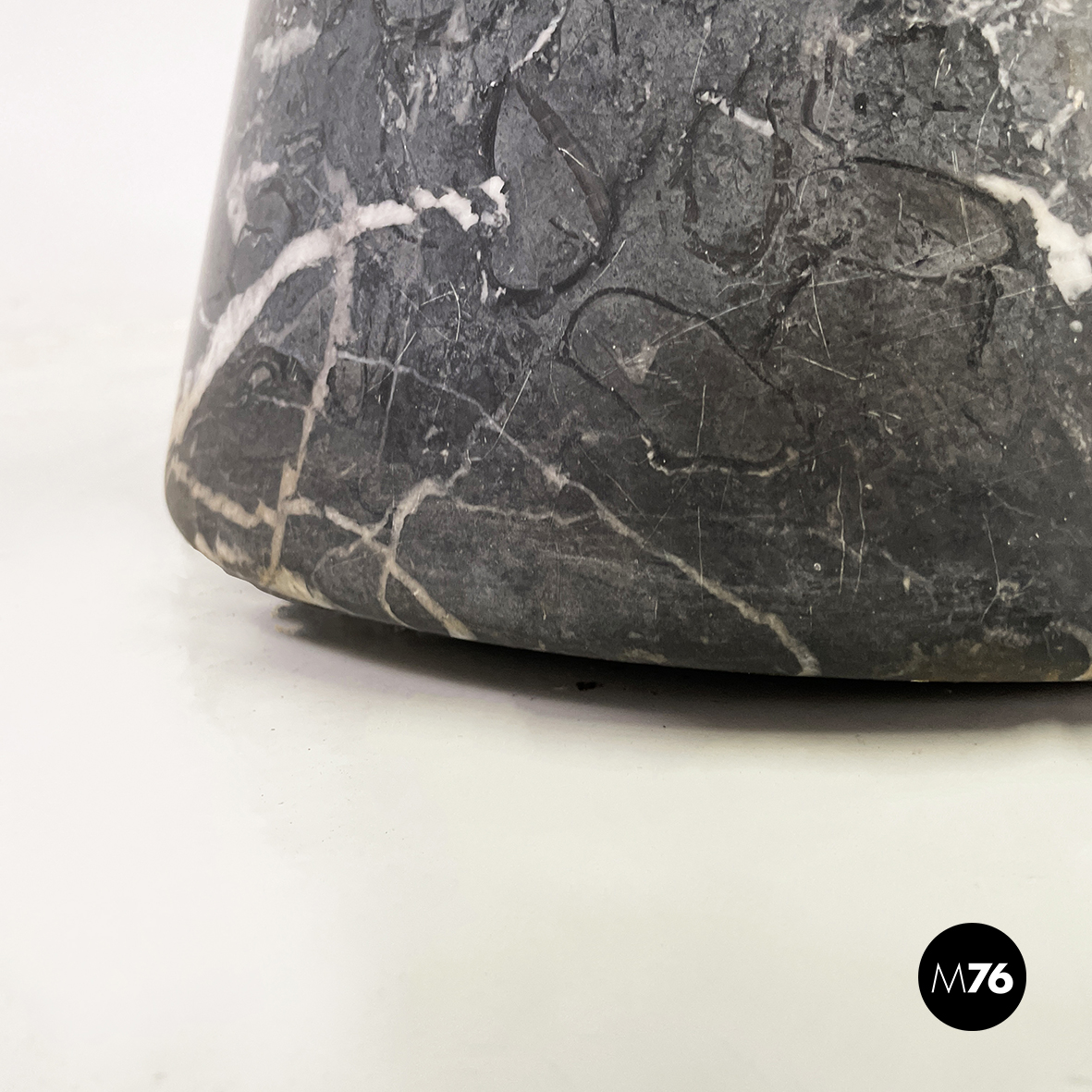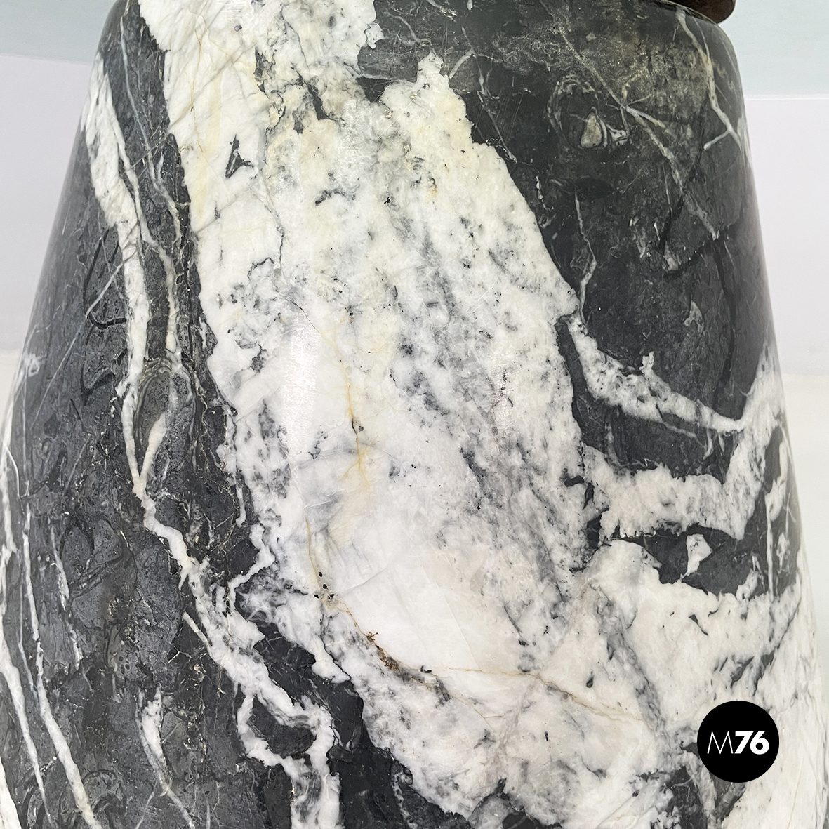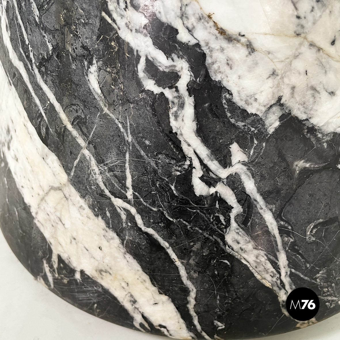 Tavolo da caffè con piano tondo in vetro color acquamarina di grosso spessore. La base conica su cui poggia il vetro è in marmo nero e bianco. Adatto ad uso esterno come in giardino.