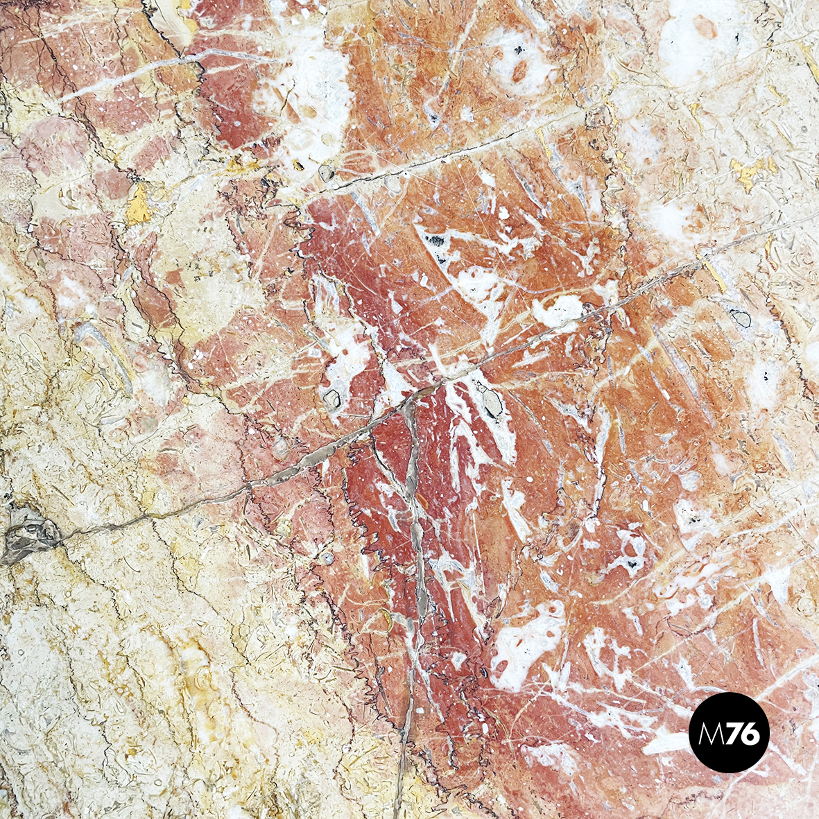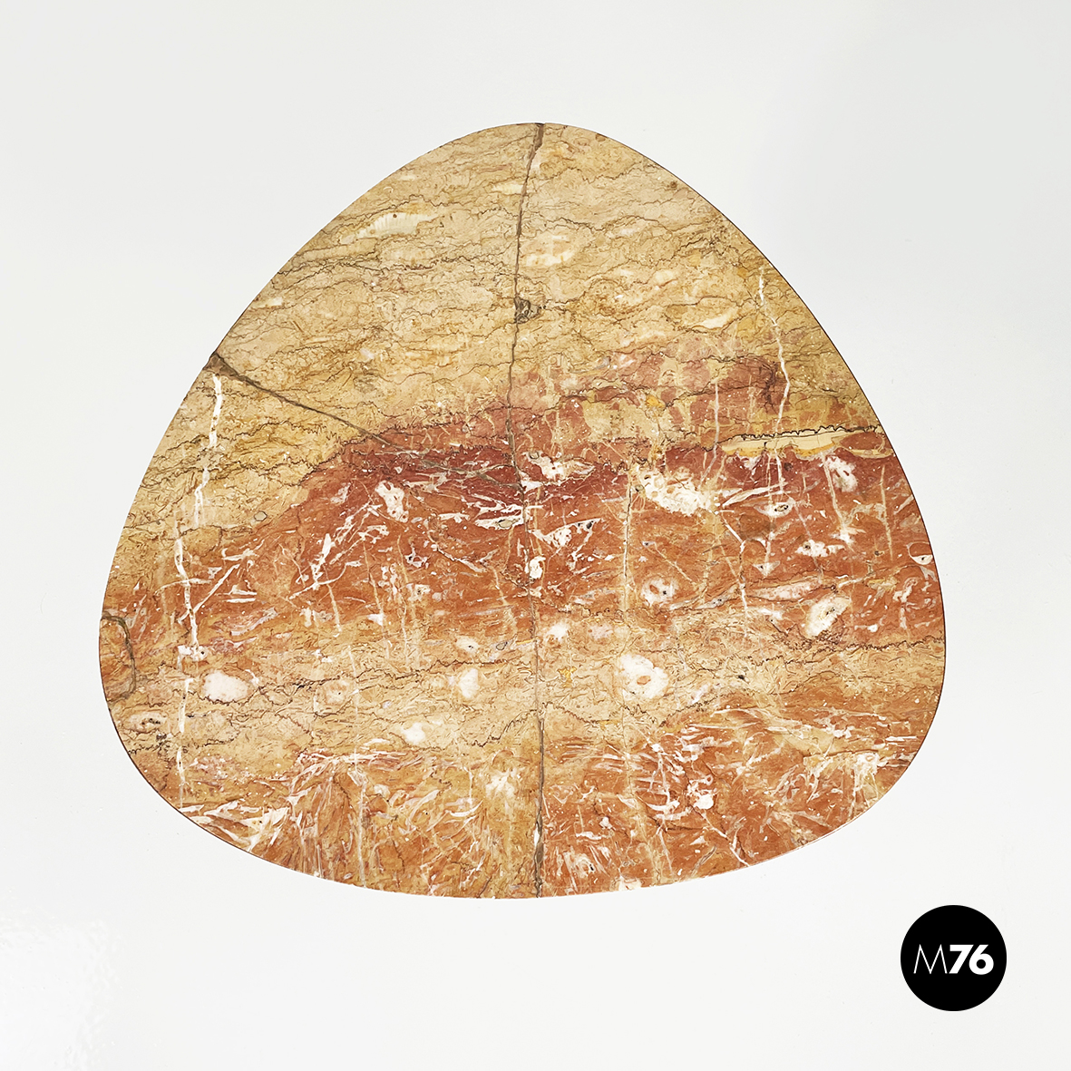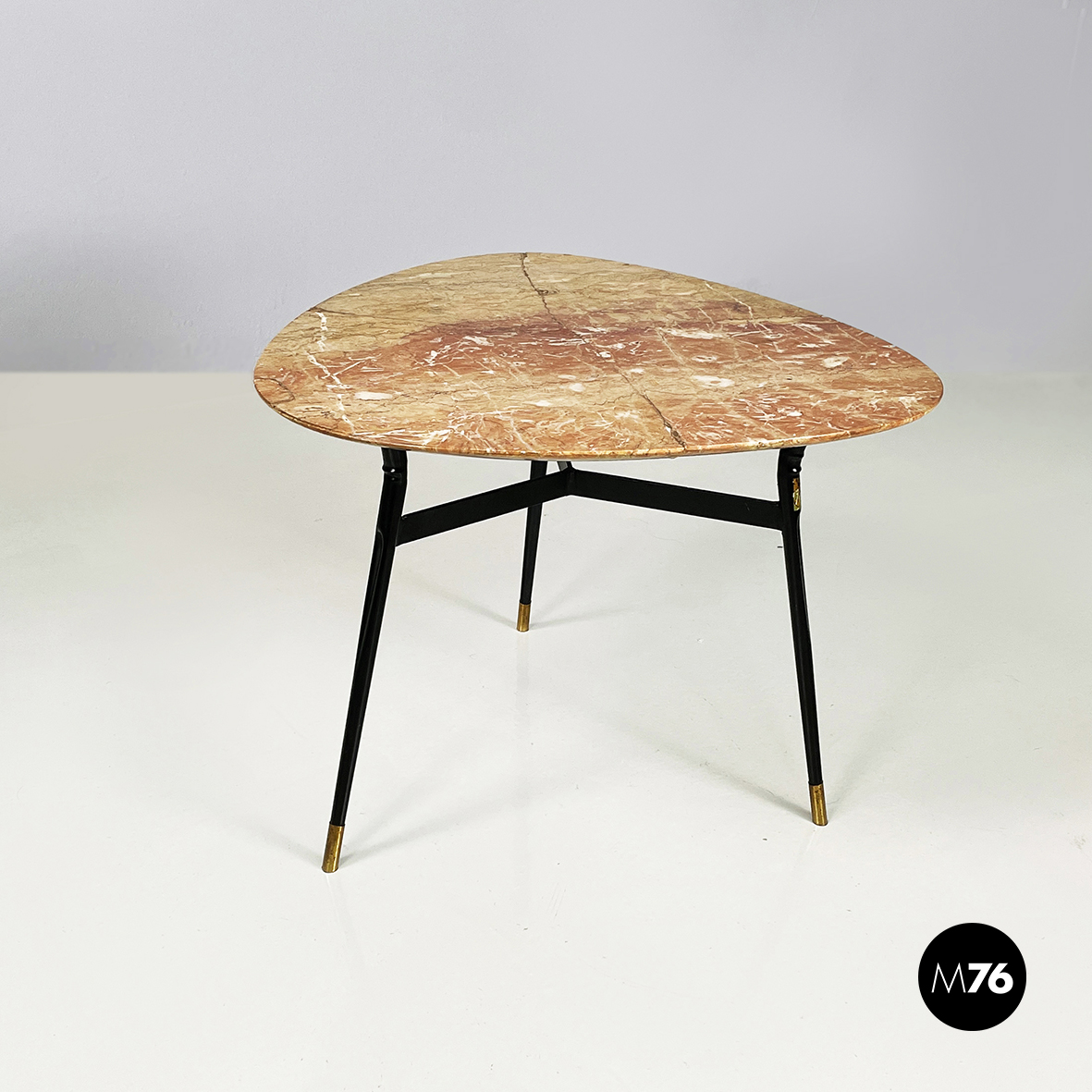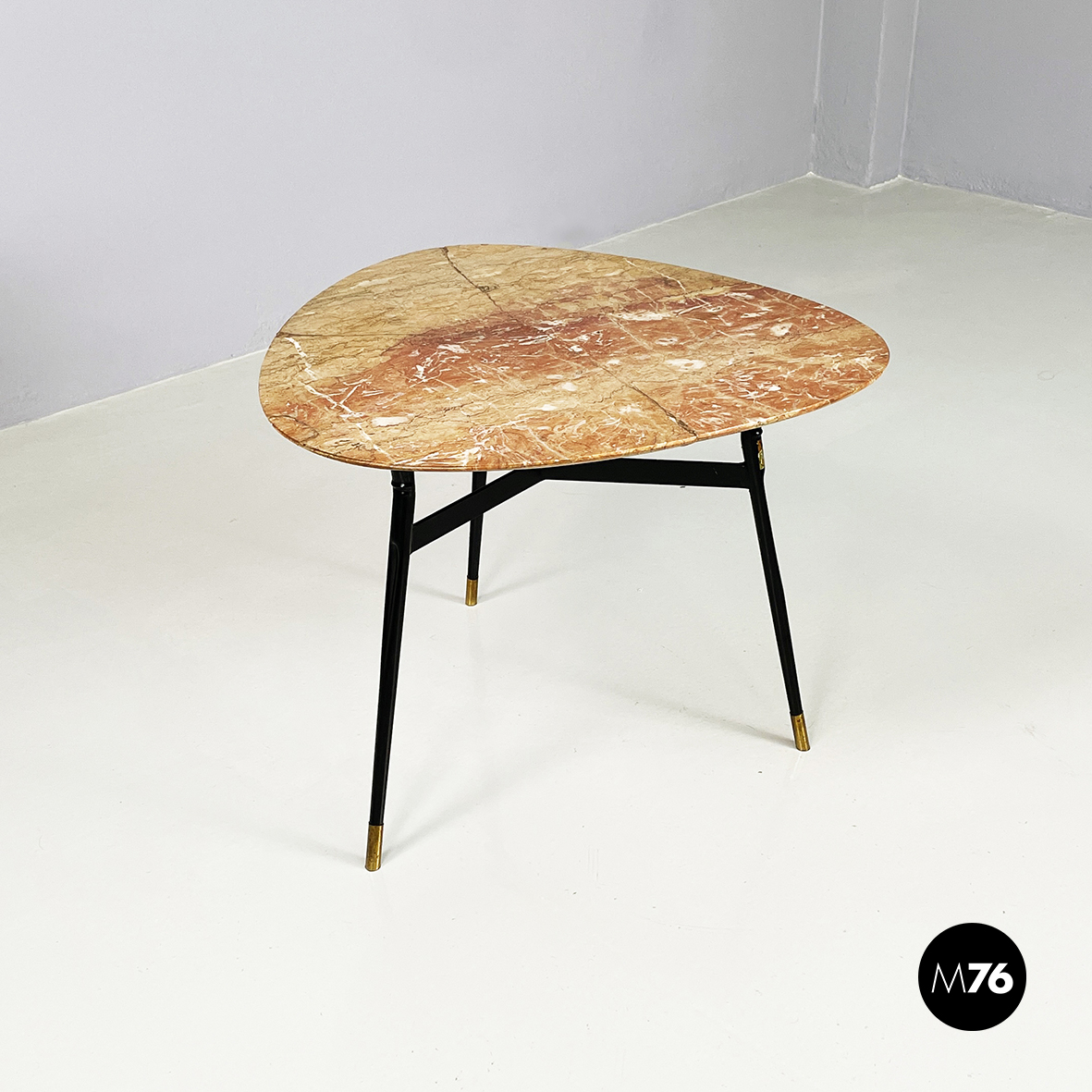 Tavolo da caffè con piano triangolare ad angoli arrotondati in marmo rosso. La struttura a sezione rettangolare e le zampe a sezione tonda sono in metallo verniciato nero. Piedini tondi in ottone.