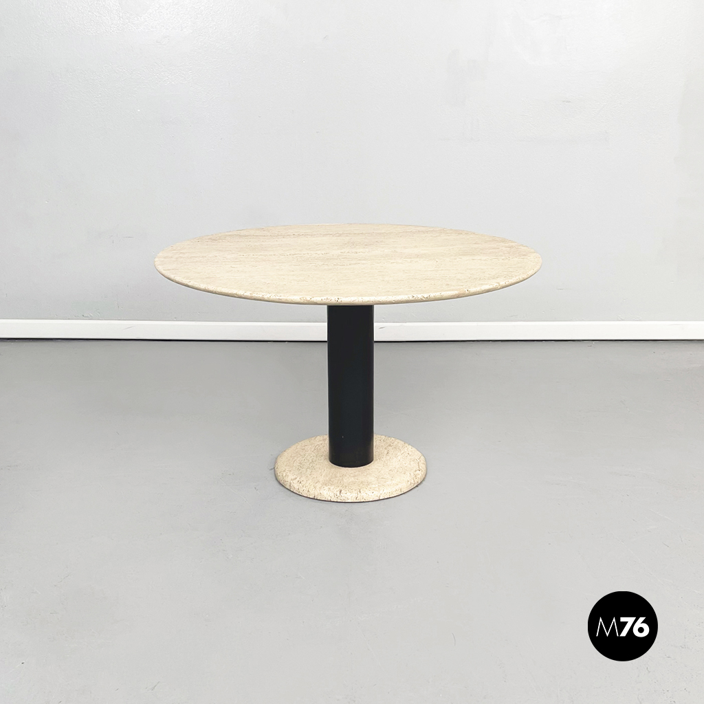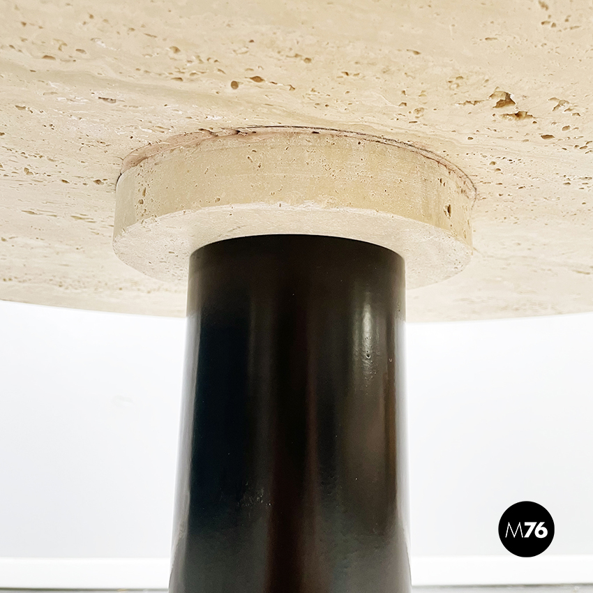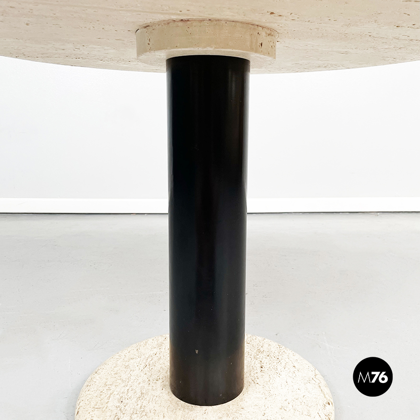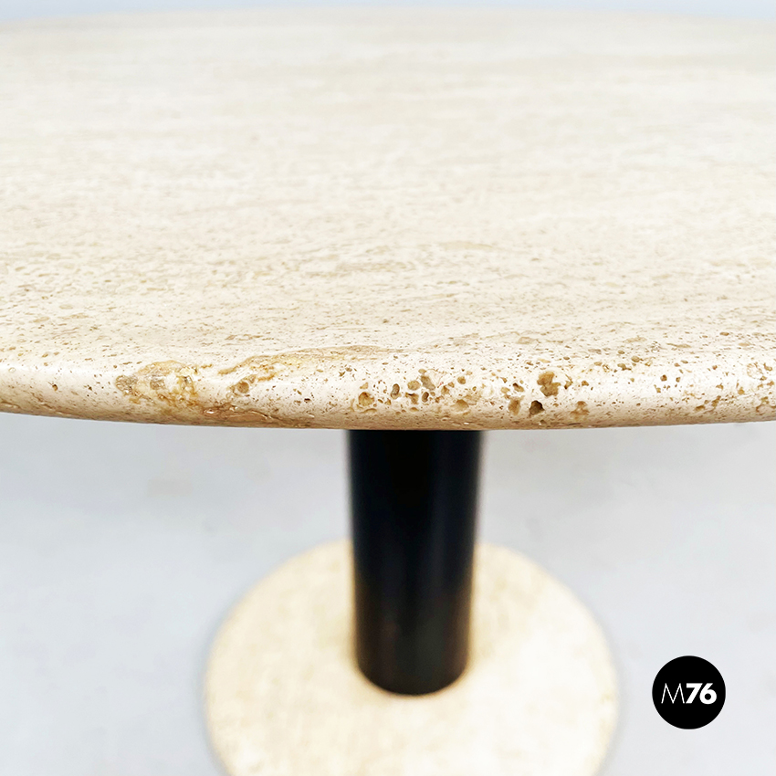 Tavolo da caffè tondo con piano in travertino. Il piano è una lastra di travertino poggiata su una gamba cilindrica in metallo verniciato nero. La base tonda è in travertino.