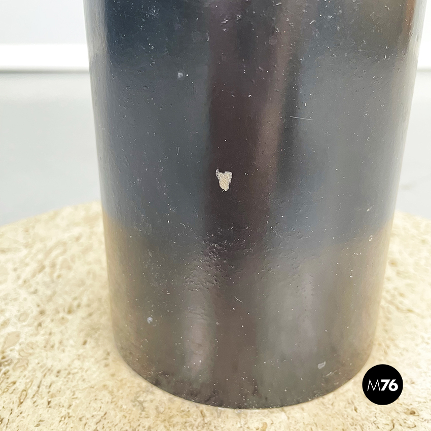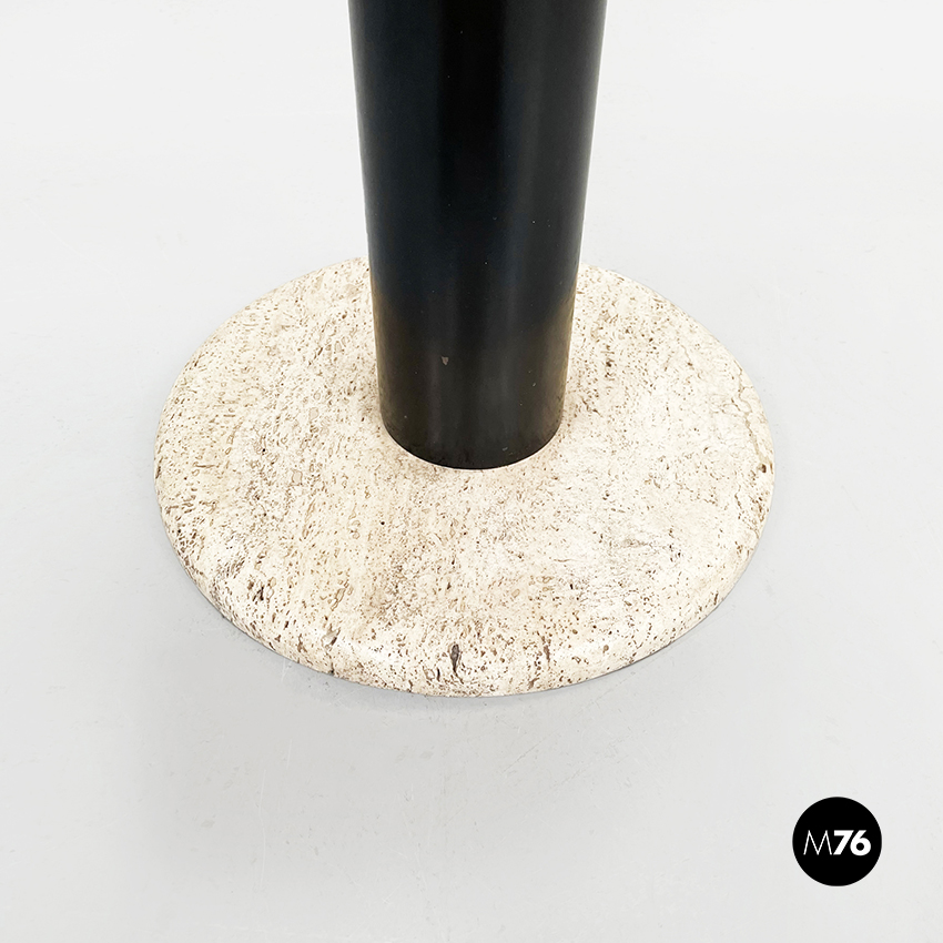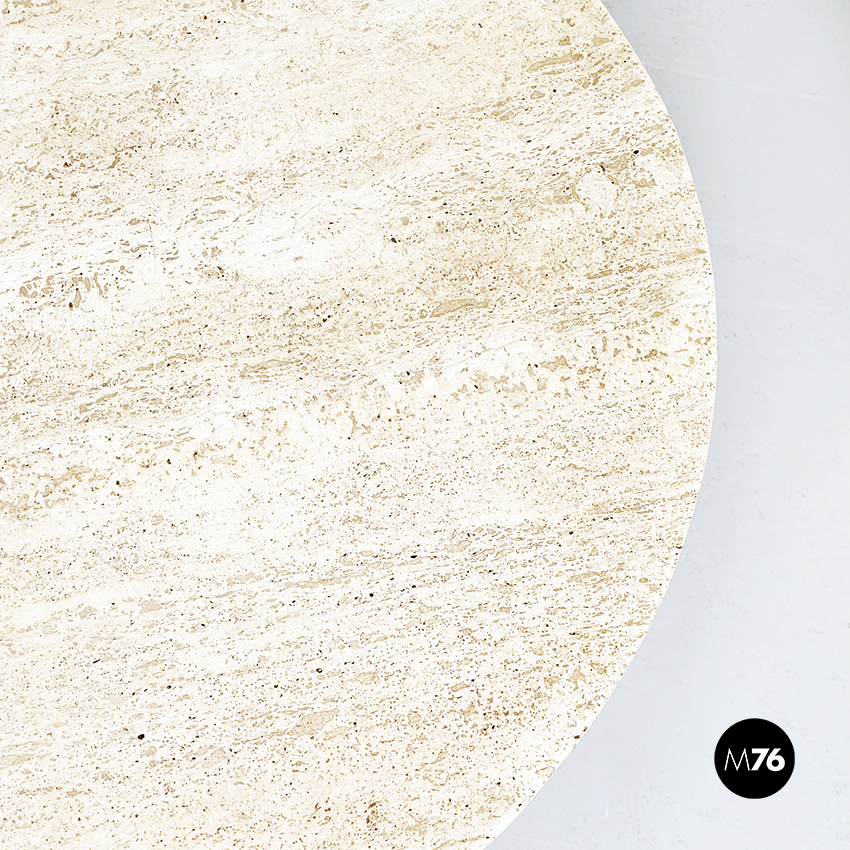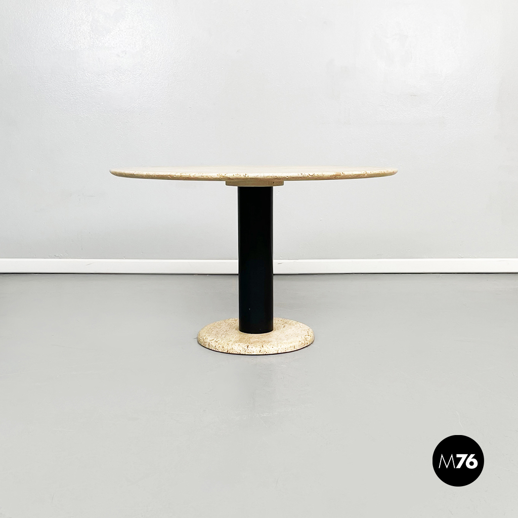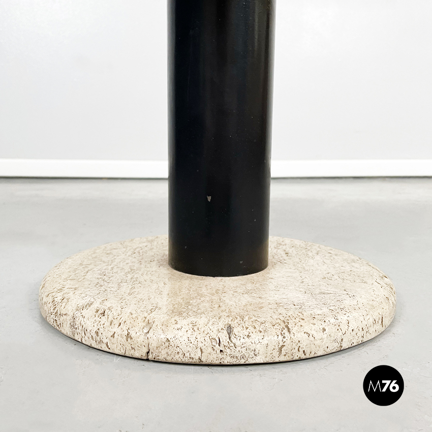 Tavolo da caffè tondo con piano in travertino. Il piano è una lastra di travertino poggiata su una gamba cilindrica in metallo verniciato nero. La base tonda è in travertino.