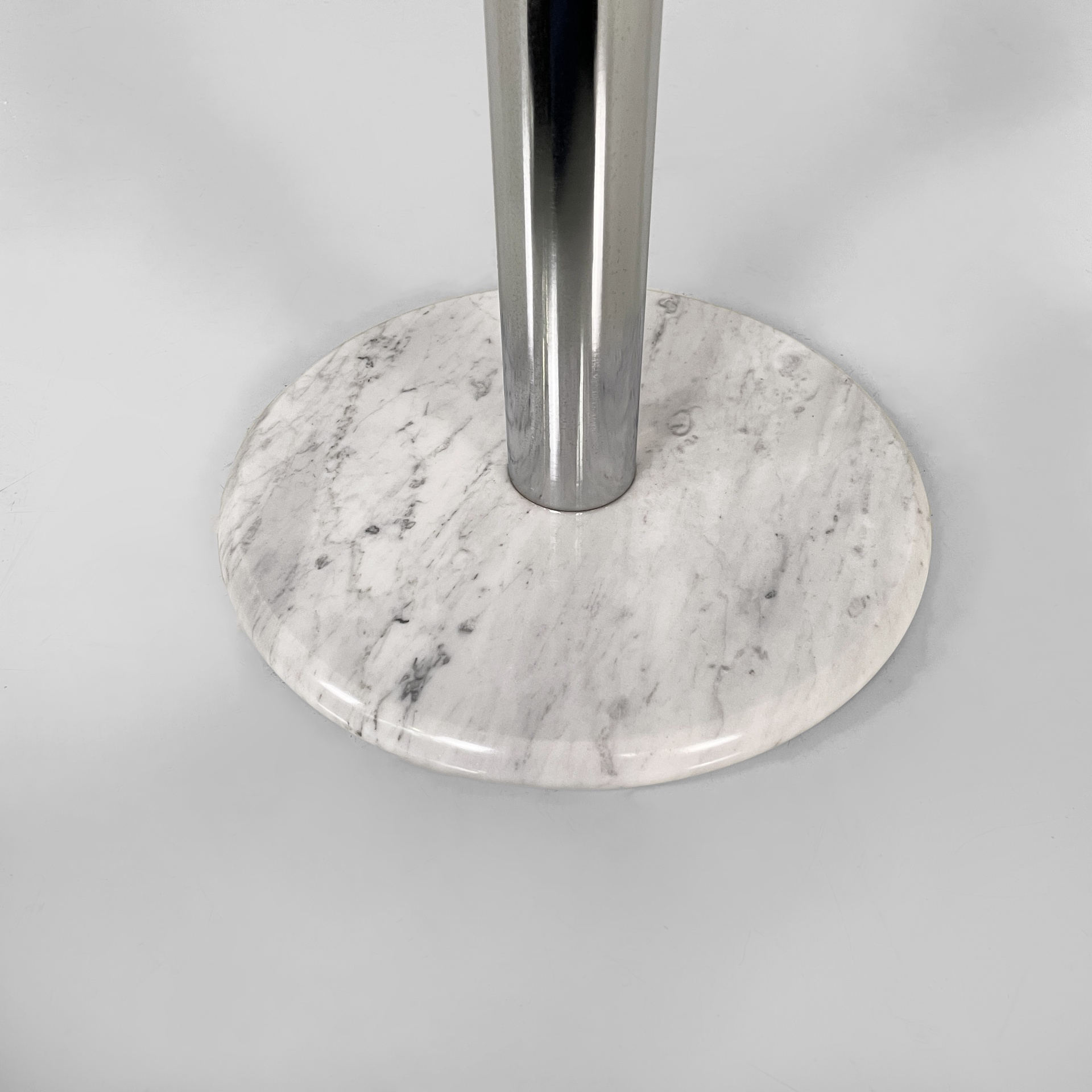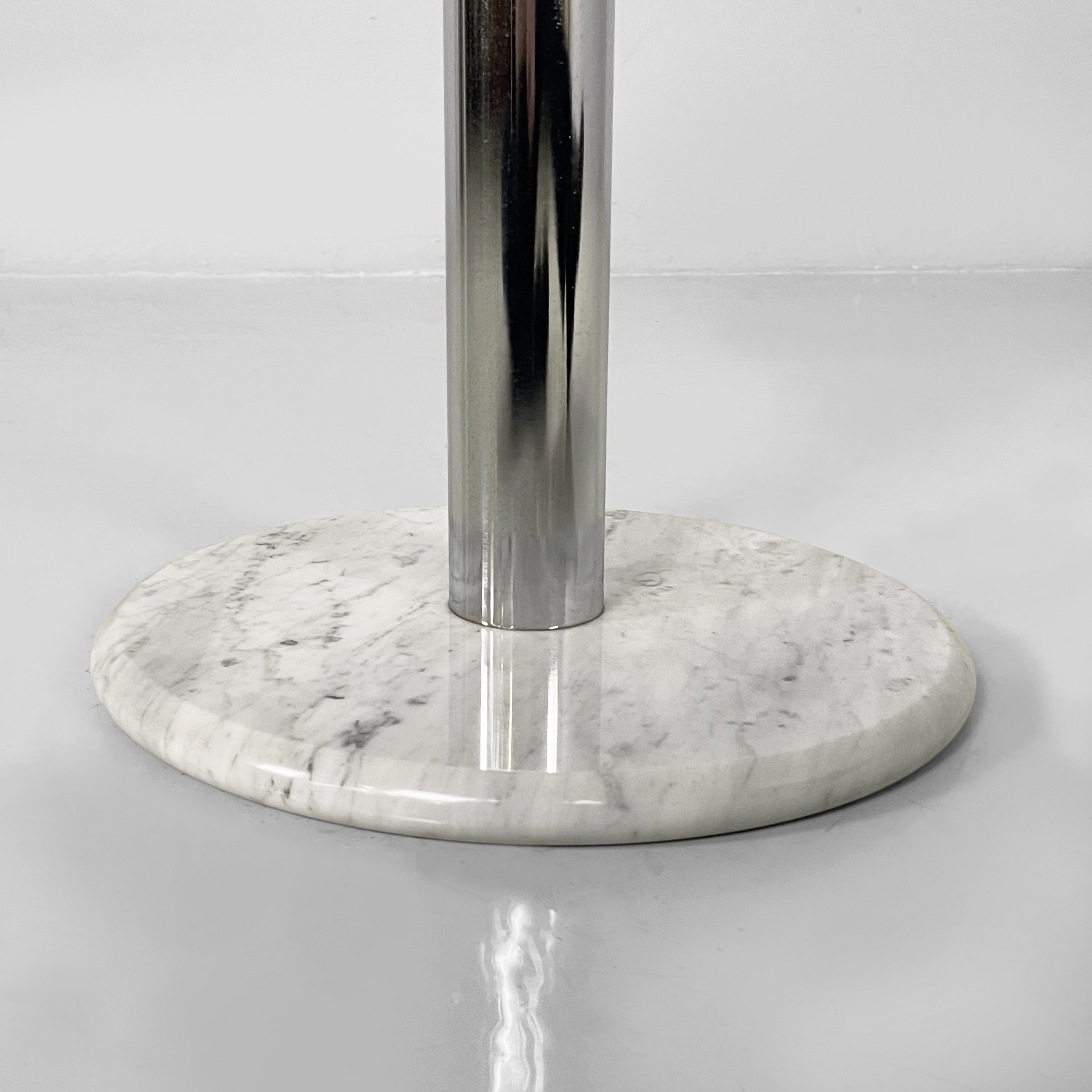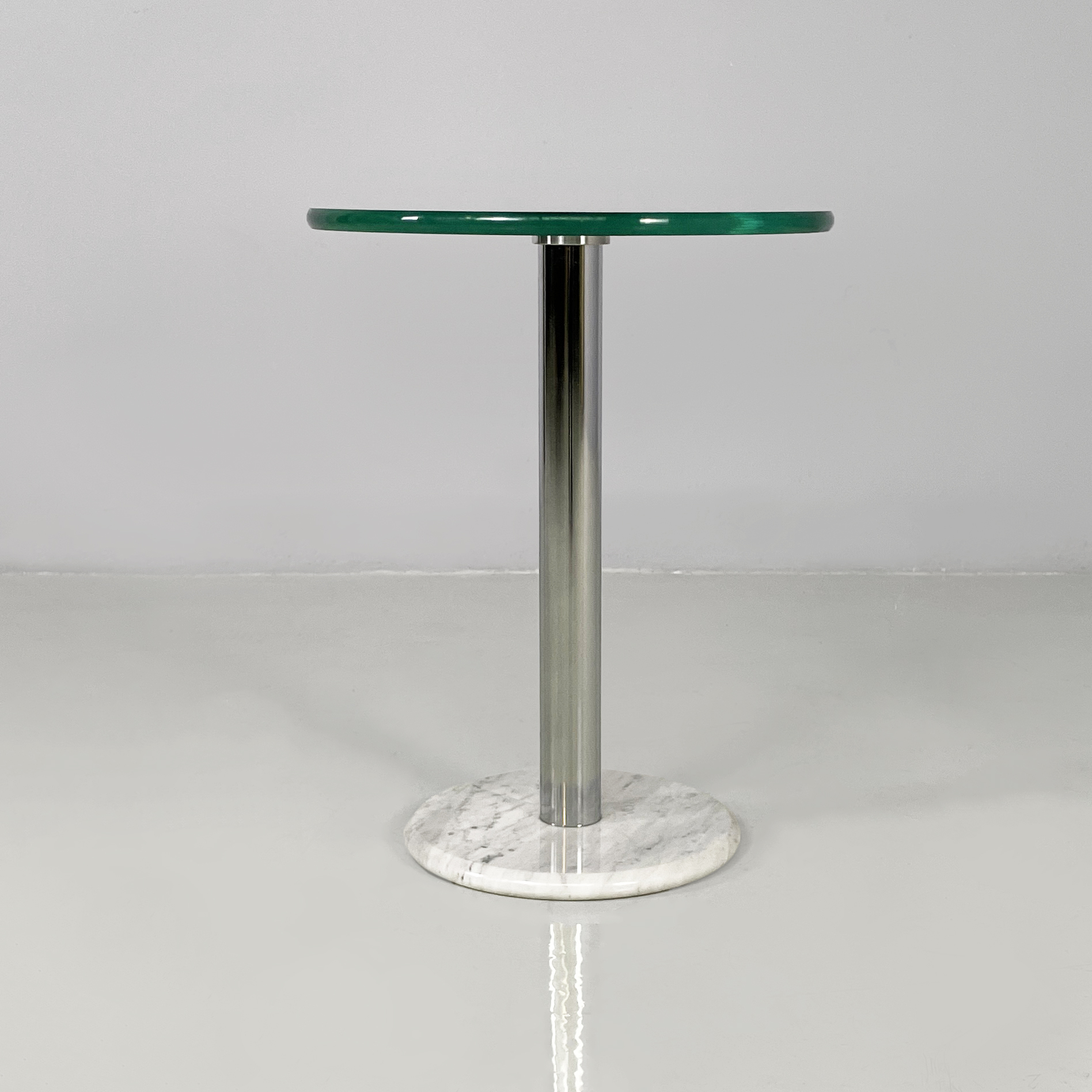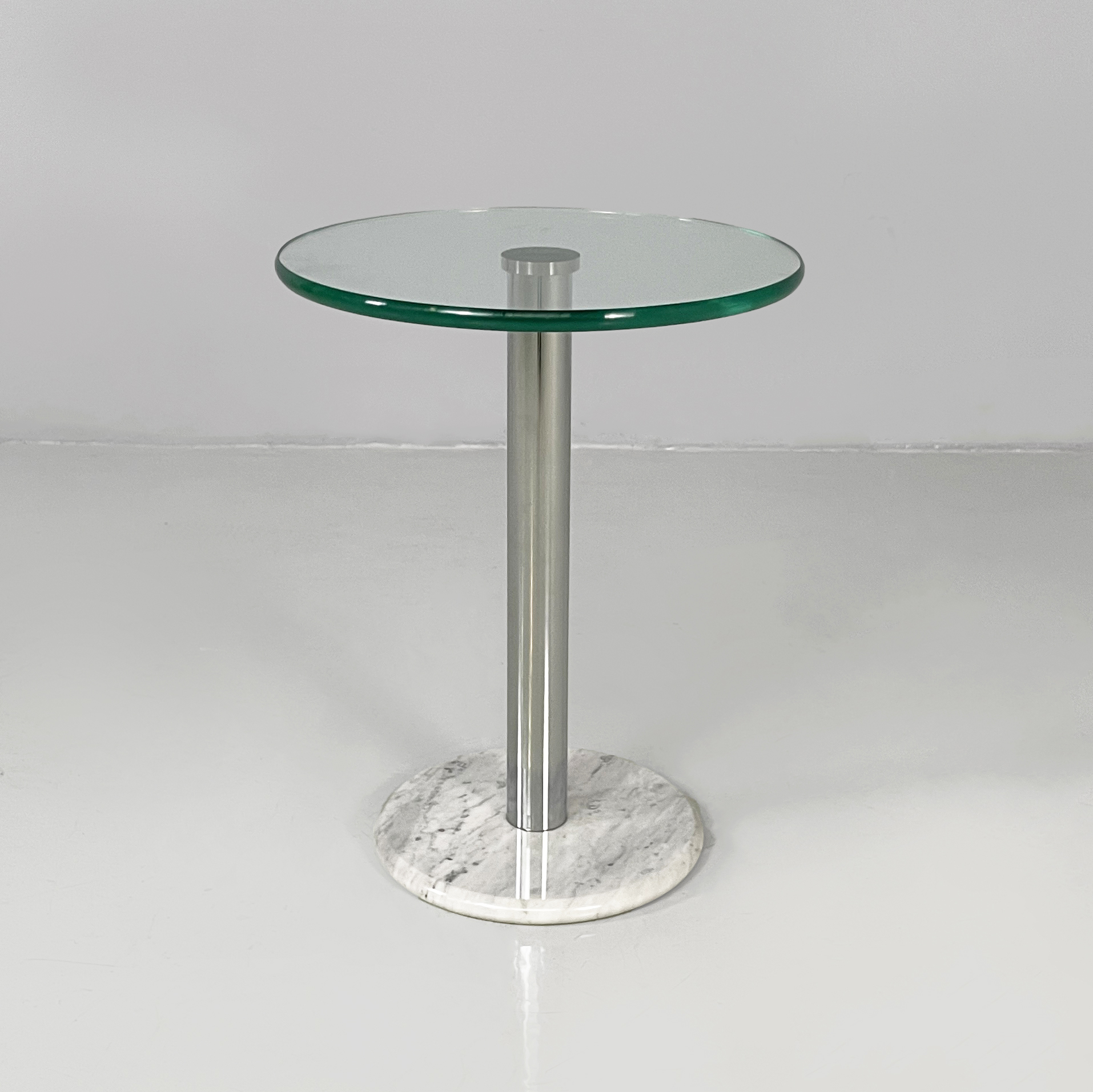 Tavolo da caffè con piano tondo in vetro di grosso spessore. La struttura è in tubolare di acciaio. La base tonda è in marmo.