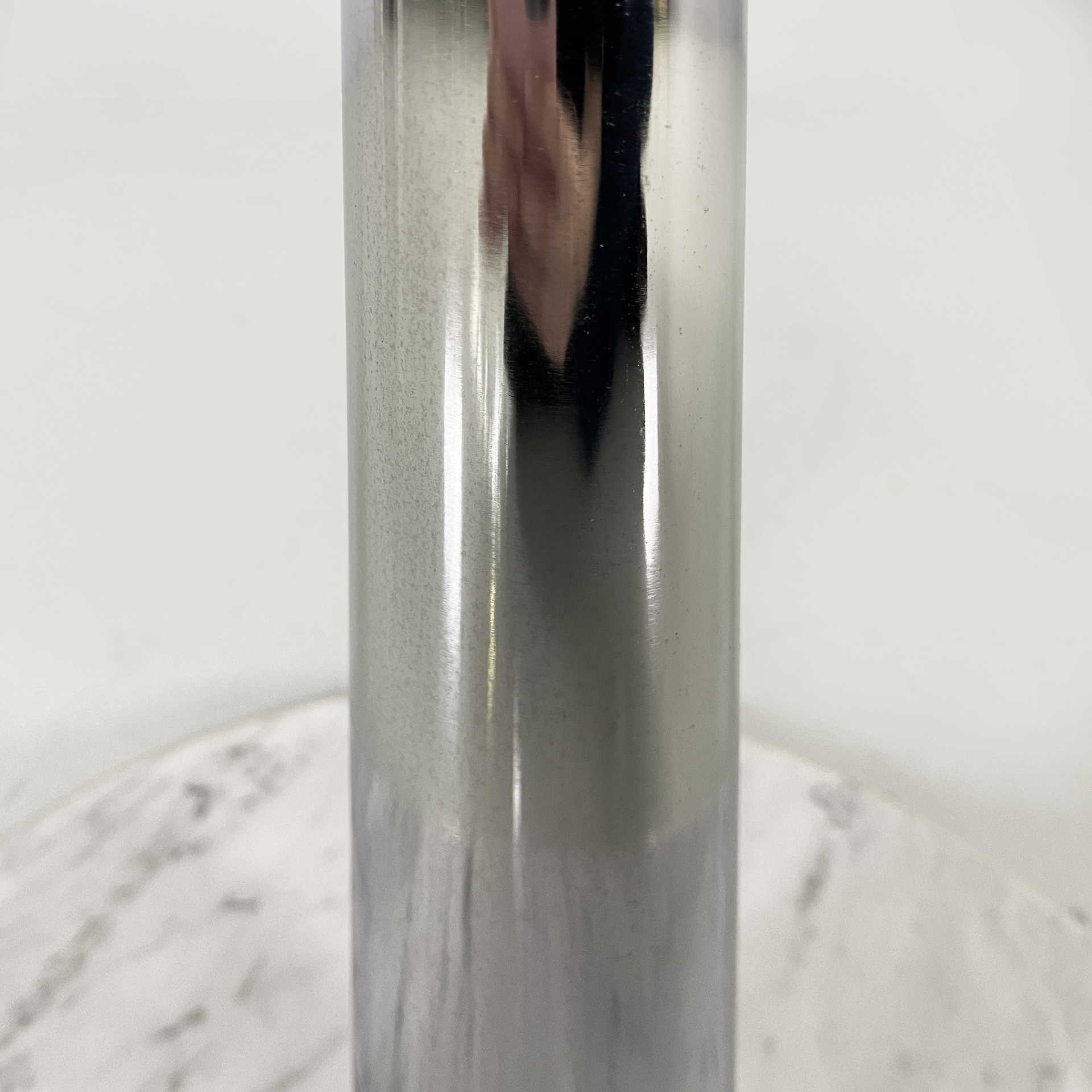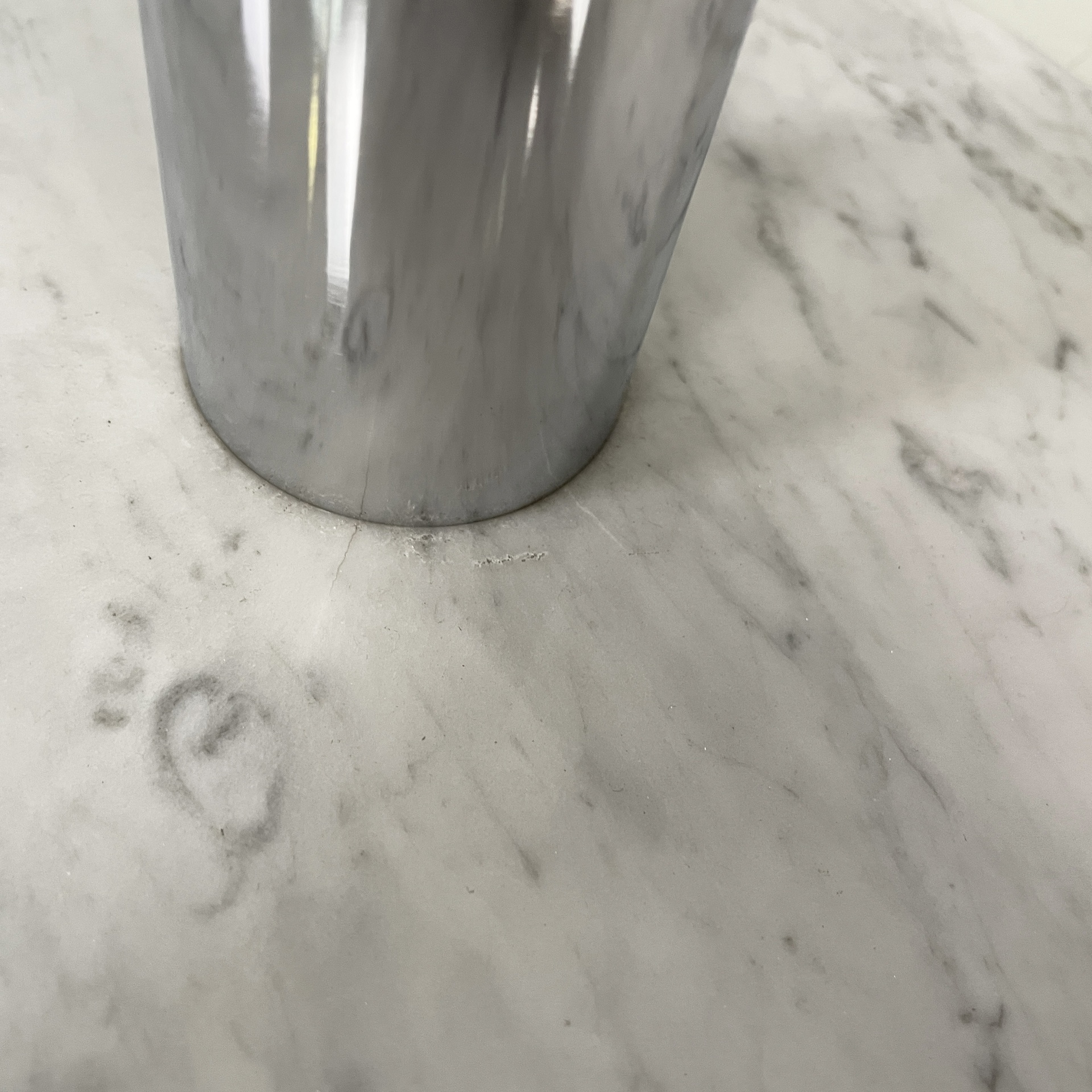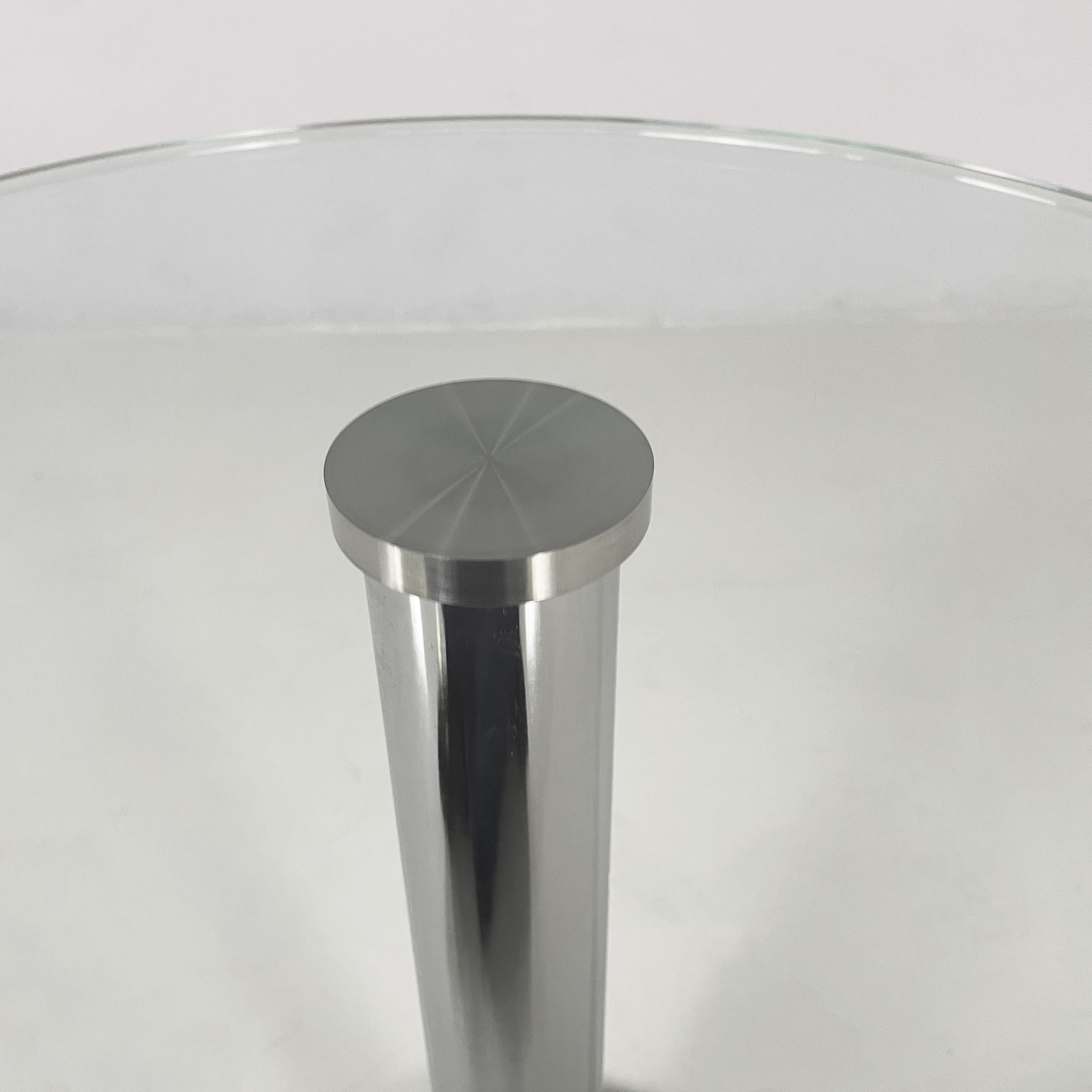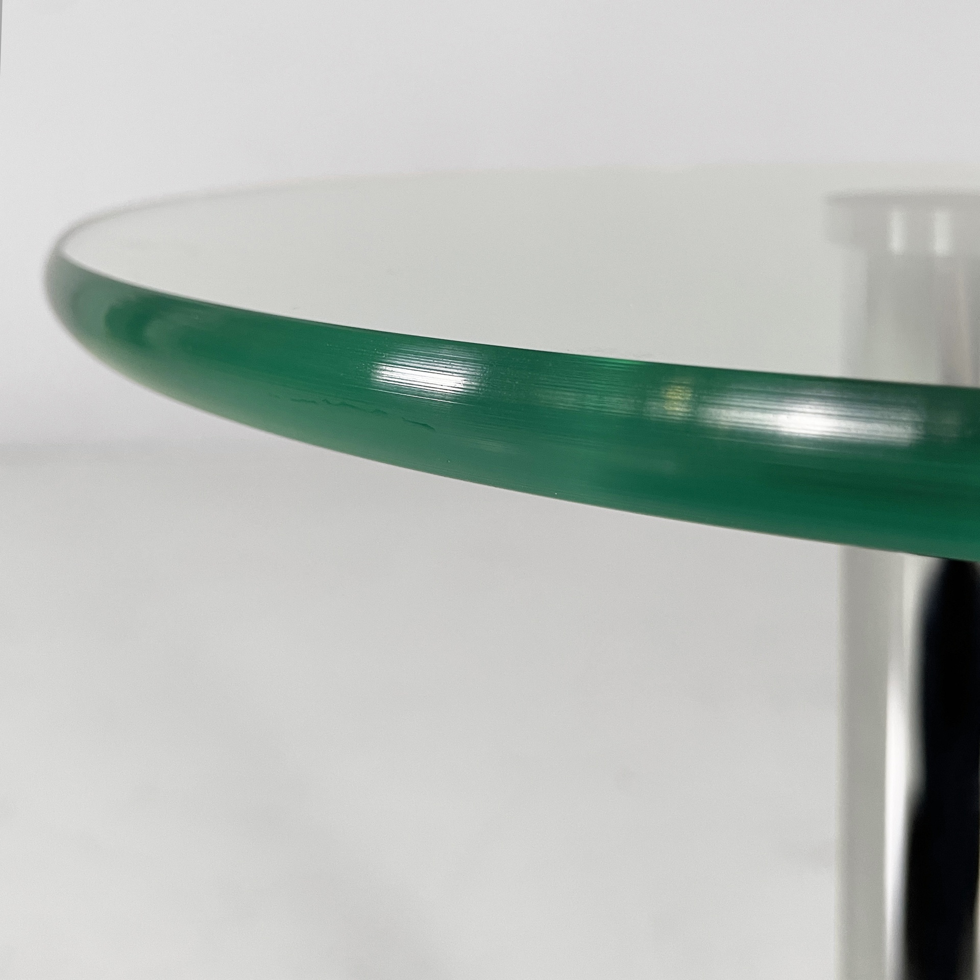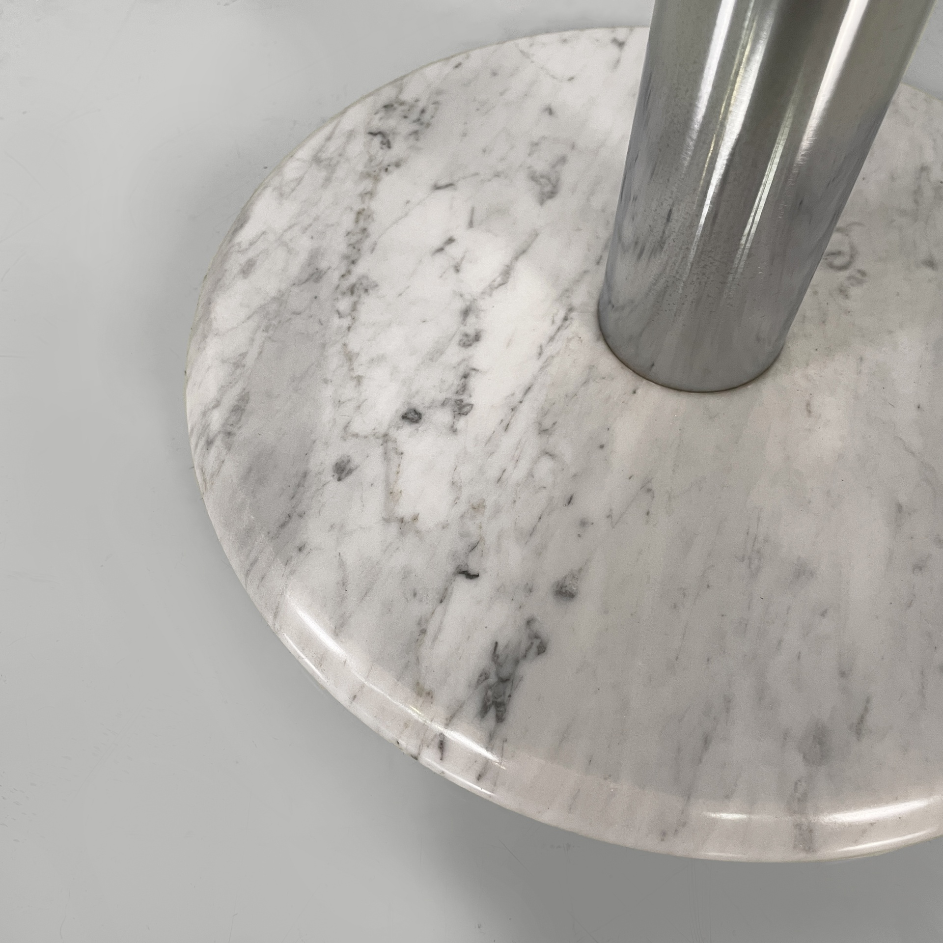 Tavolo da caffè con piano tondo in vetro di grosso spessore. La struttura è in tubolare di acciaio. La base tonda è in marmo.