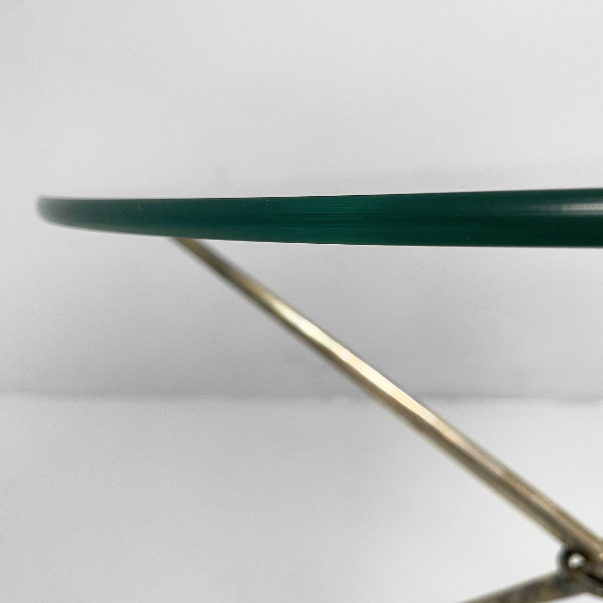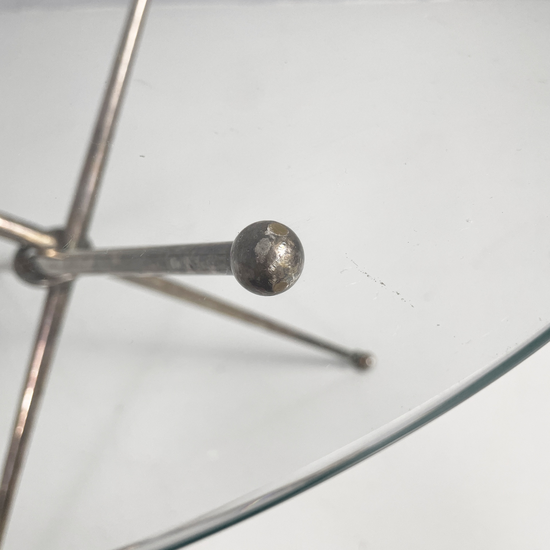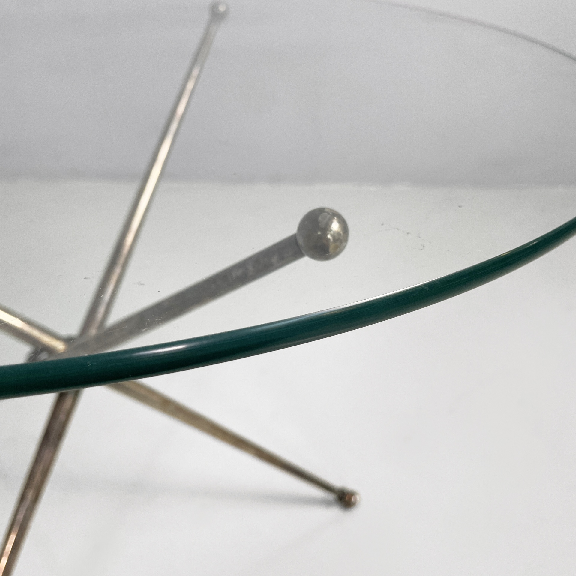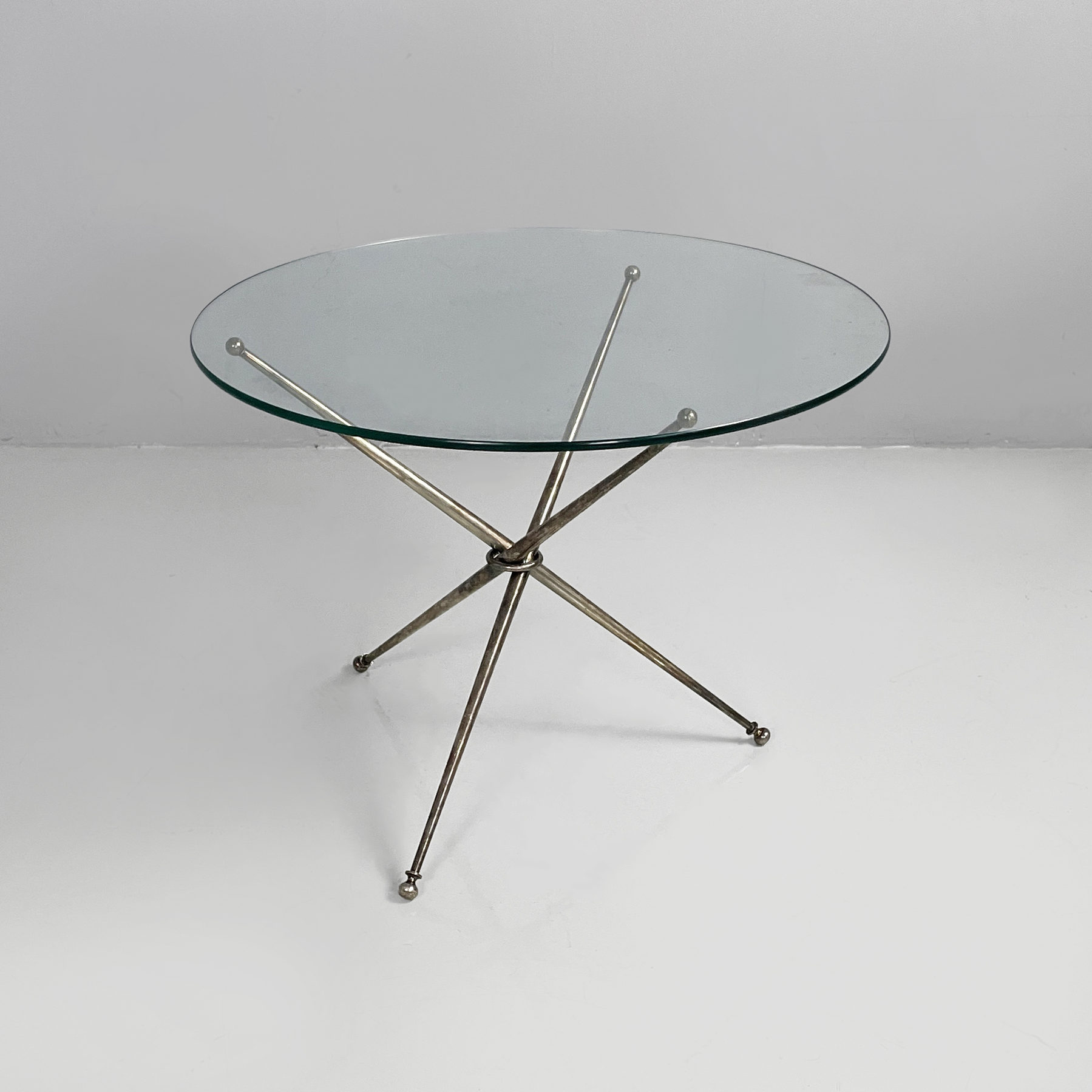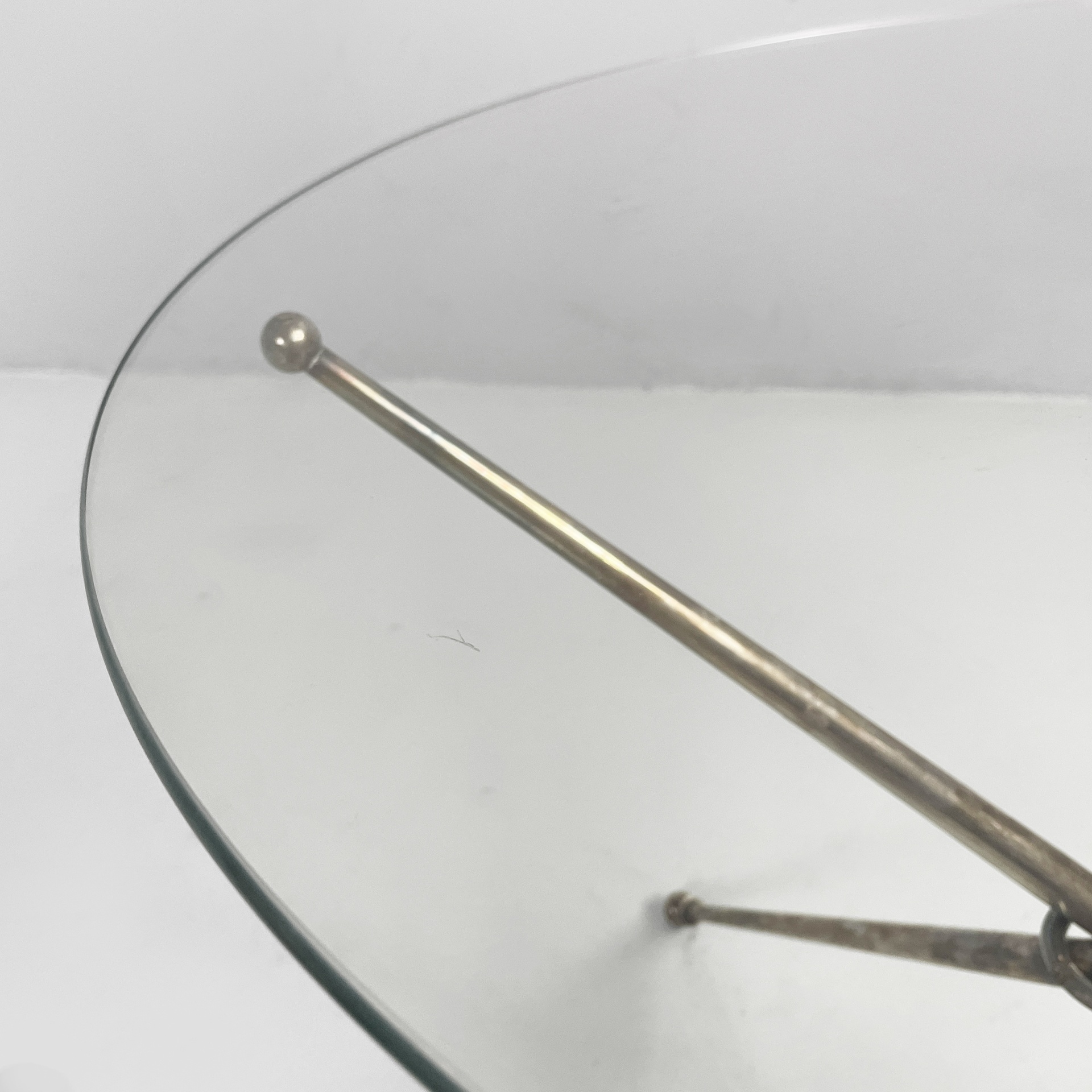 Tavolo da caffè con piano tondo in vetro di grosso spessore. La base è composta da tre tondini di metallo brunito uniti al centro da un anello. Piedini sferici.