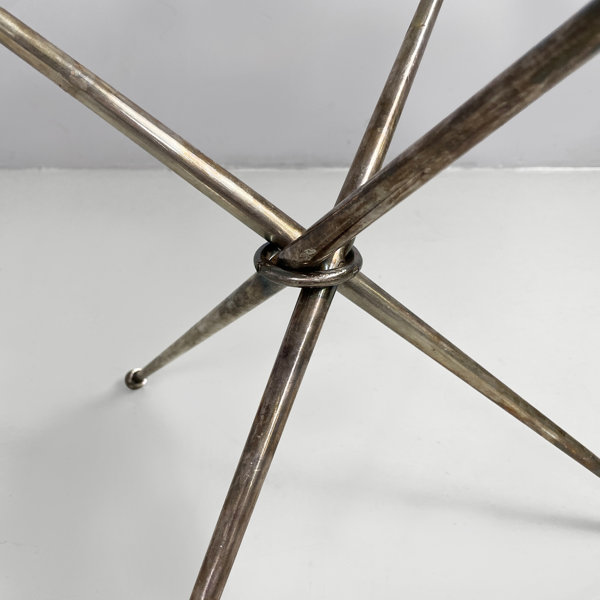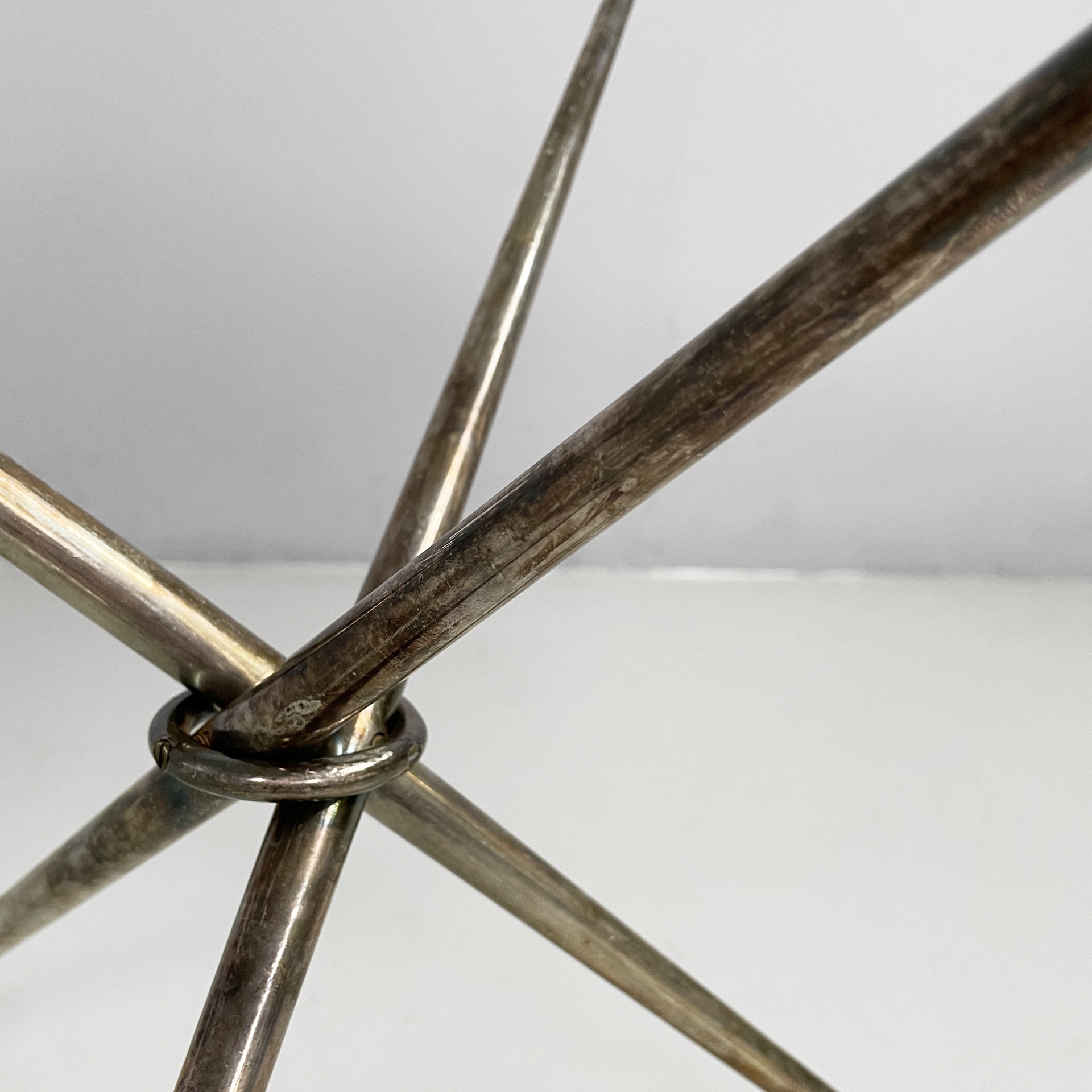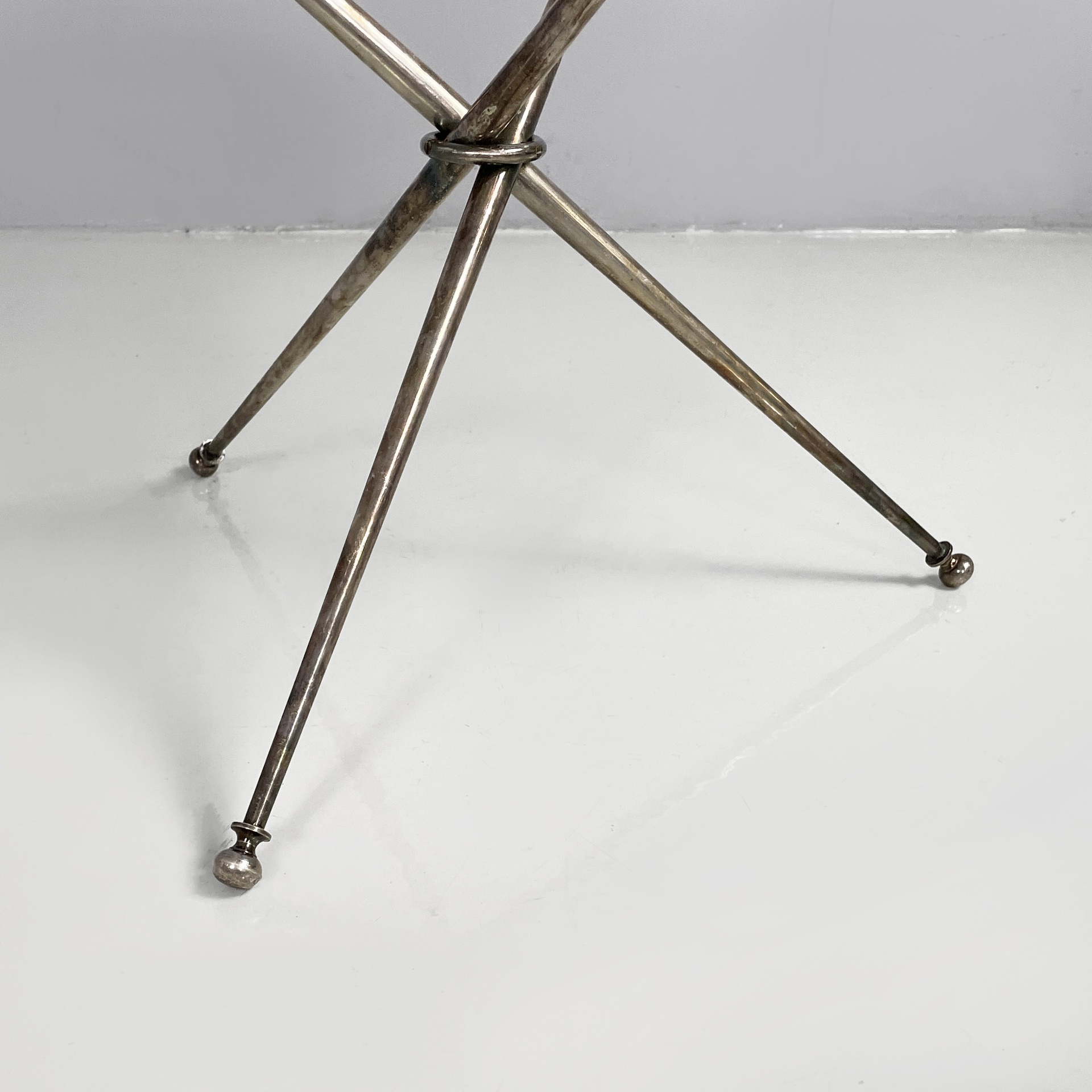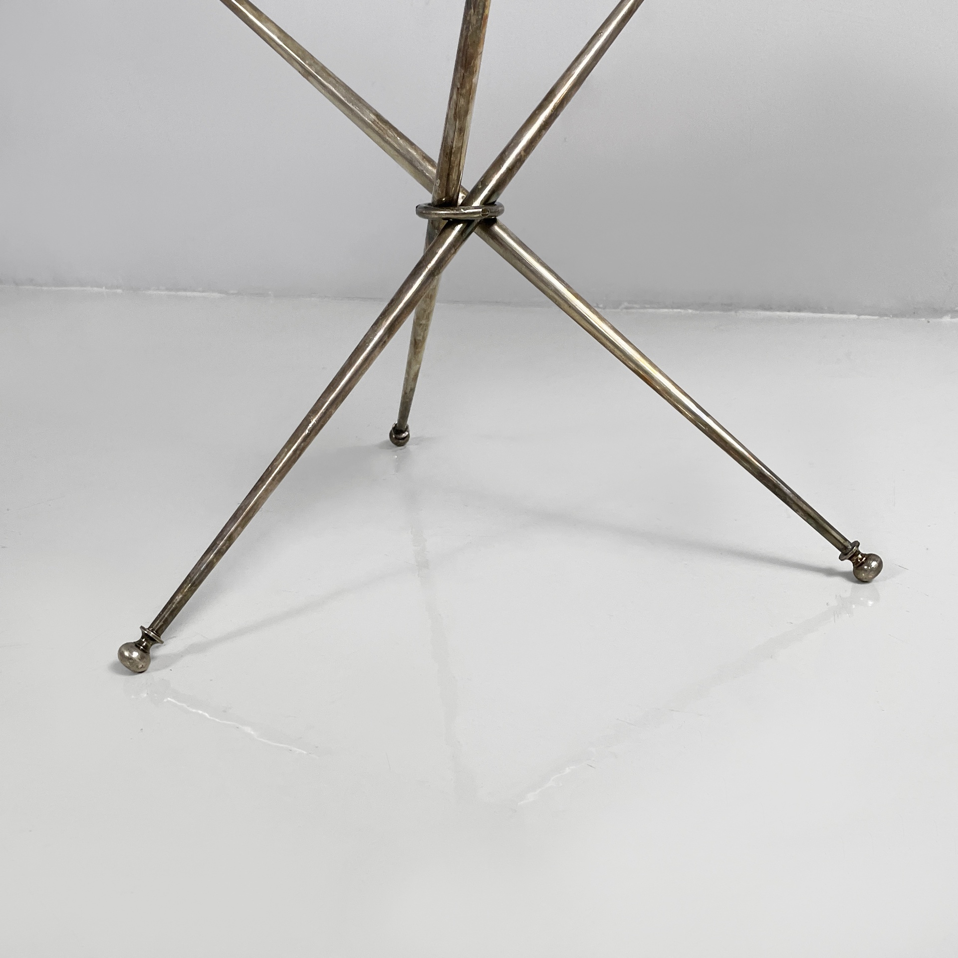 Tavolo da caffè con piano tondo in vetro di grosso spessore. La base è composta da tre tondini di metallo brunito uniti al centro da un anello. Piedini sferici.