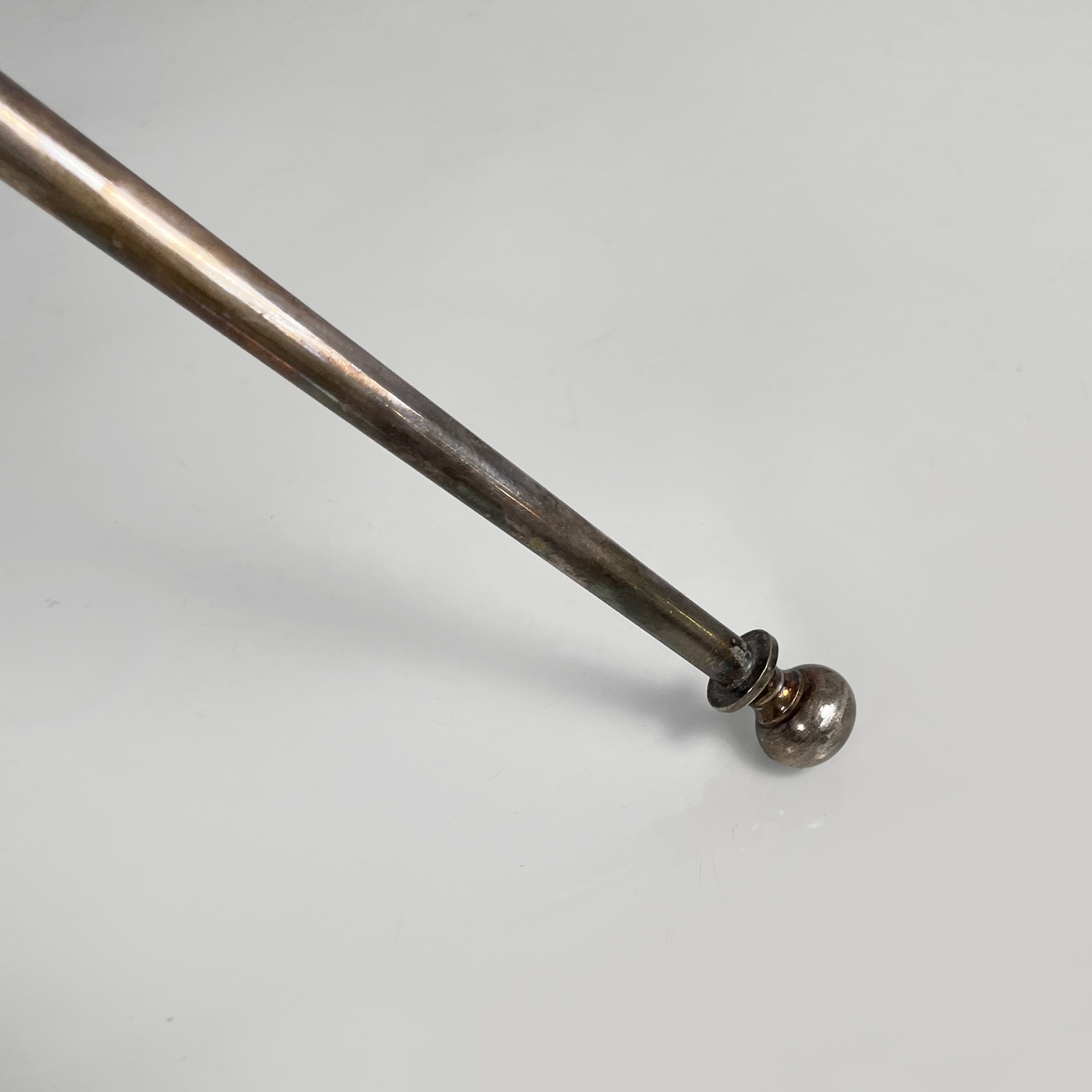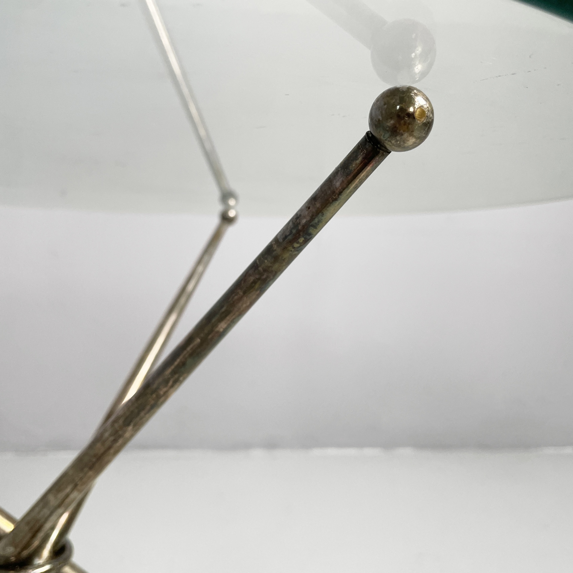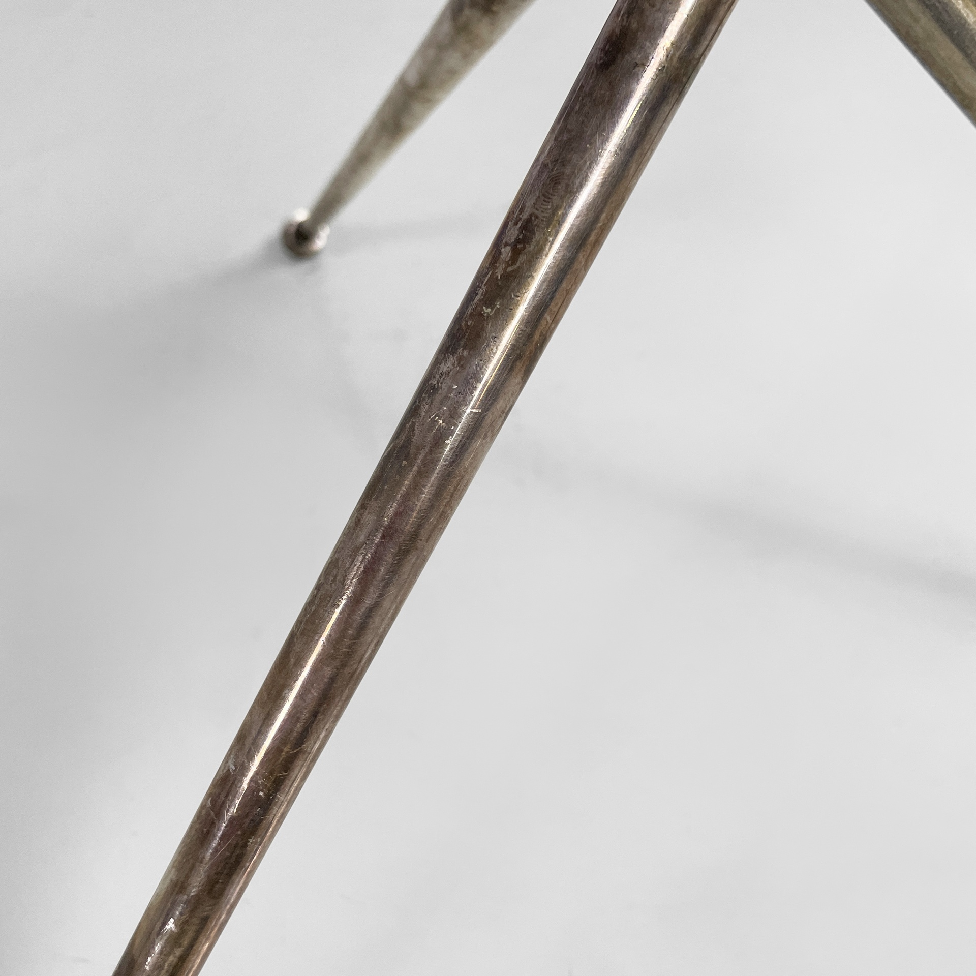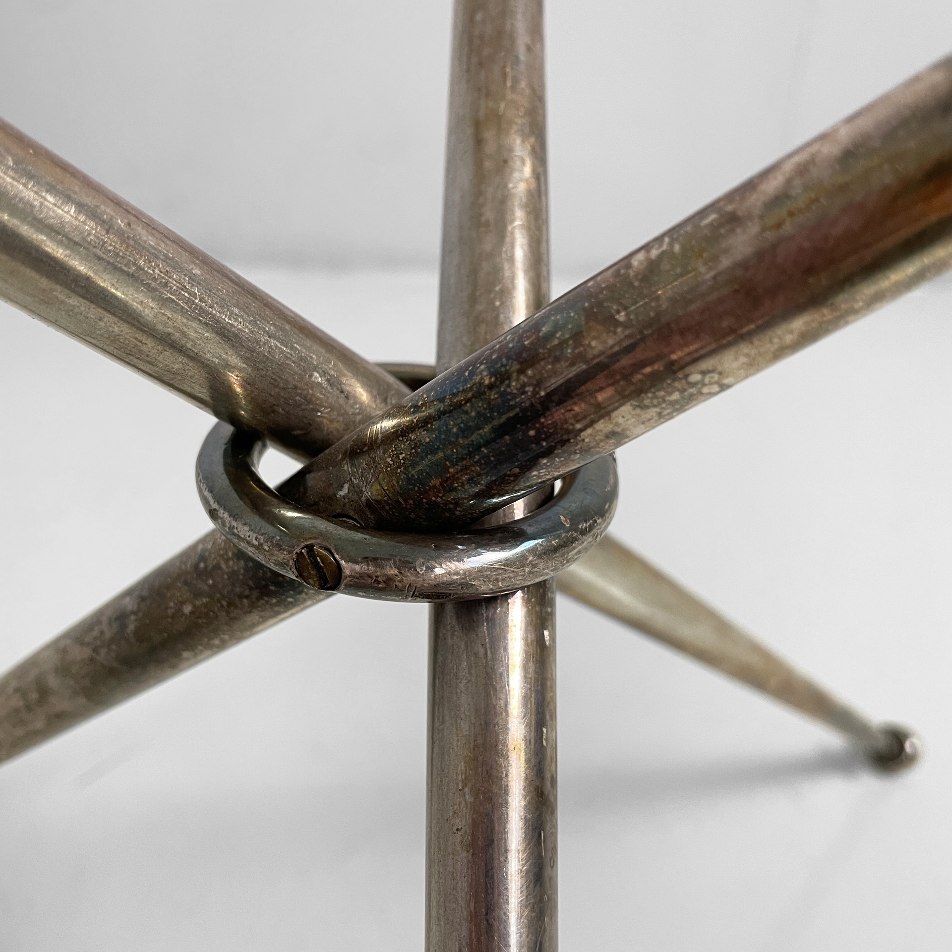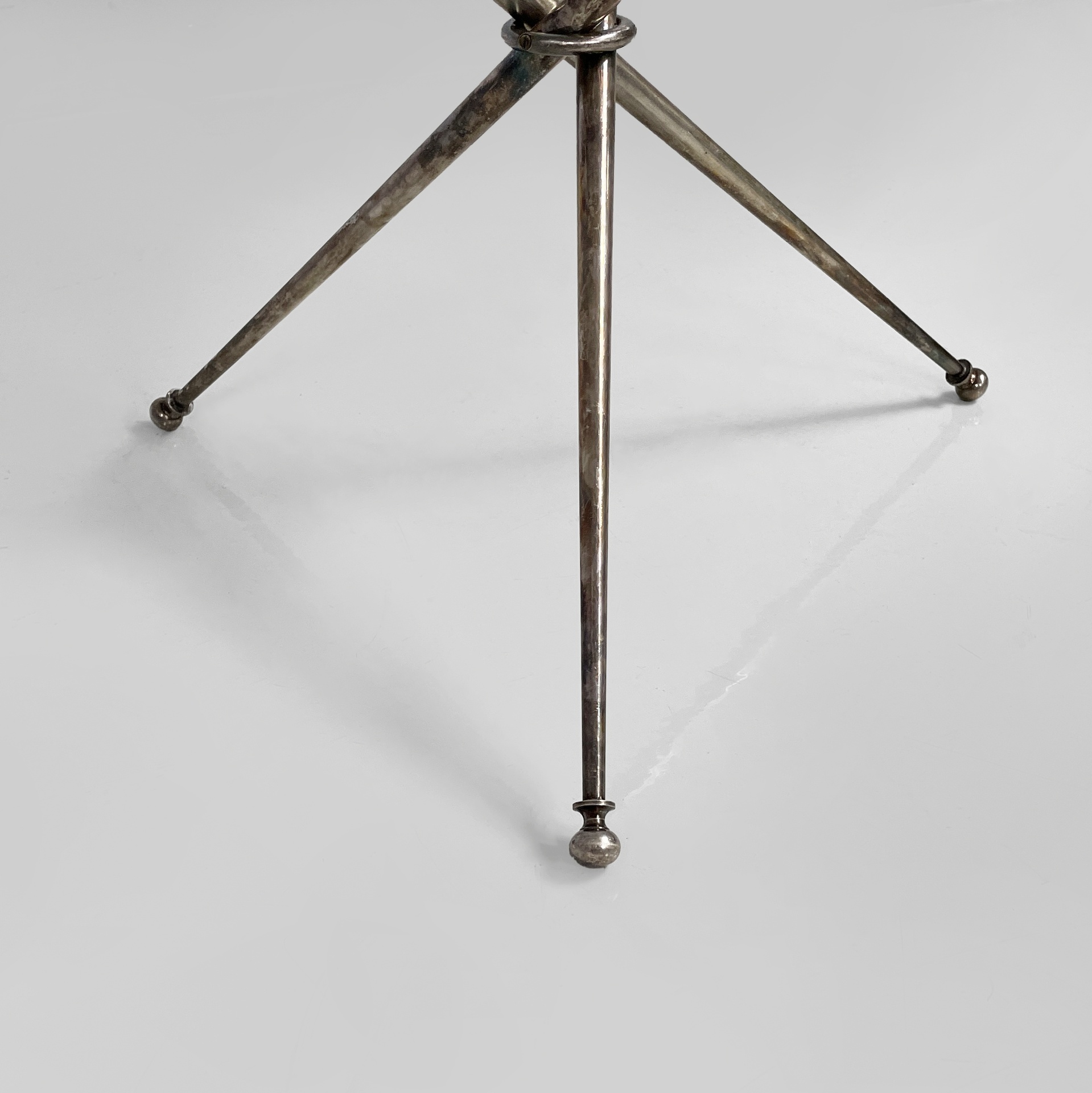 Tavolo da caffè con piano tondo in vetro di grosso spessore. La base è composta da tre tondini di metallo brunito uniti al centro da un anello. Piedini sferici.