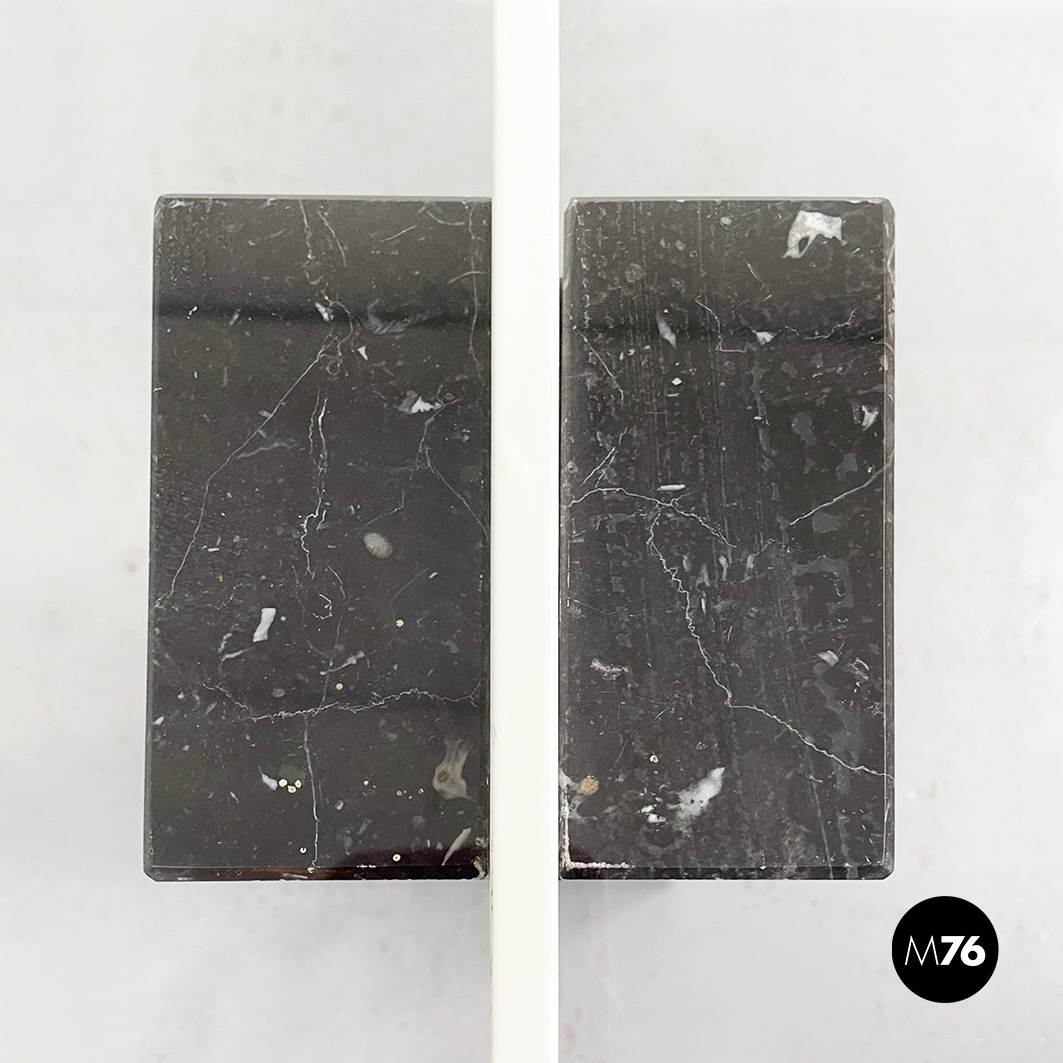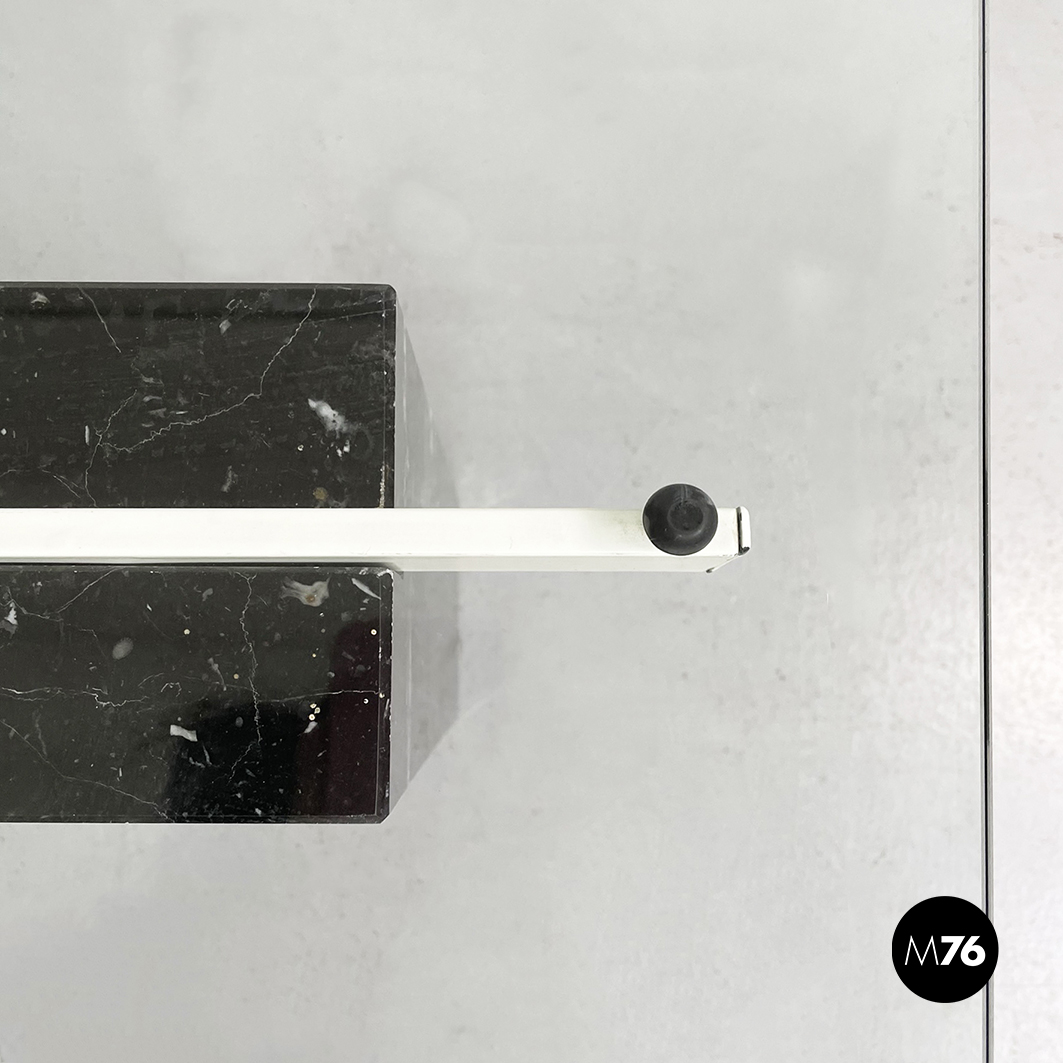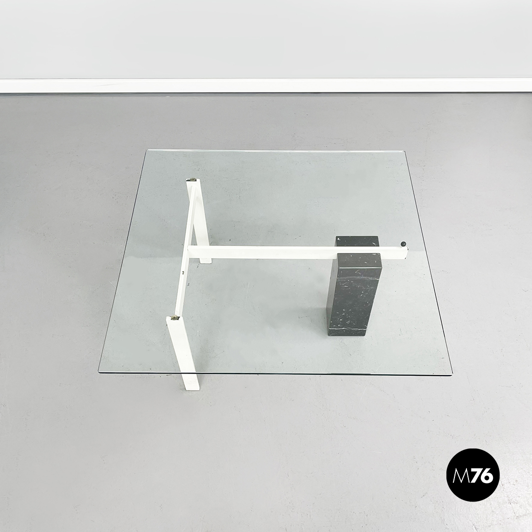 Tavolo da caffè con piano quadrato in vetro ad angoli arrotondati. La struttura è composta da due gambe in ferro verniciato bianco che attraverso una trave orizzontale di ferro si incastra con la terza gamba rettangolare di marmo nero marquinia.