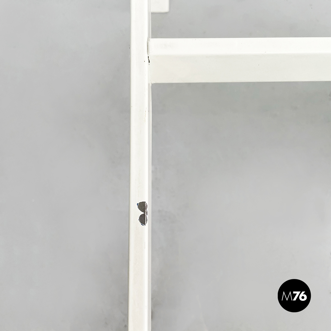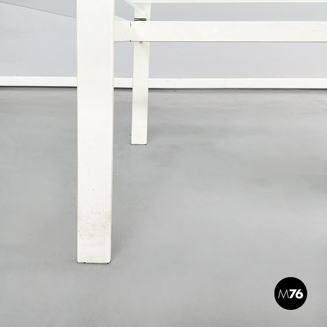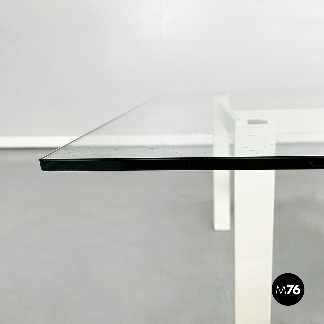 Tavolo da caffè con piano quadrato in vetro ad angoli arrotondati. La struttura è composta da due gambe in ferro verniciato bianco che attraverso una trave orizzontale di ferro si incastra con la terza gamba rettangolare di marmo nero marquinia.