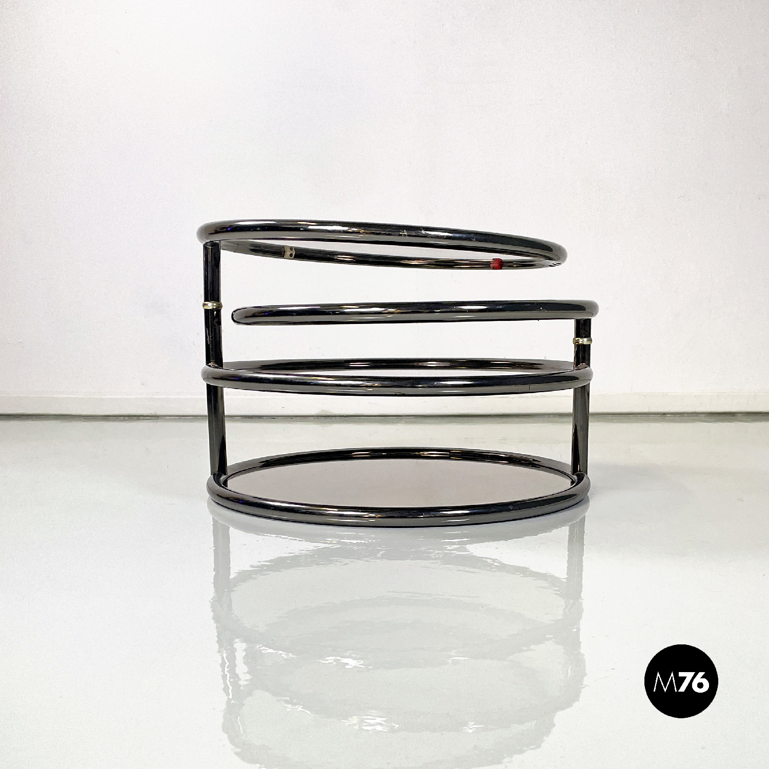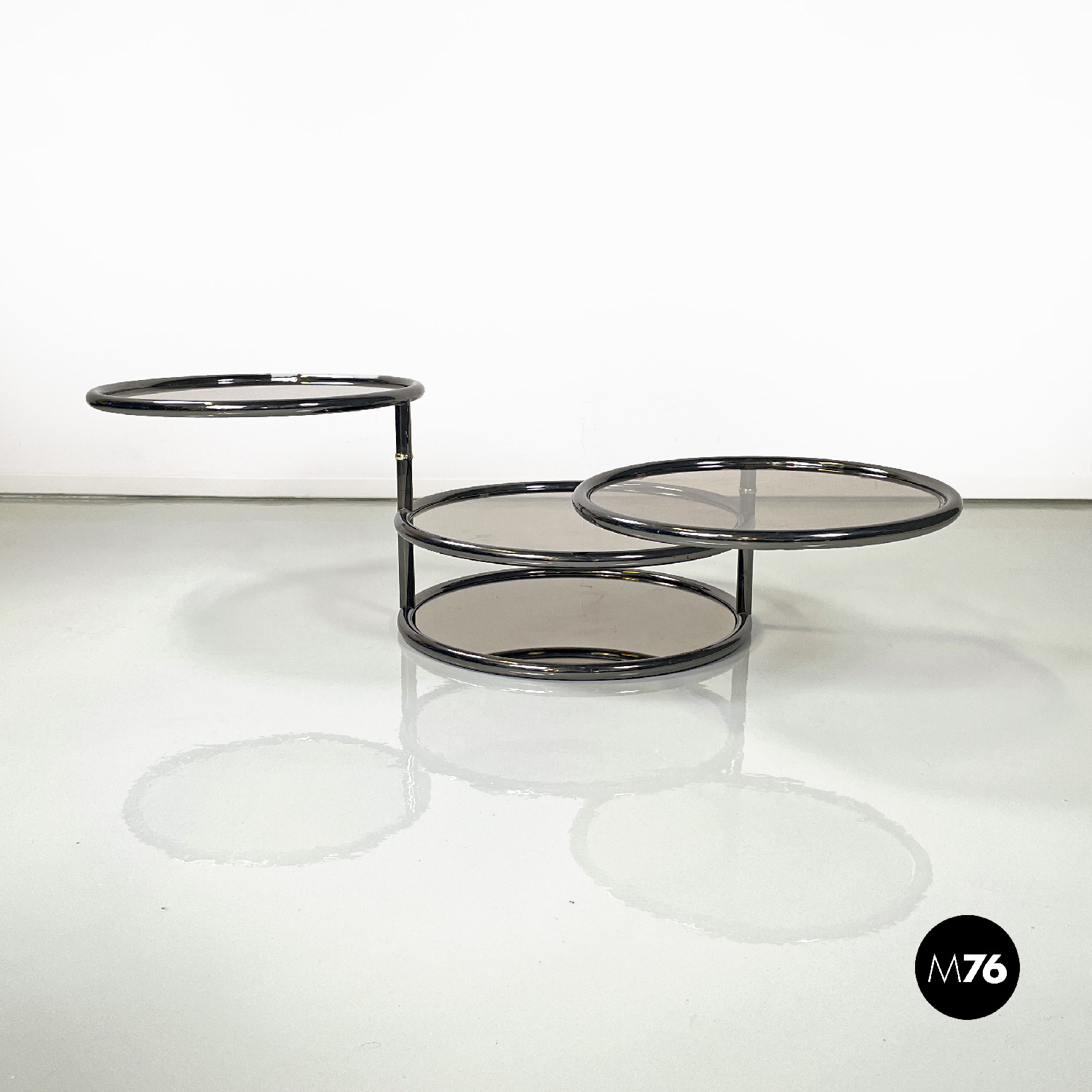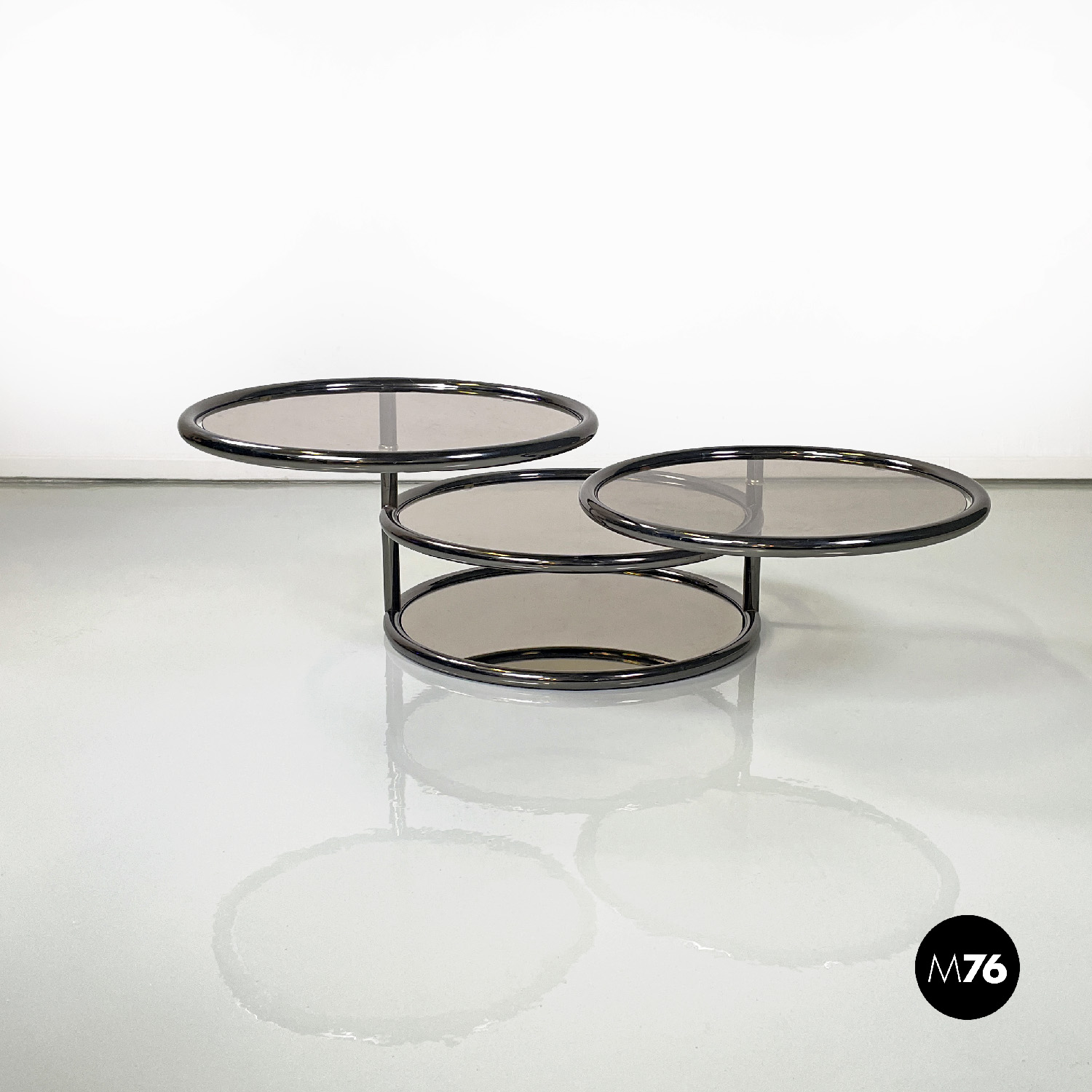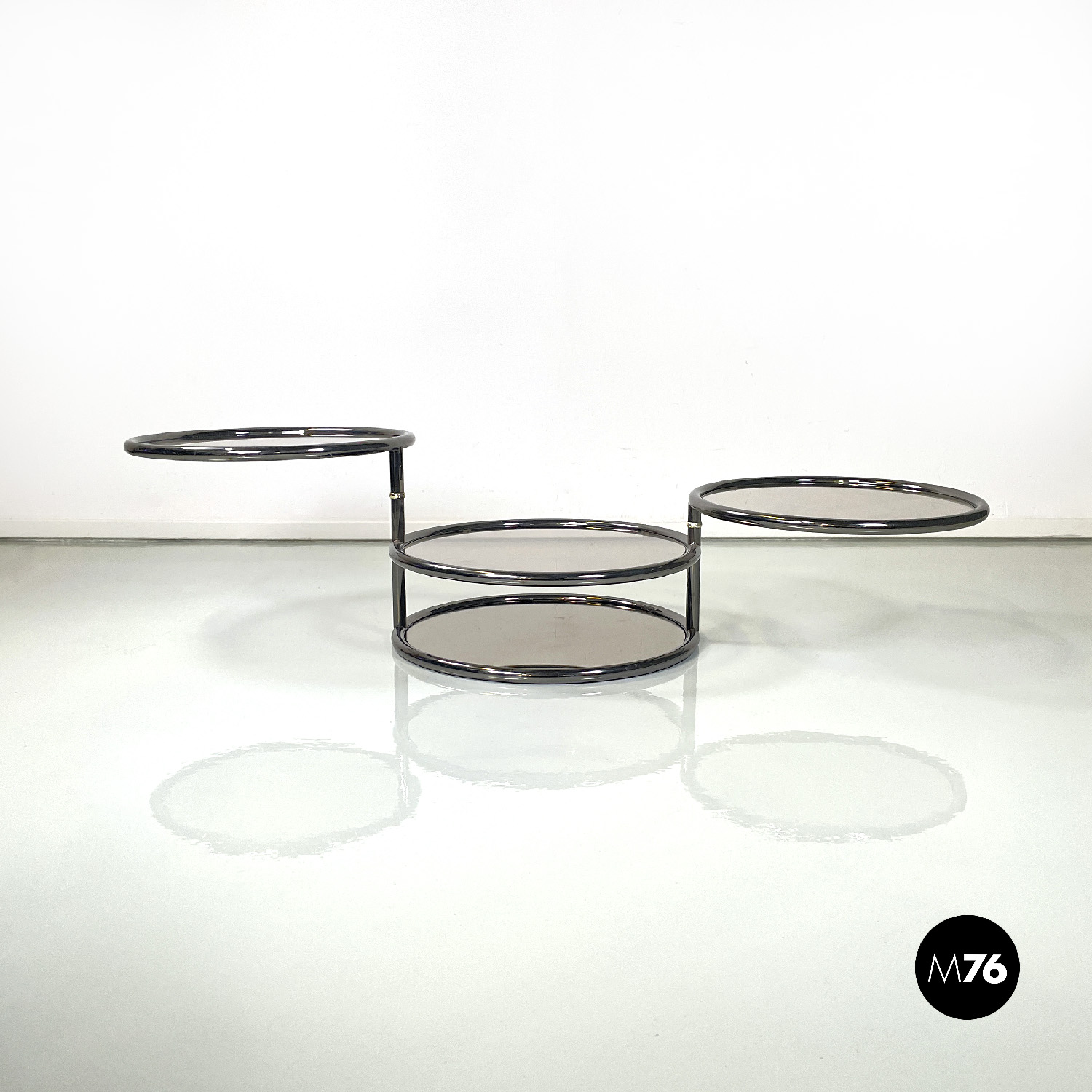 Tavolo da caffè a base tonda con struttura in tubolare di metallo cromato scuro. Il tavolo è composto da quattro piani in vetro fumé di cui i due superiori estraibili quello più in basso è specchiato. I due piani superiori sono girevoli.