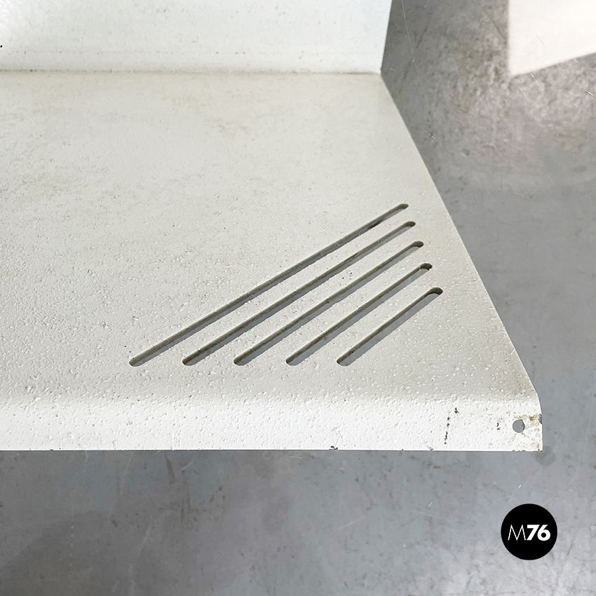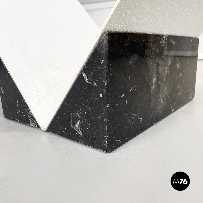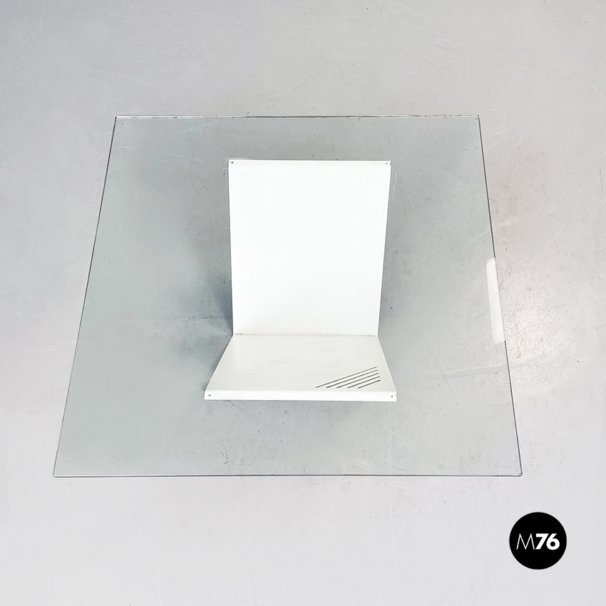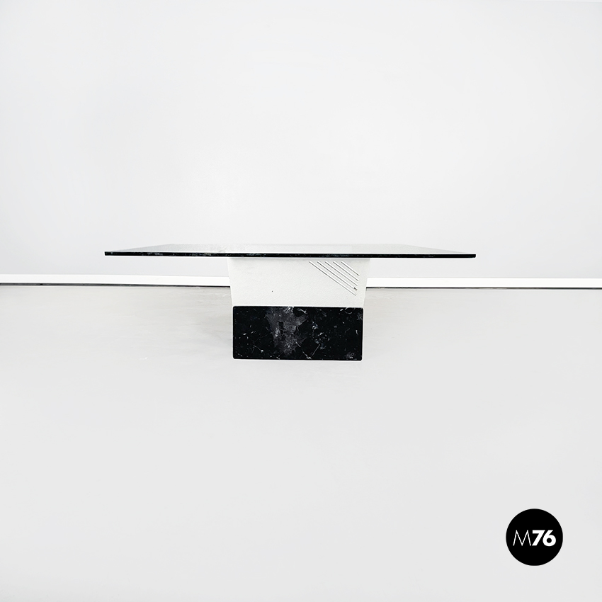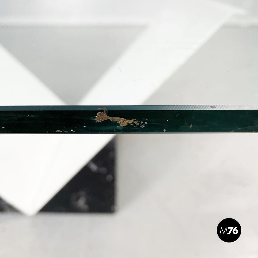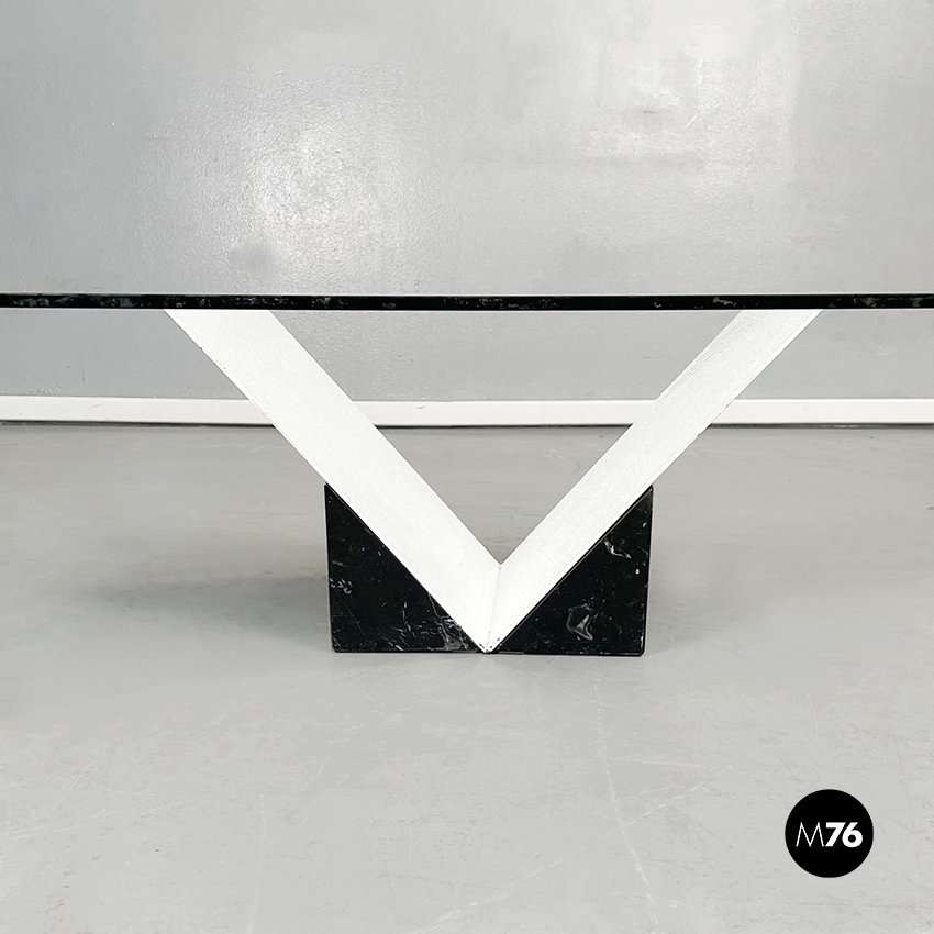Tavolo da caffè con piano quadrato in vetro spesso. La base è formata da una struttura a V in metallo verniciato bianco incastrato in blocco di marmo nero marquinia.