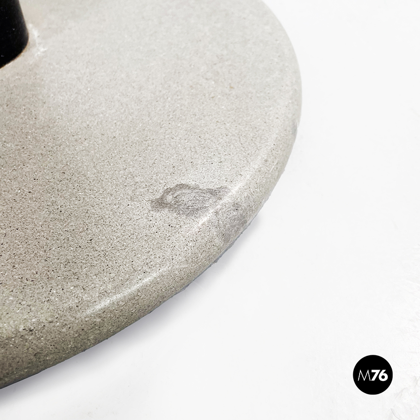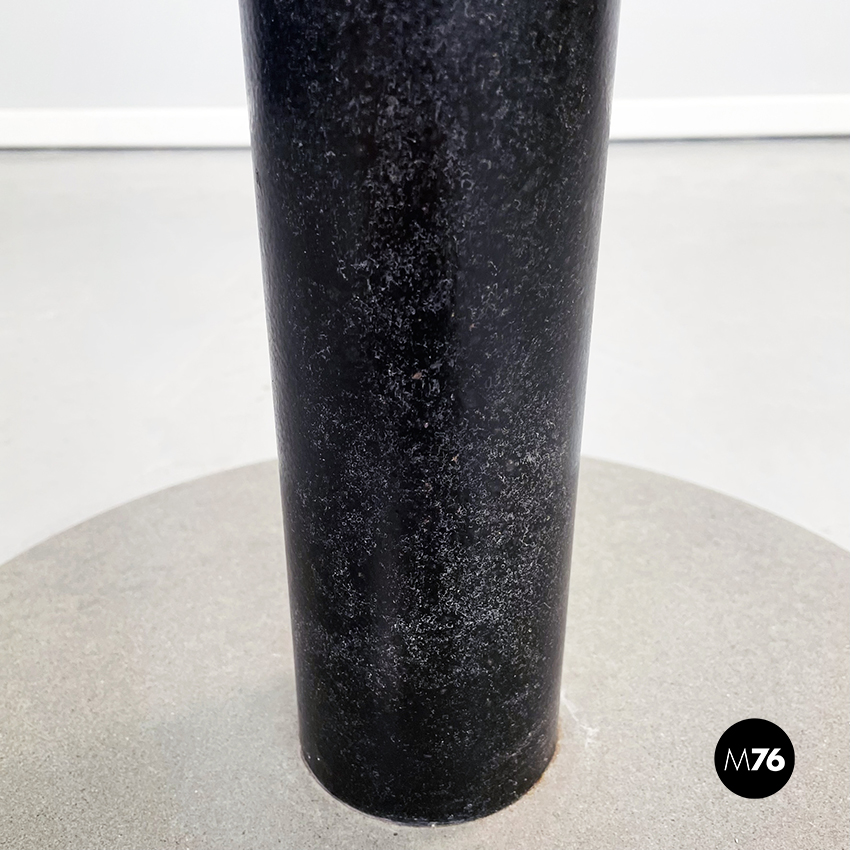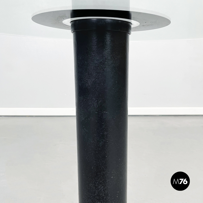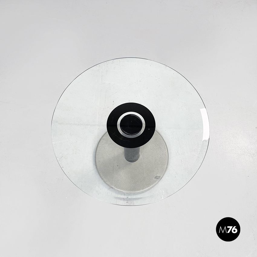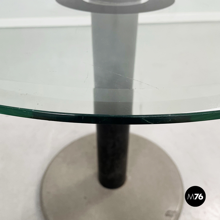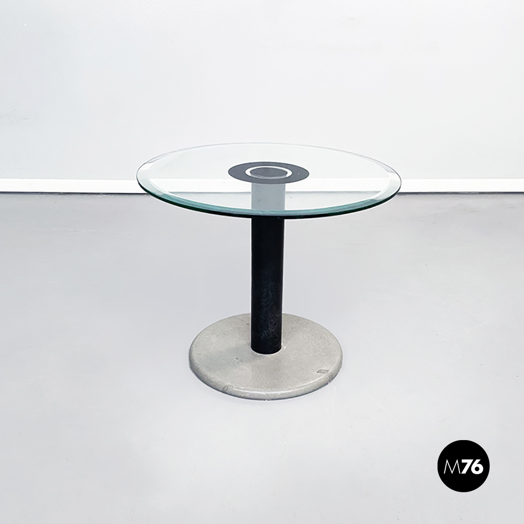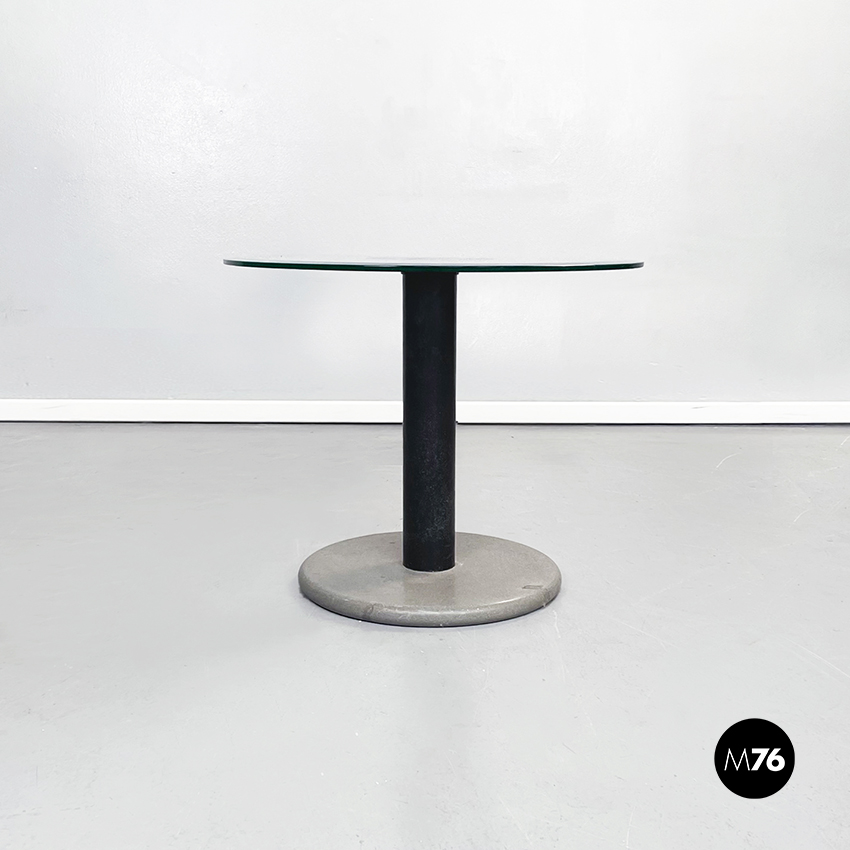 Tavolo da caffè con piano tondo in vetro ed al centro due cerchi concentrici neri. Il piano è sostenuto da un cilindro in metallo nero. Base tonda in pietra levigata.