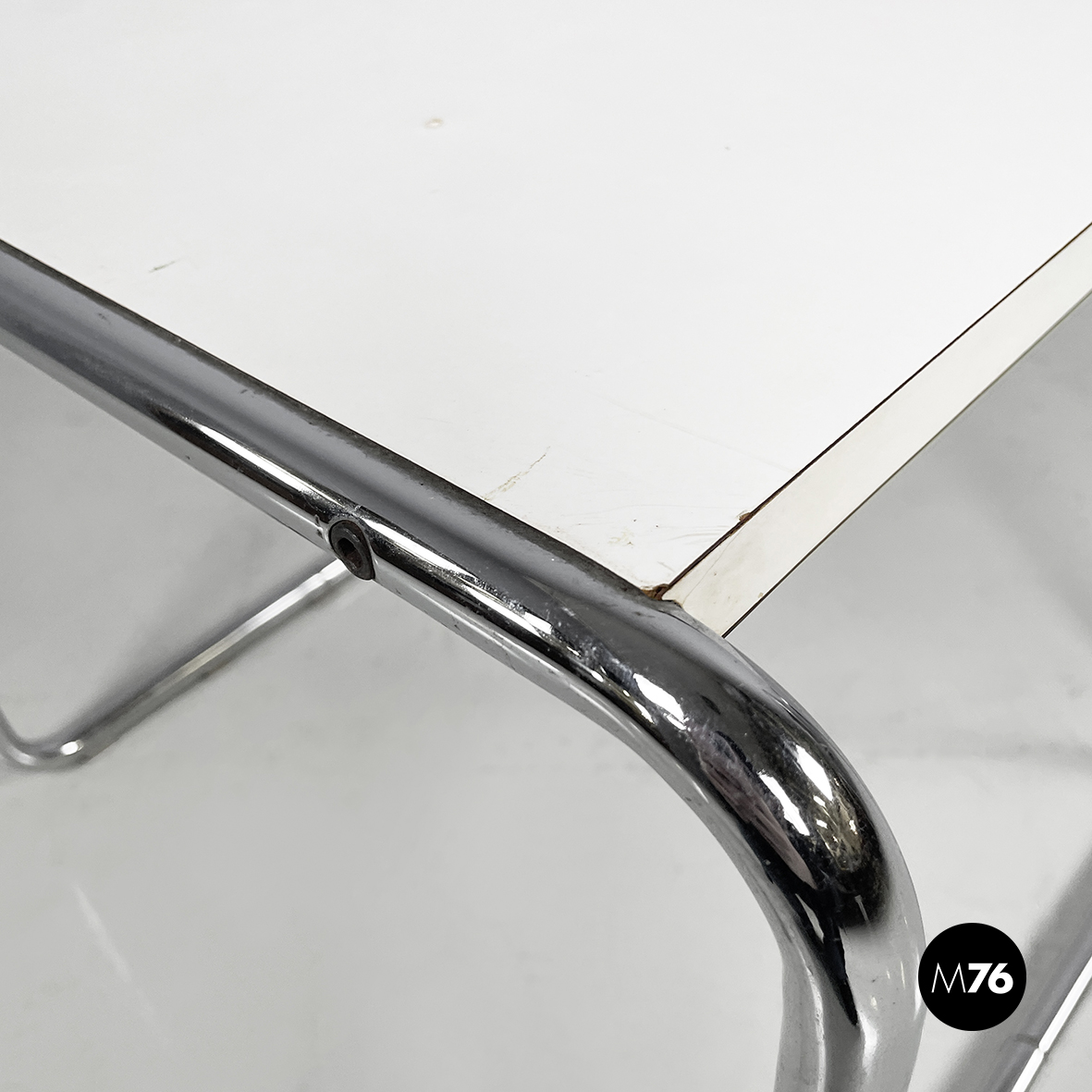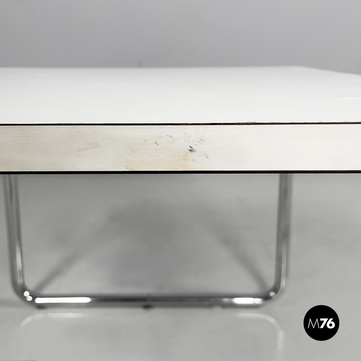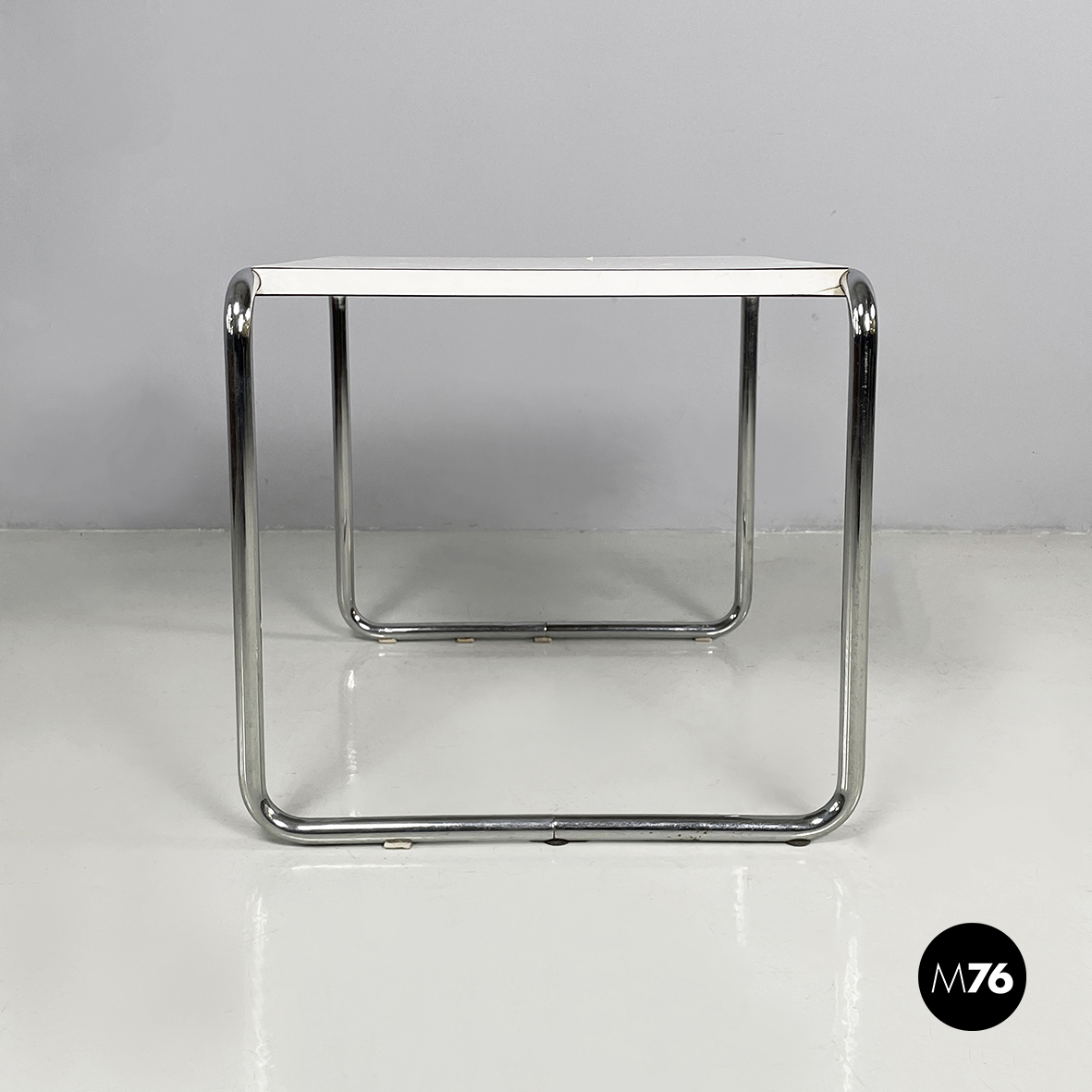 Coffee table mod. Laccio with squared top in white painted wood. The structure is in chromed tubular steel.