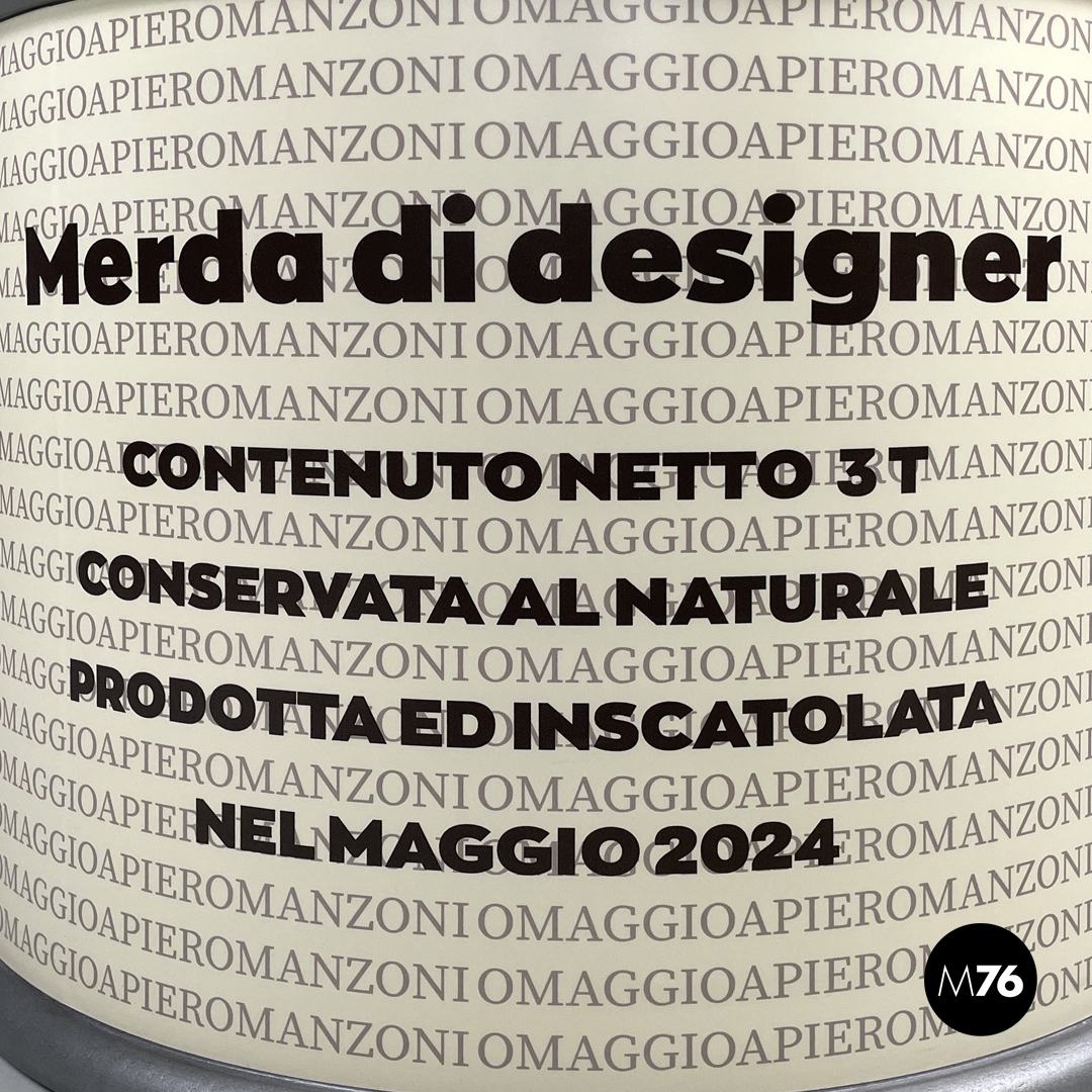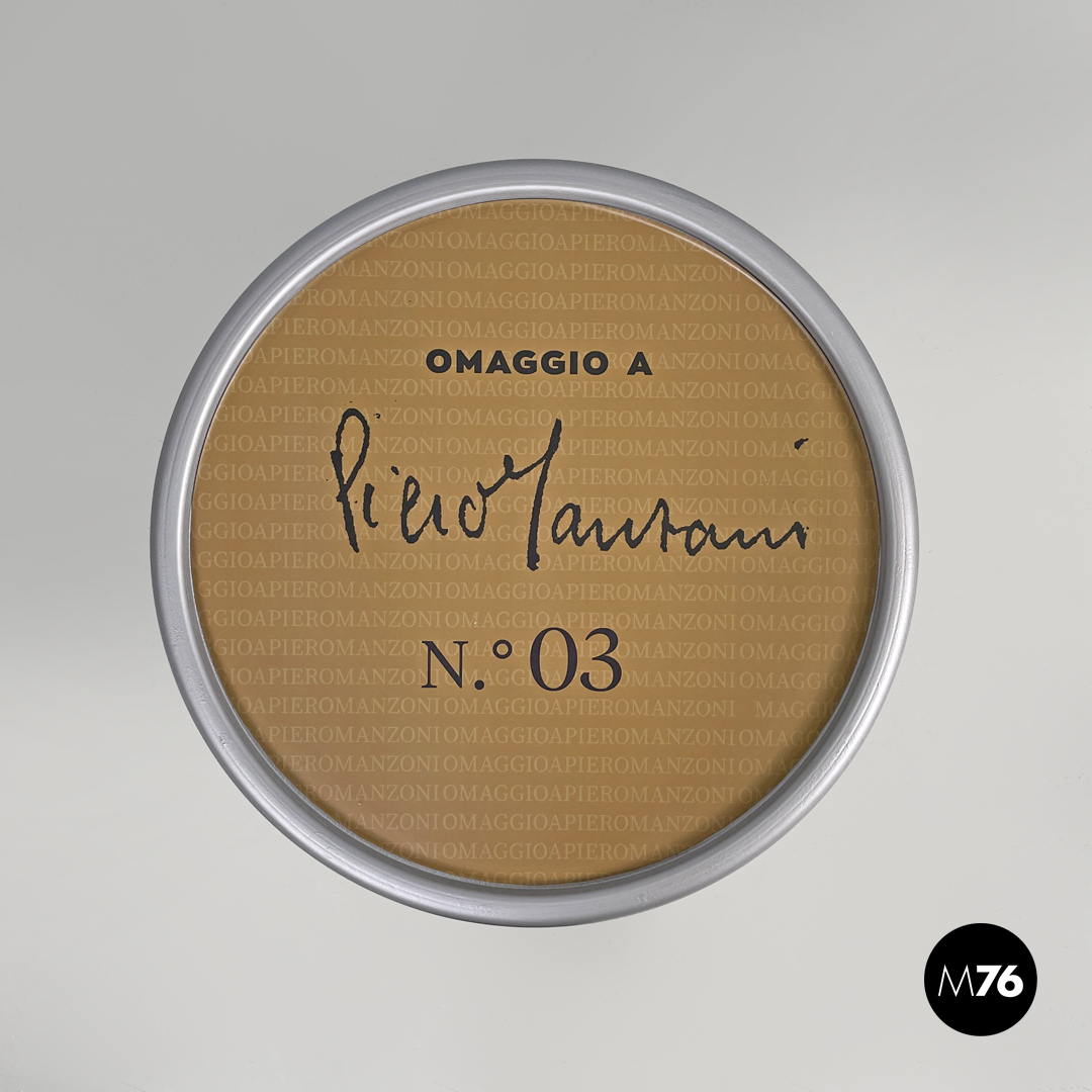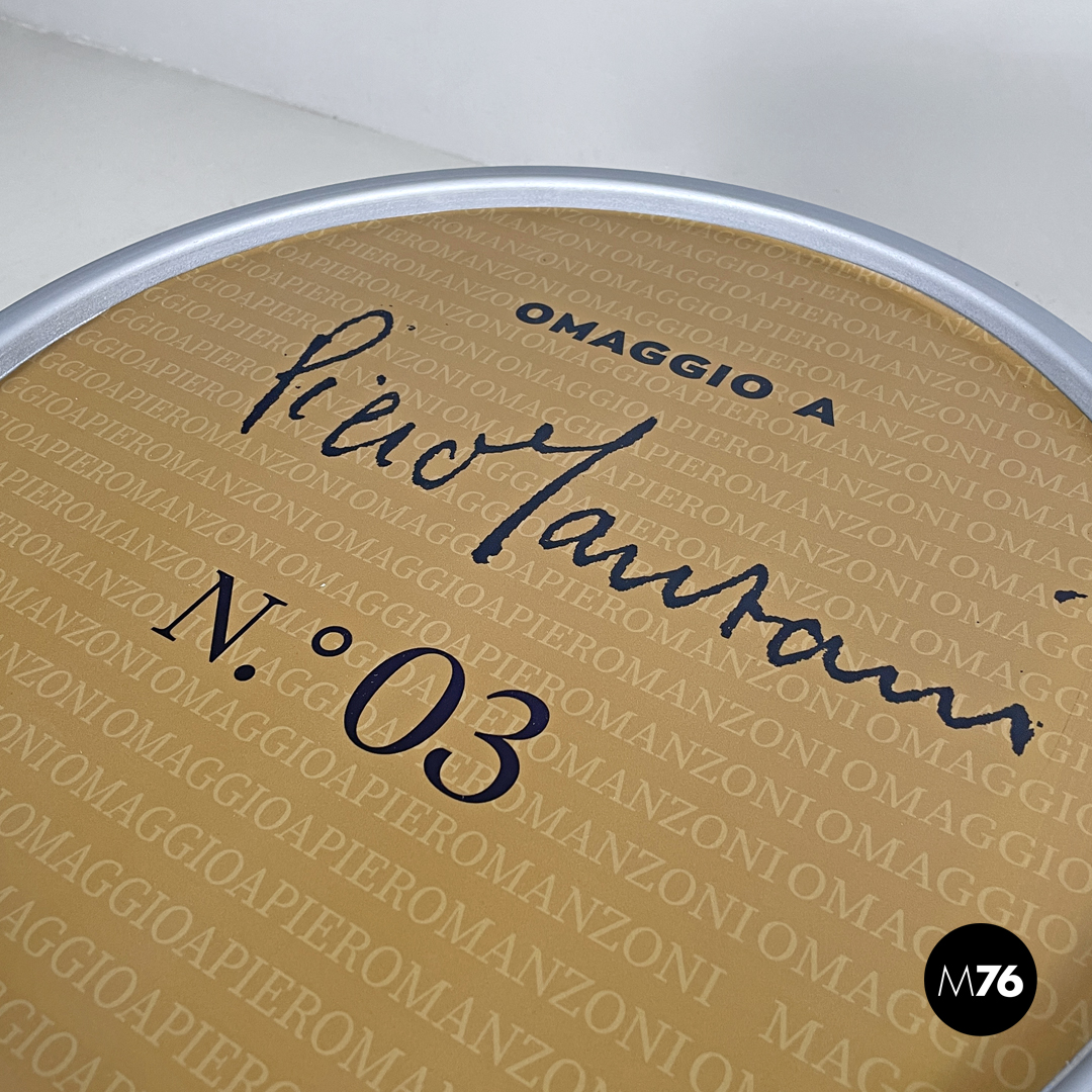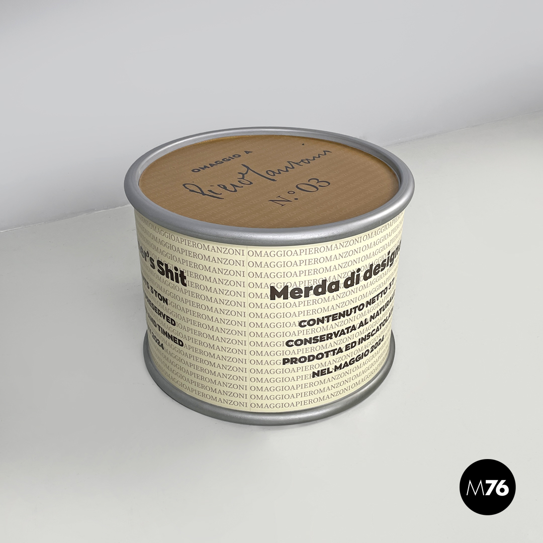 Tavolo da caffè modello Merda di Designer tondo in legno. Il bordo del piano e della base sono tondeggianti e verniciati color argento. La struttura è rivestita di plastica stampata sul piano si trova la scritta “omaggio a Piero Manzoni n° 03” in nero su sfondo giallo senape scuro con scritta in filigrana “omaggio a Piero Manzoni” in un giallo leggermente più chiaro. Sui fianchi del tavolo si trova “Merda di designer contenuto netto 3T conservata al naturale prodotta ed inscatolata nel maggio 2024” anch’essa in nero su sfondo giallo chiaro con scritta grigia in filigrana. Questo testo è riportato in lingua italiana inglese francese e tedesca.