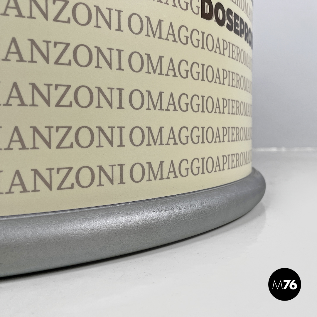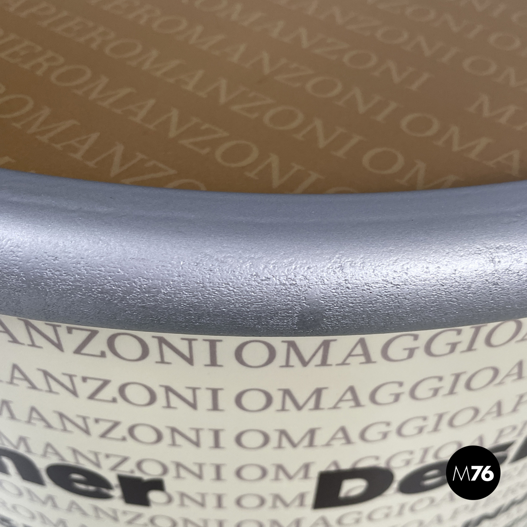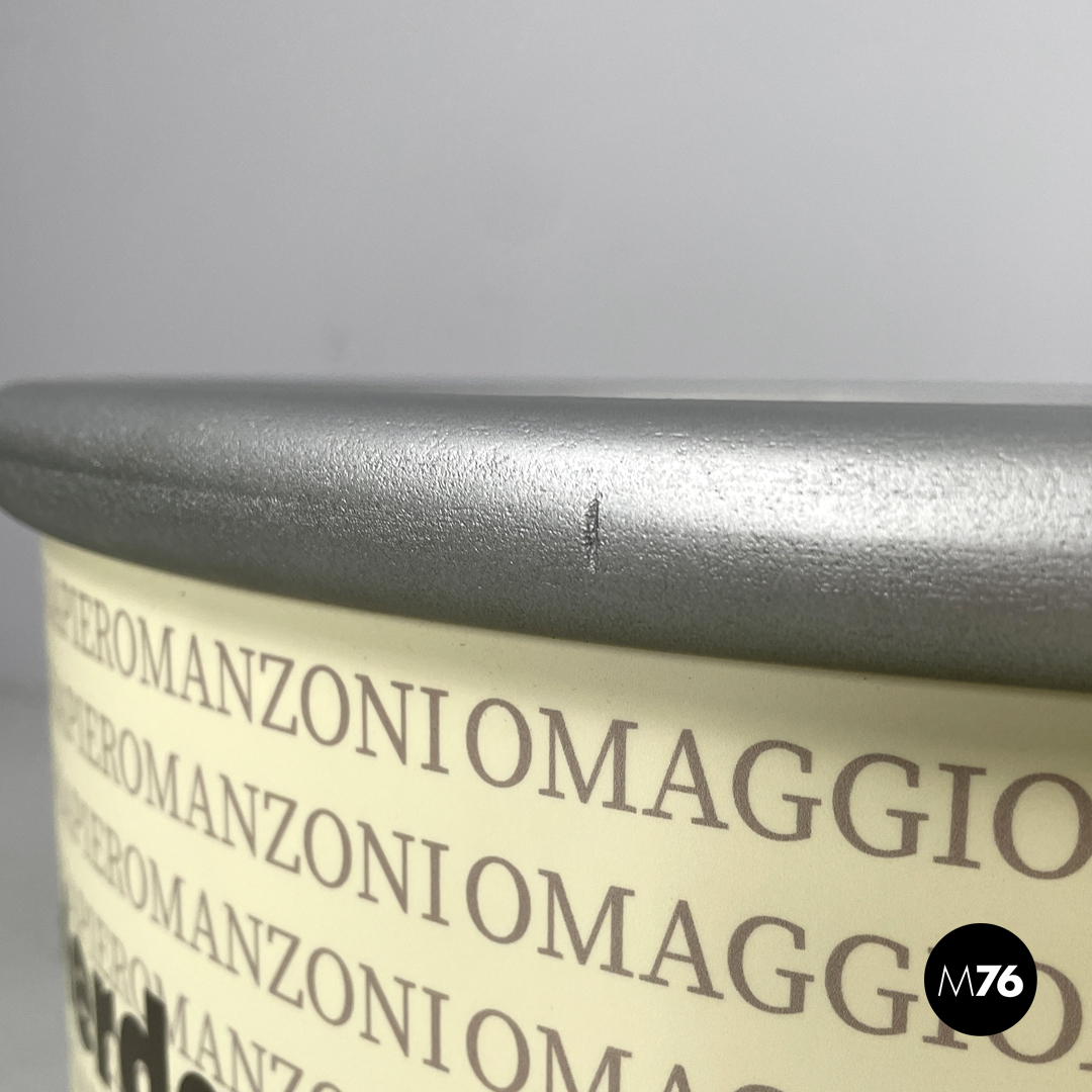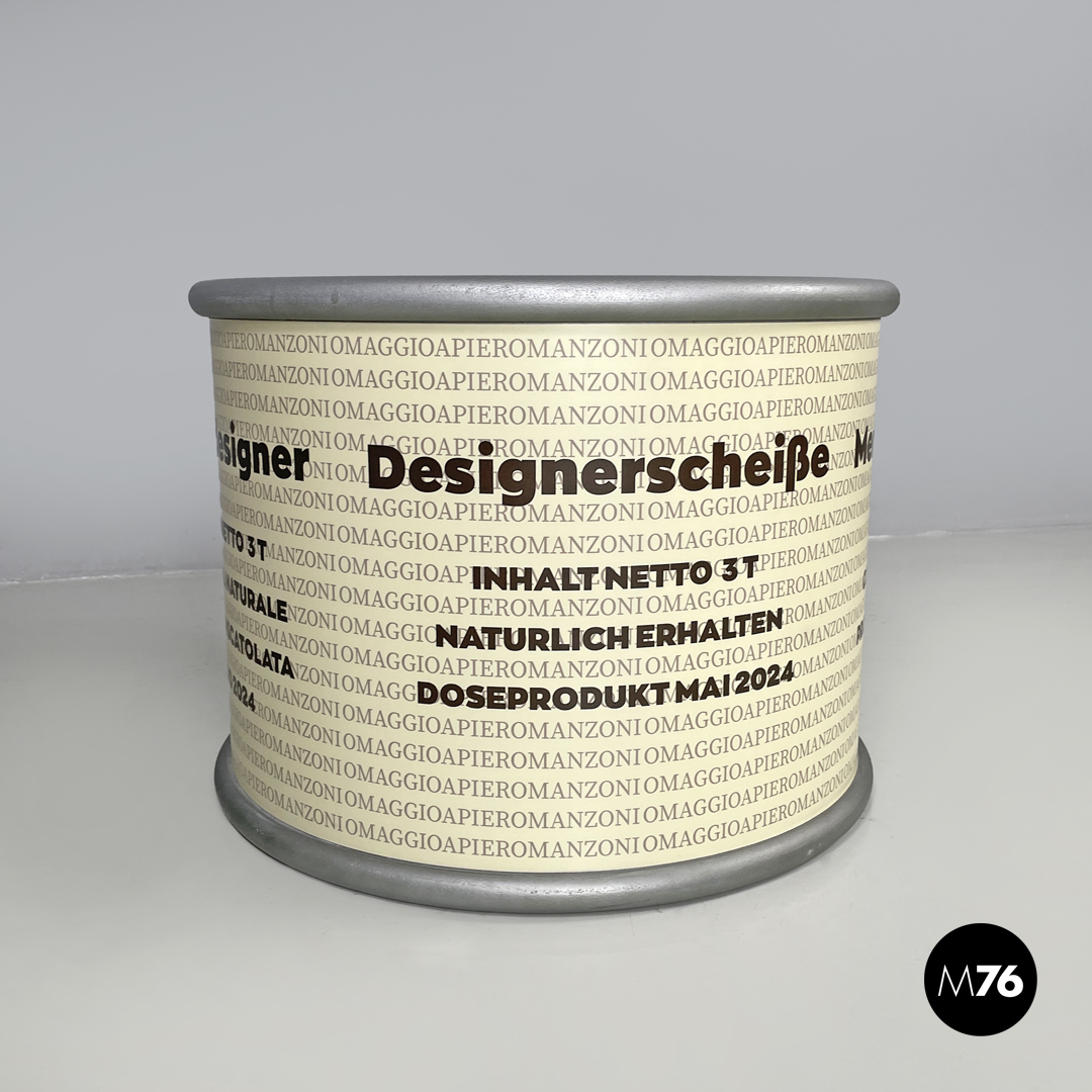 Tavolo da caffè modello Merda di Designer tondo in legno. Il bordo del piano e della base sono tondeggianti e verniciati color argento. La struttura è rivestita di plastica stampata sul piano si trova la scritta “omaggio a Piero Manzoni n° 03” in nero su sfondo giallo senape scuro con scritta in filigrana “omaggio a Piero Manzoni” in un giallo leggermente più chiaro. Sui fianchi del tavolo si trova “Merda di designer contenuto netto 3T conservata al naturale prodotta ed inscatolata nel maggio 2024” anch’essa in nero su sfondo giallo chiaro con scritta grigia in filigrana. Questo testo è riportato in lingua italiana inglese francese e tedesca.