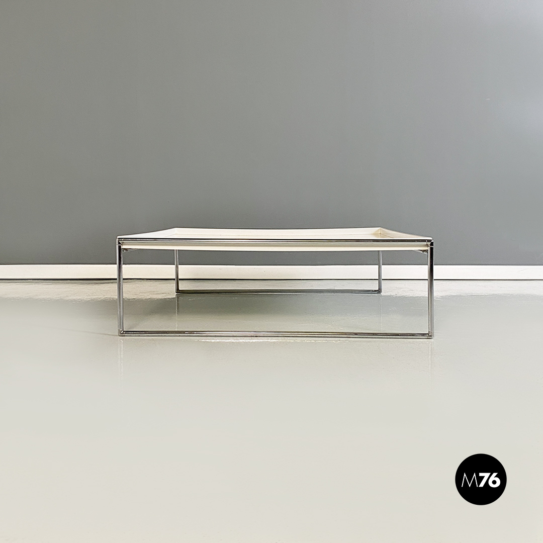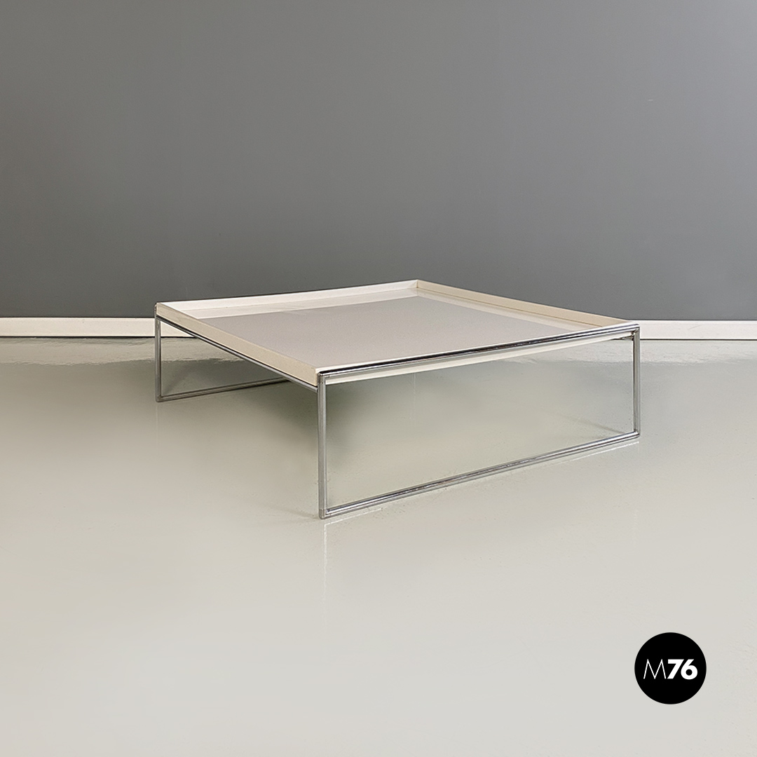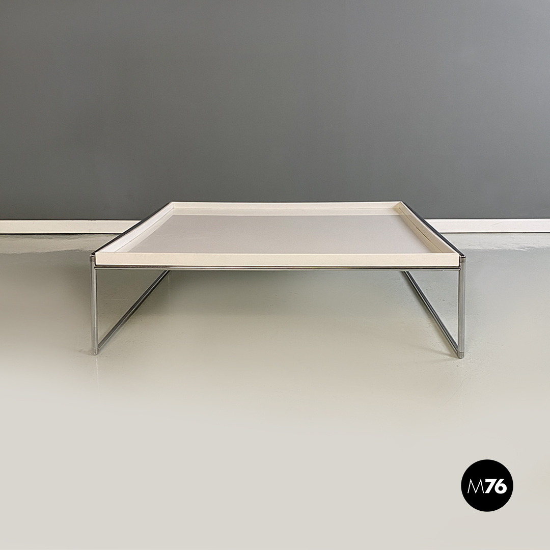 Tavolo da caffè modello Trays con piano a vassoio quadrato in plastica bianca. La struttura è in tondino di acciaio cromato.