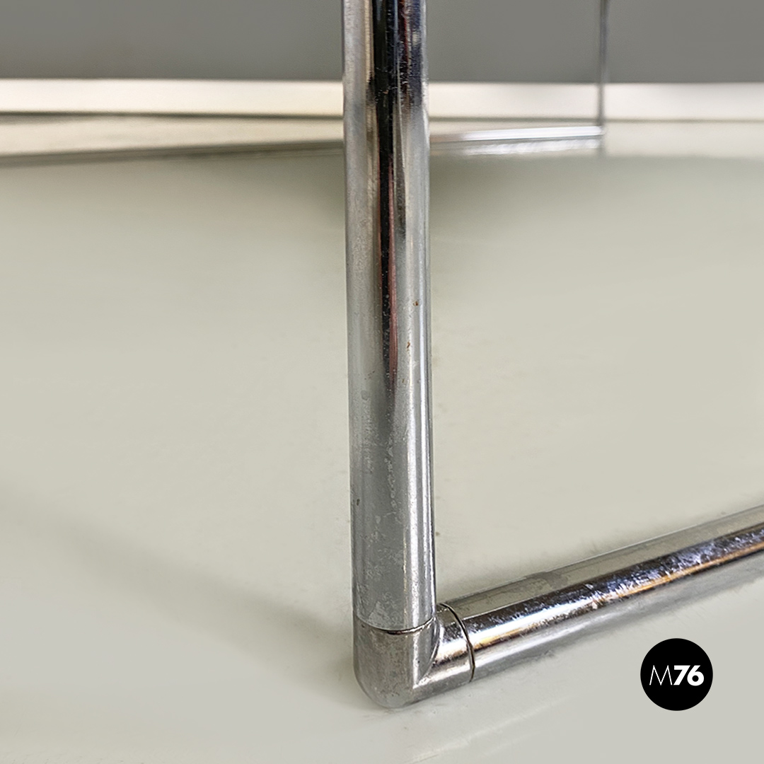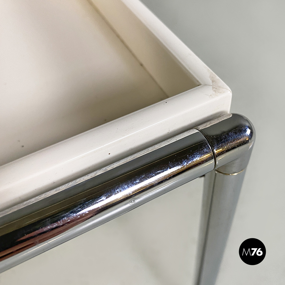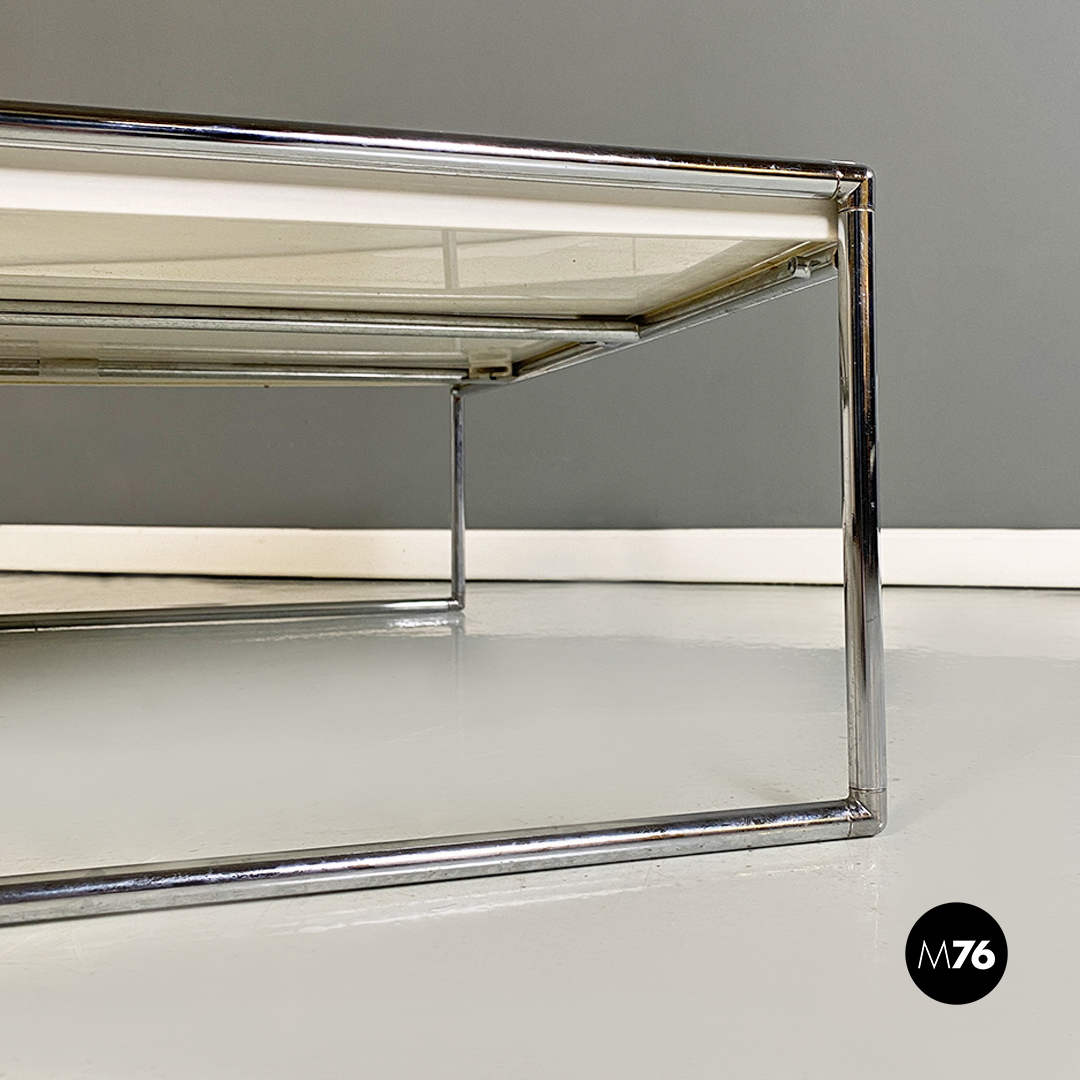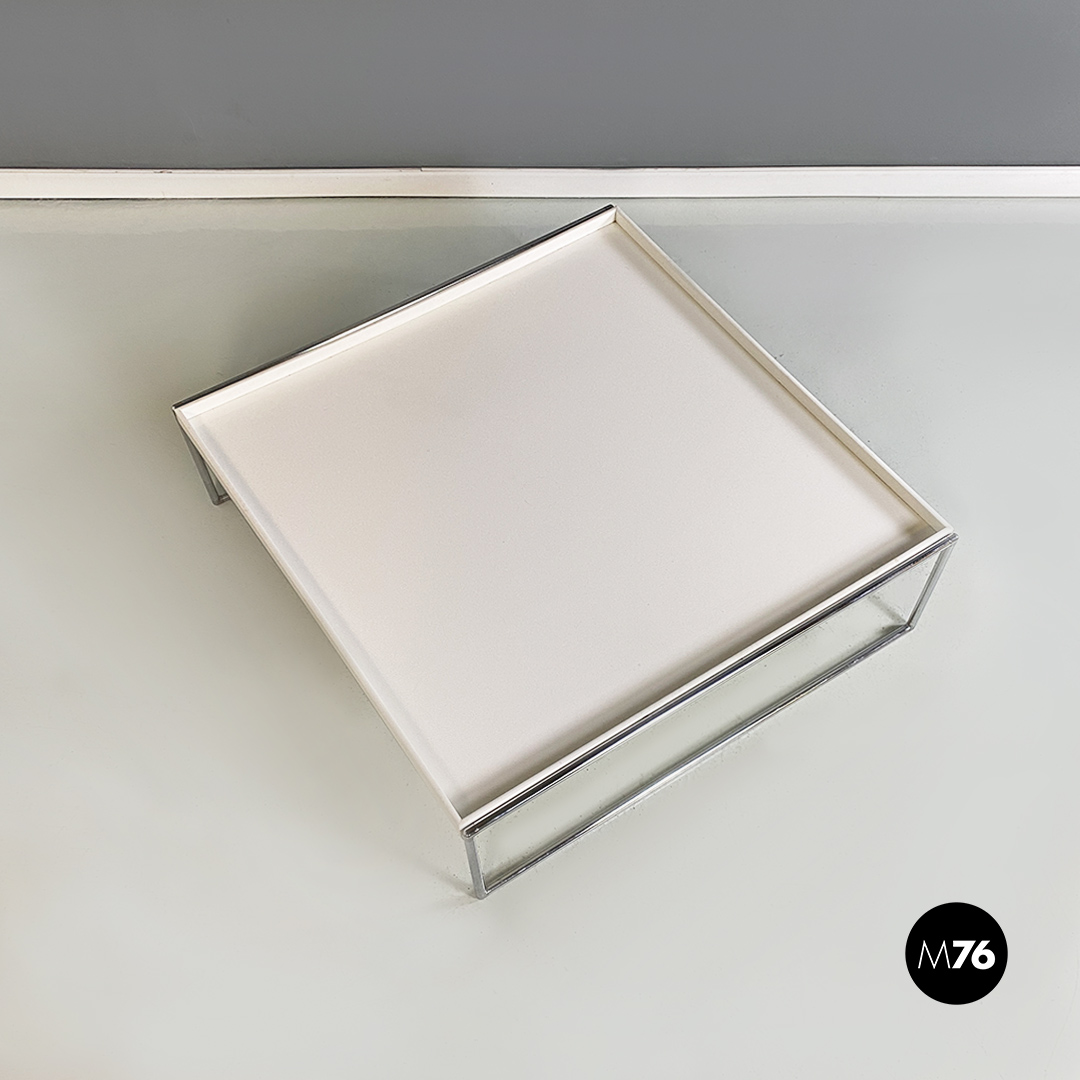 Tavolo da caffè modello Trays con piano a vassoio quadrato in plastica bianca. La struttura è in tondino di acciaio cromato.