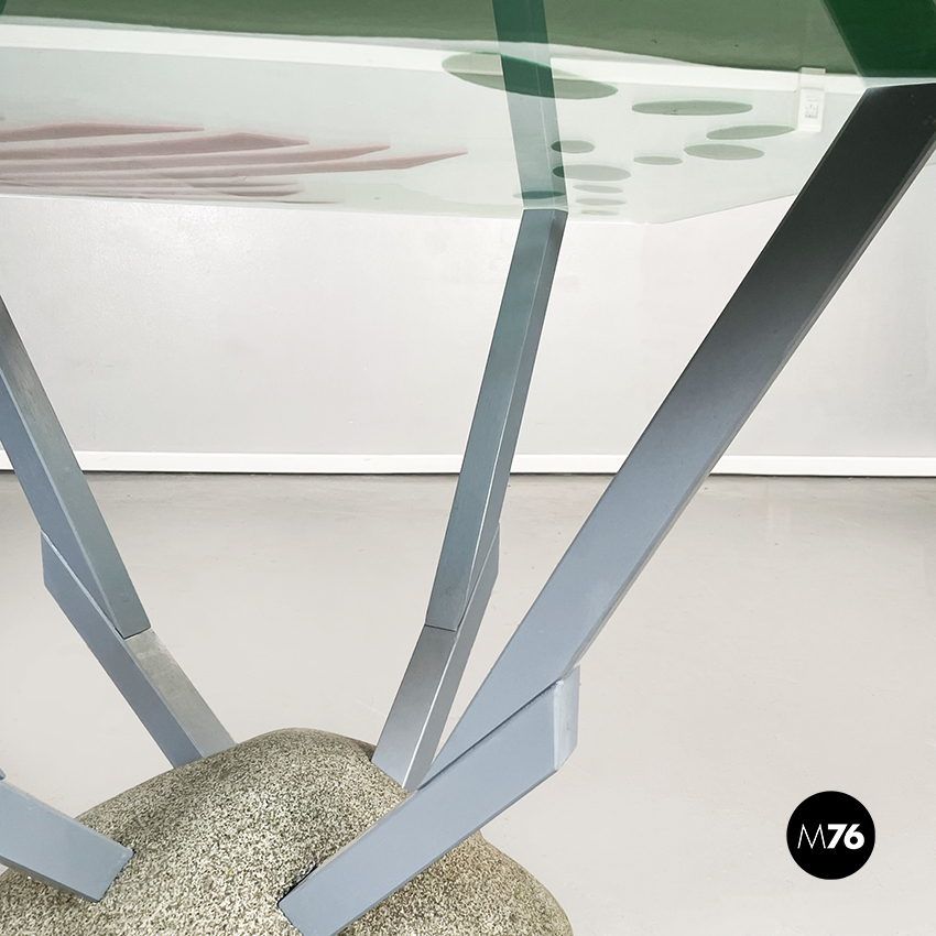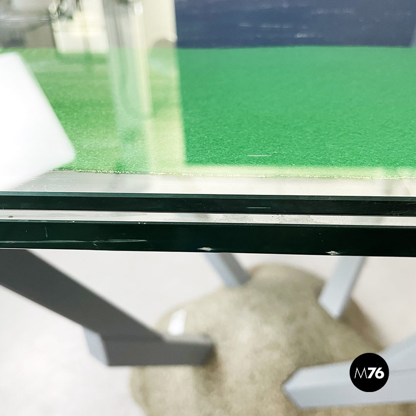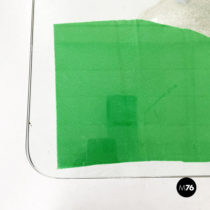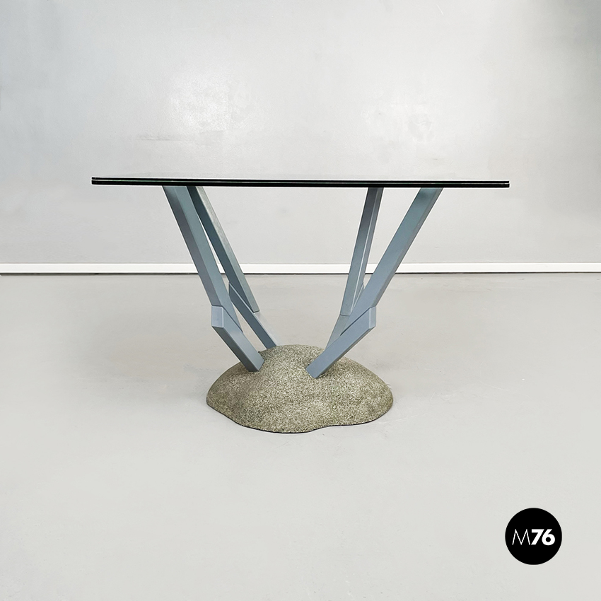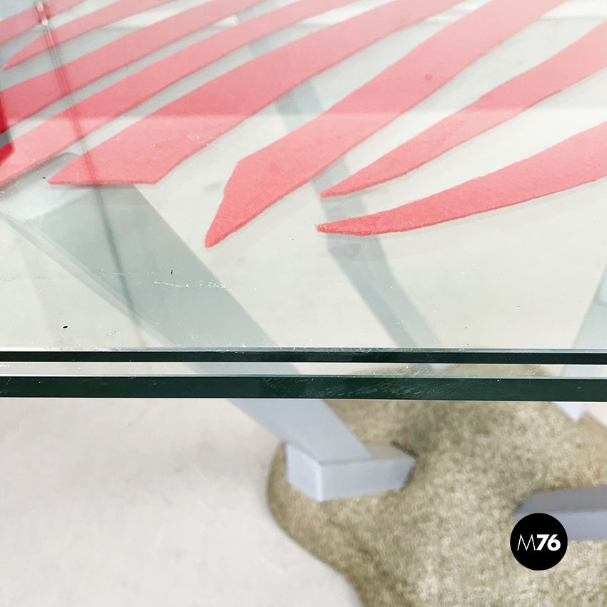 Tavolo da pranzo modello Artifici con piano quadrato ad angoli arrotondati in vetro. Il piano è composto da due lastre di vetro sovrapposte nel cui mezzo sono presenti dei ritagli di tessuto rosso e verde. Le quattro gambe che sorreggono il piano sono in legno verniciato grigio e si incastrano alla base in sabbia grani di quarzo ceramicati e poliestere.
