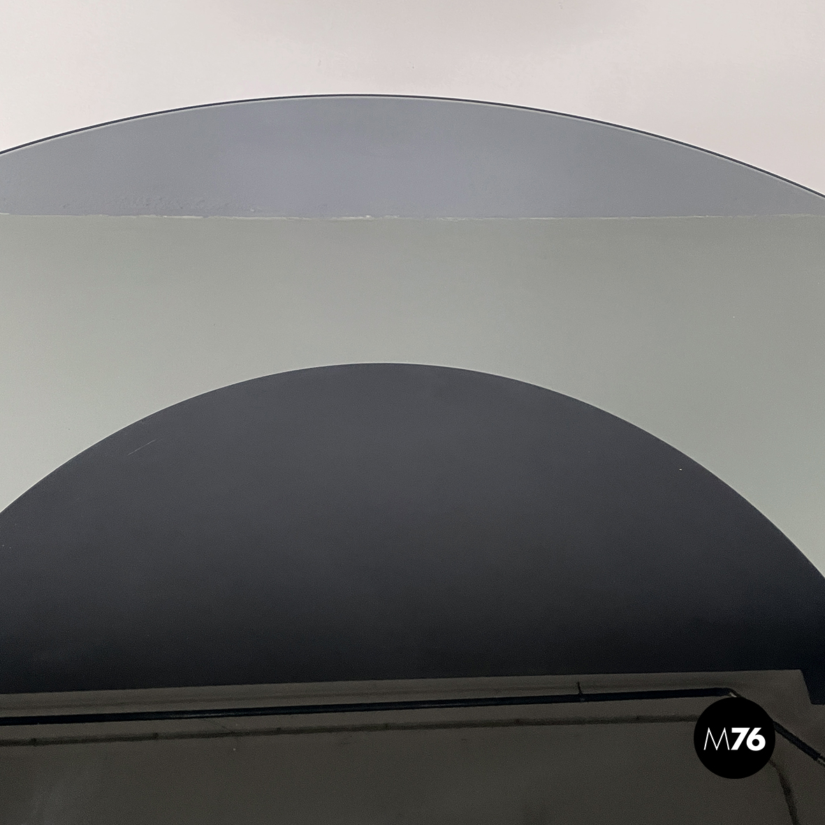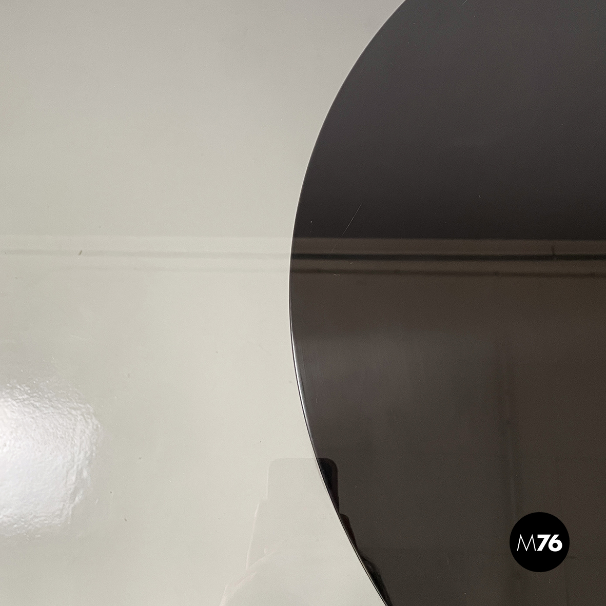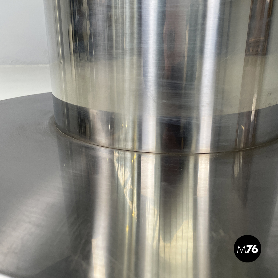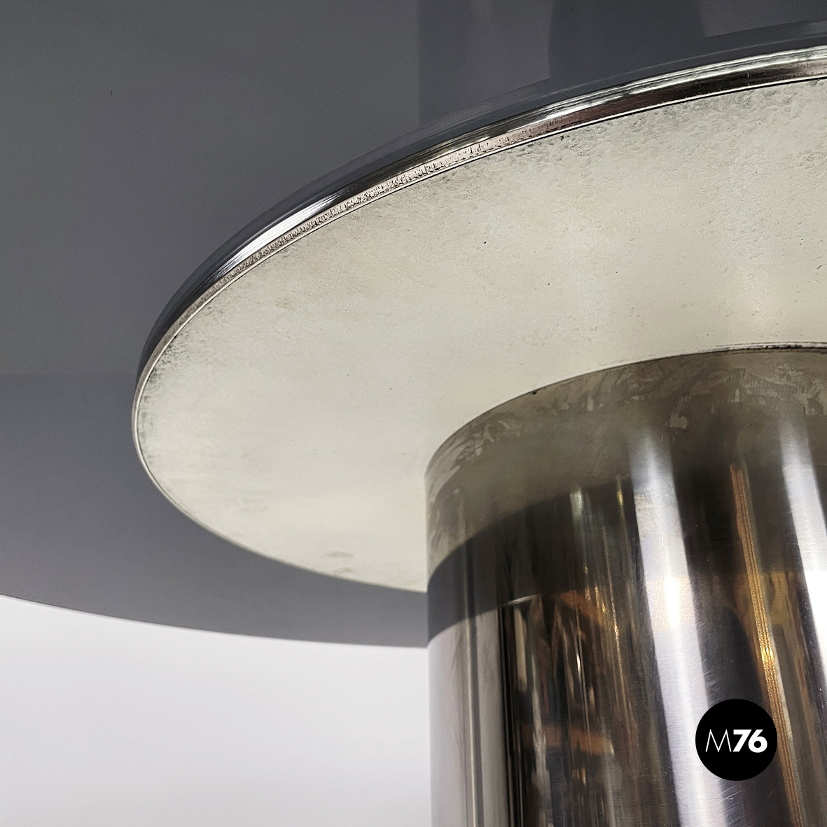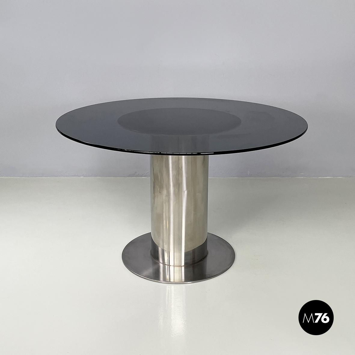 Tavolo da pranzo modello Cidonio con piano tondo in vetro fumè. La base cilindrica è in metallo cromato.