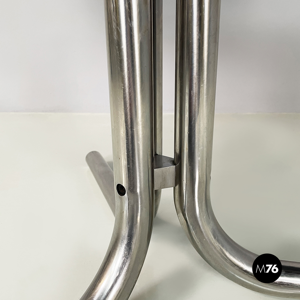 Tavolo da pranzo modello Desco con pianto rotondo in acciaio satinato con il profilo in plastica nera. La zampa a tre razze è in tubolare di metallo.