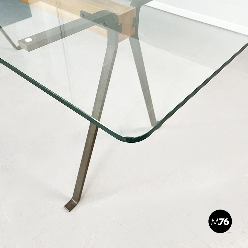 Tavolo da pranzo modello Frate con piano rettangolare in vetro temperato con angoli arrotondati. La struttura centrale è composta da una trave in legno massello che si collega alle gambe in acciaio verniciato nero.