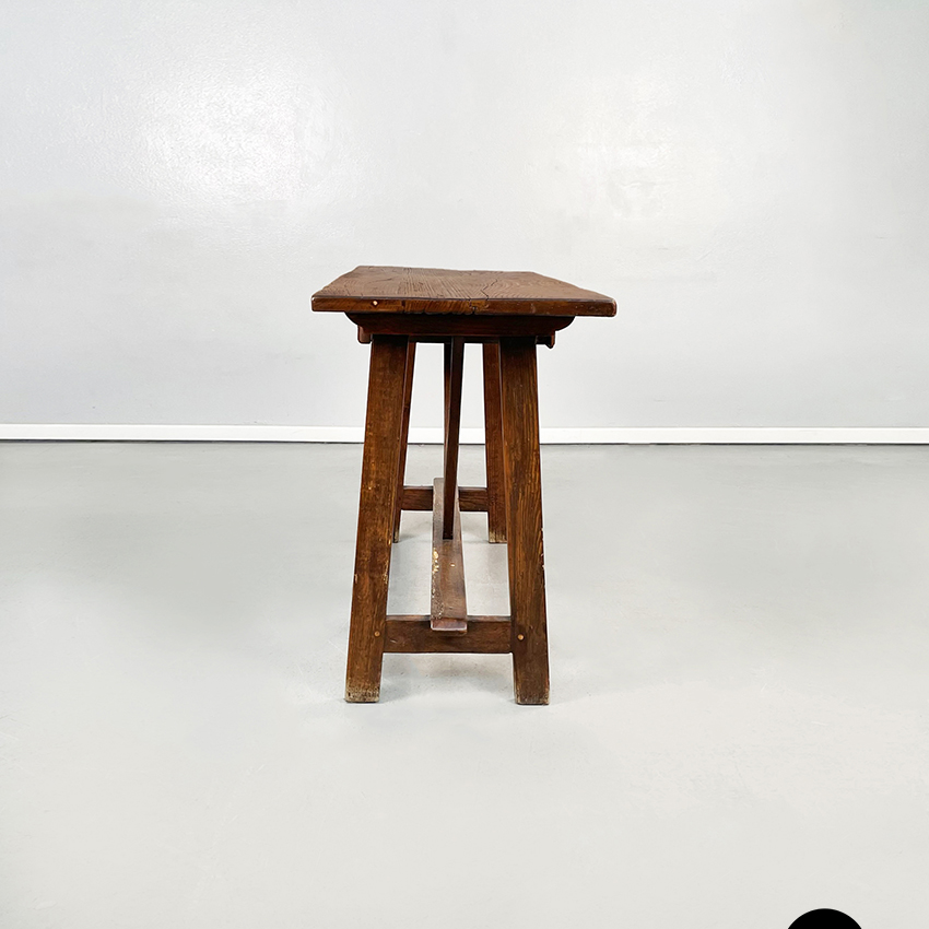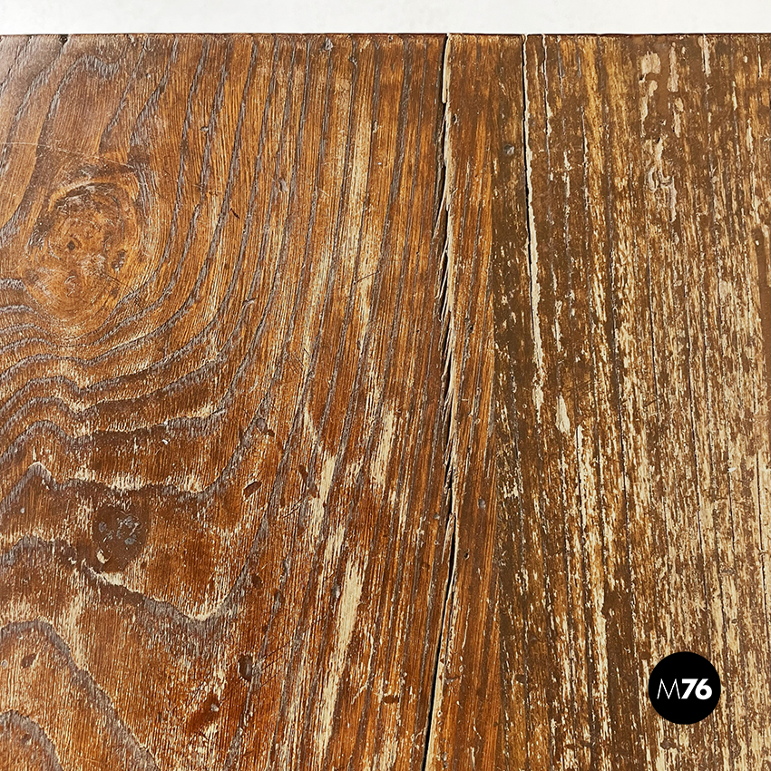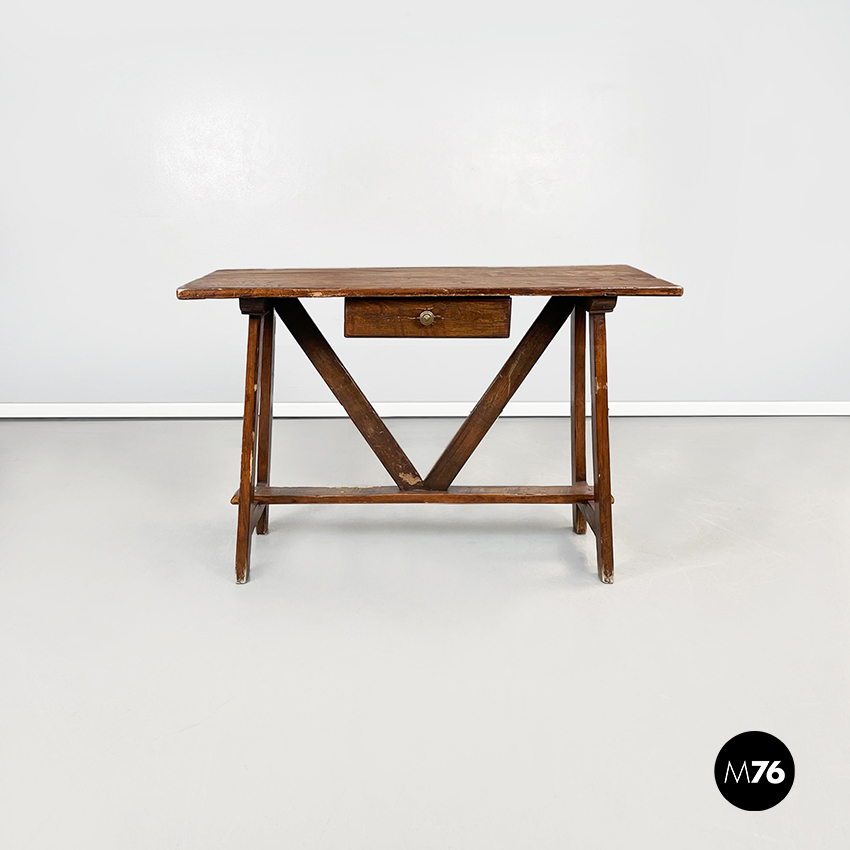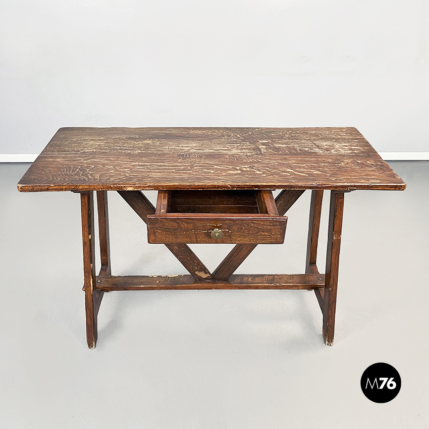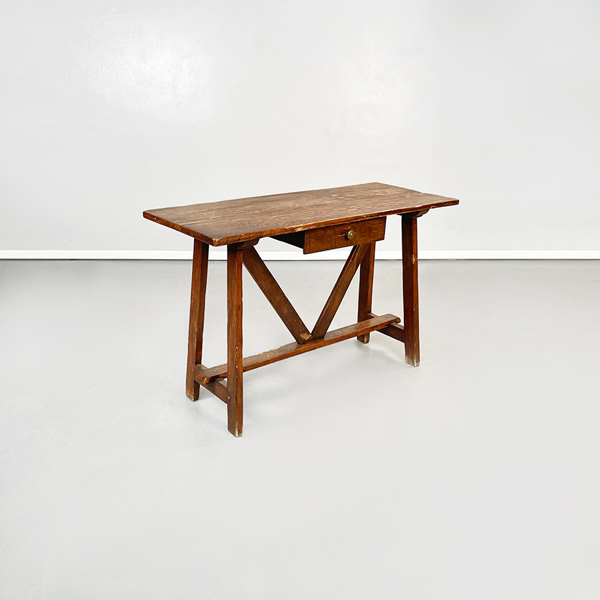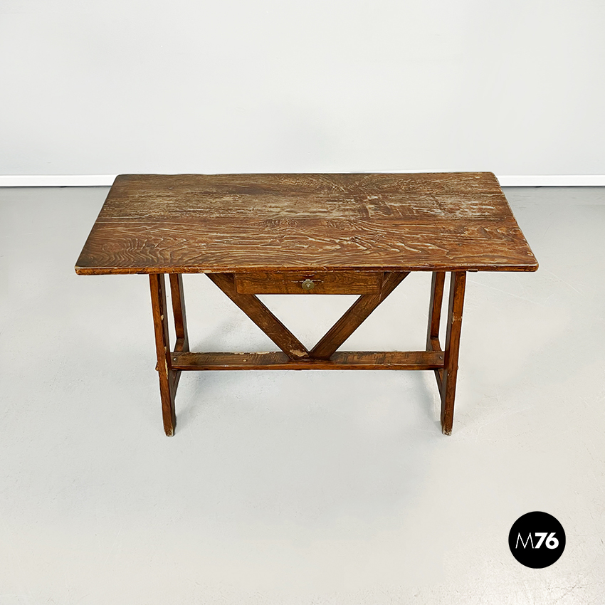 Tavolo da pranzo fratino rettangolare in legno. La struttura portante del piano è composta da diverse travi in legno. Al centro presenta un cassetto con maniglia tonda in metallo. Adatto anche come scrivania e tavolo laterale.