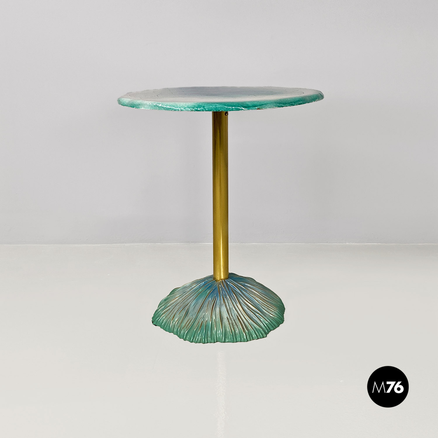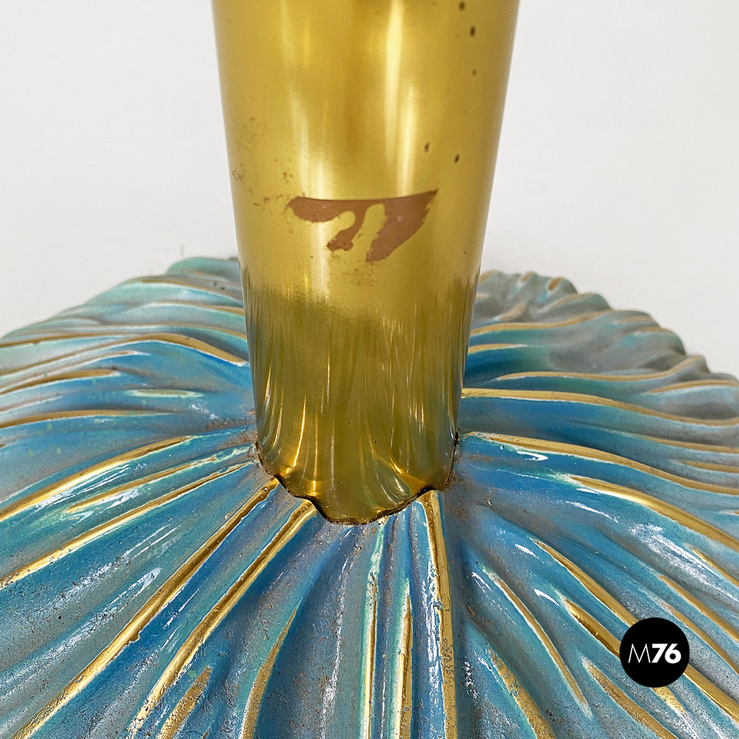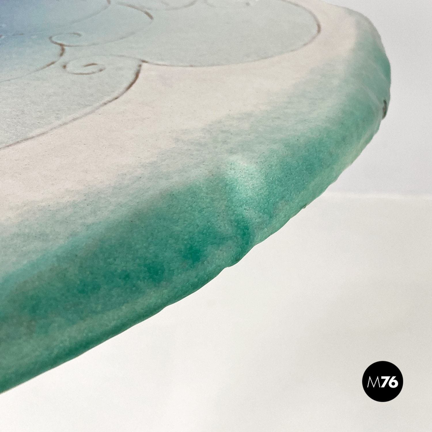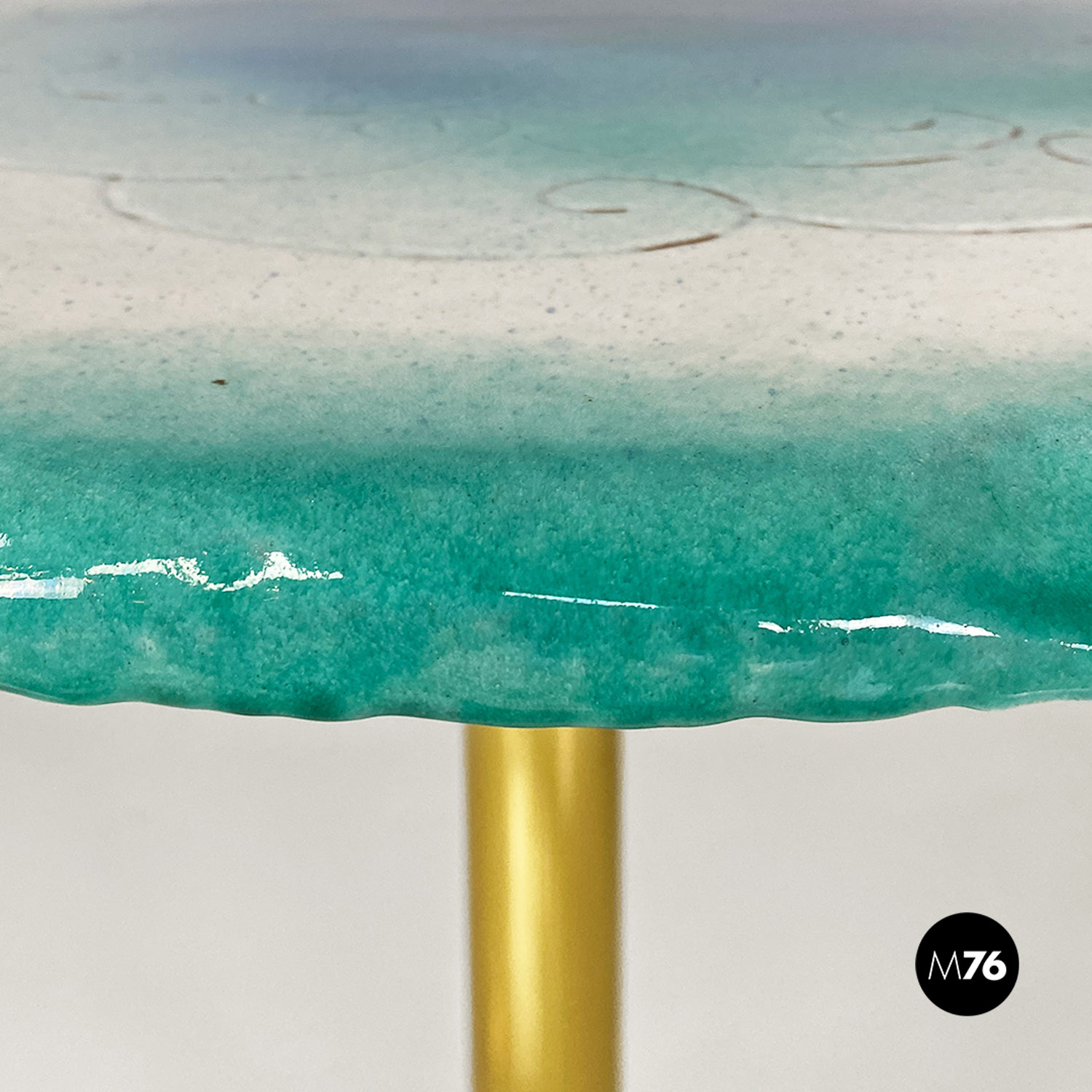 Tavolo da pranzo tondo con piano in ceramica con disegno inciso e colorazione sui toni dell’azzurro del bianco e dell’oro. Stelo centrale in ottone e base d’appoggio sempre in ceramica.