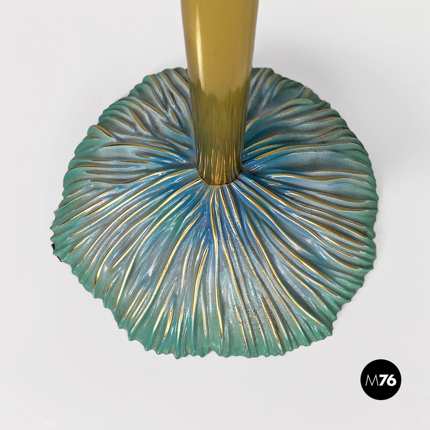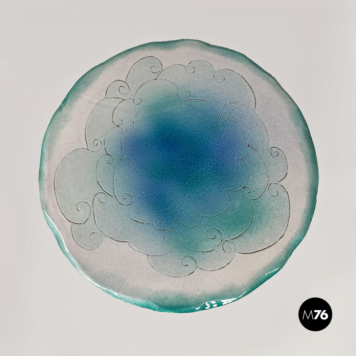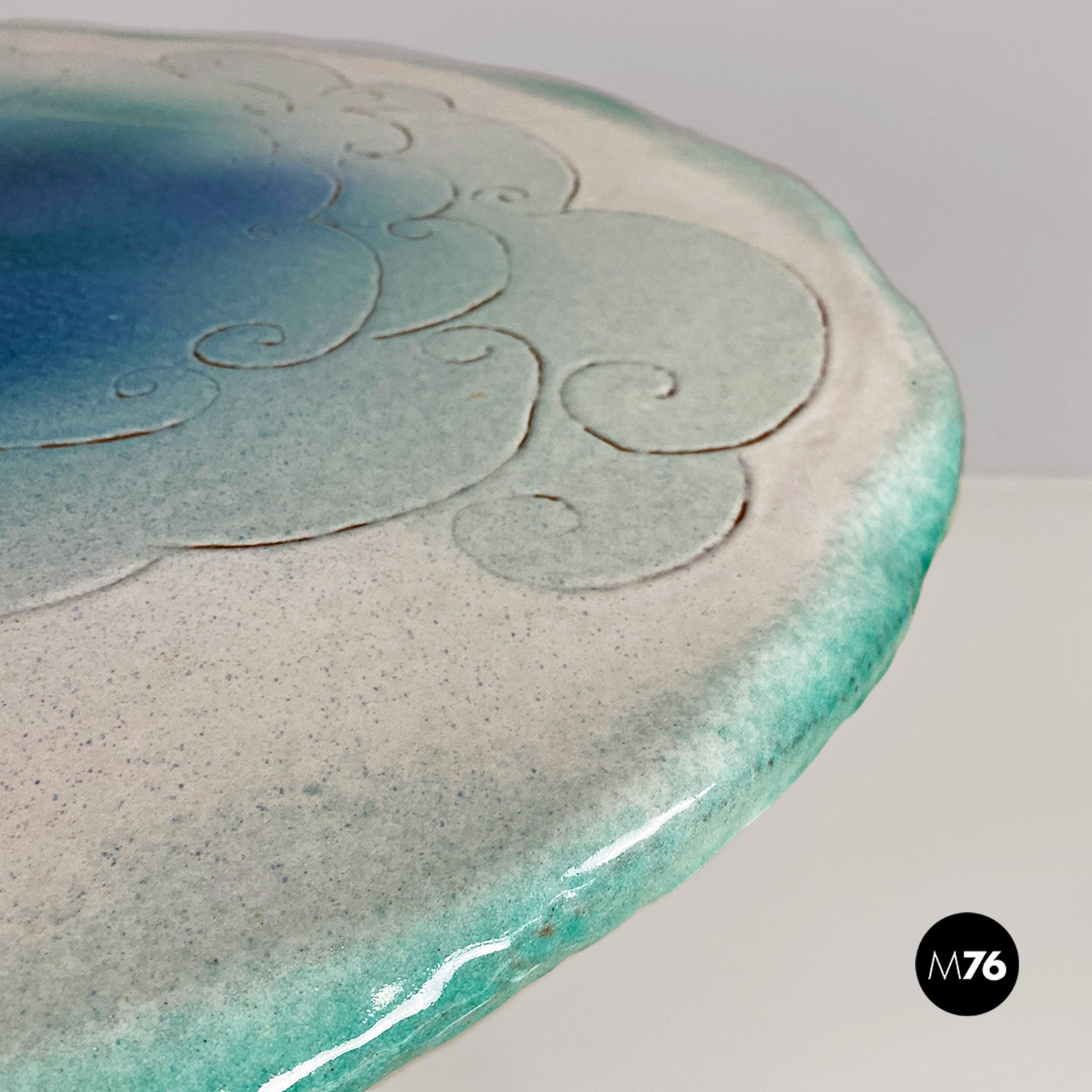 Tavolo da pranzo tondo con piano in ceramica con disegno inciso e colorazione sui toni dell’azzurro del bianco e dell’oro. Stelo centrale in ottone e base d’appoggio sempre in ceramica.
