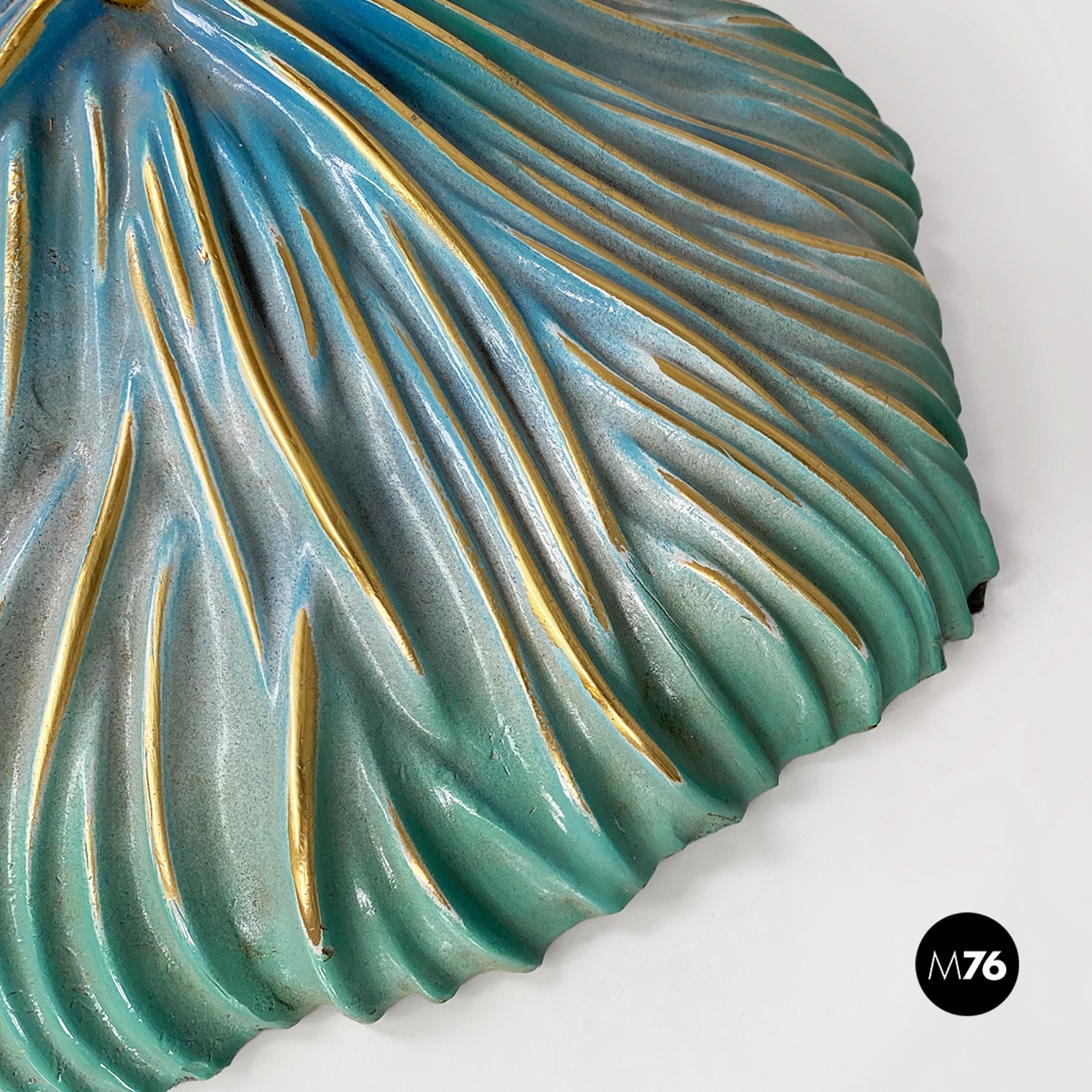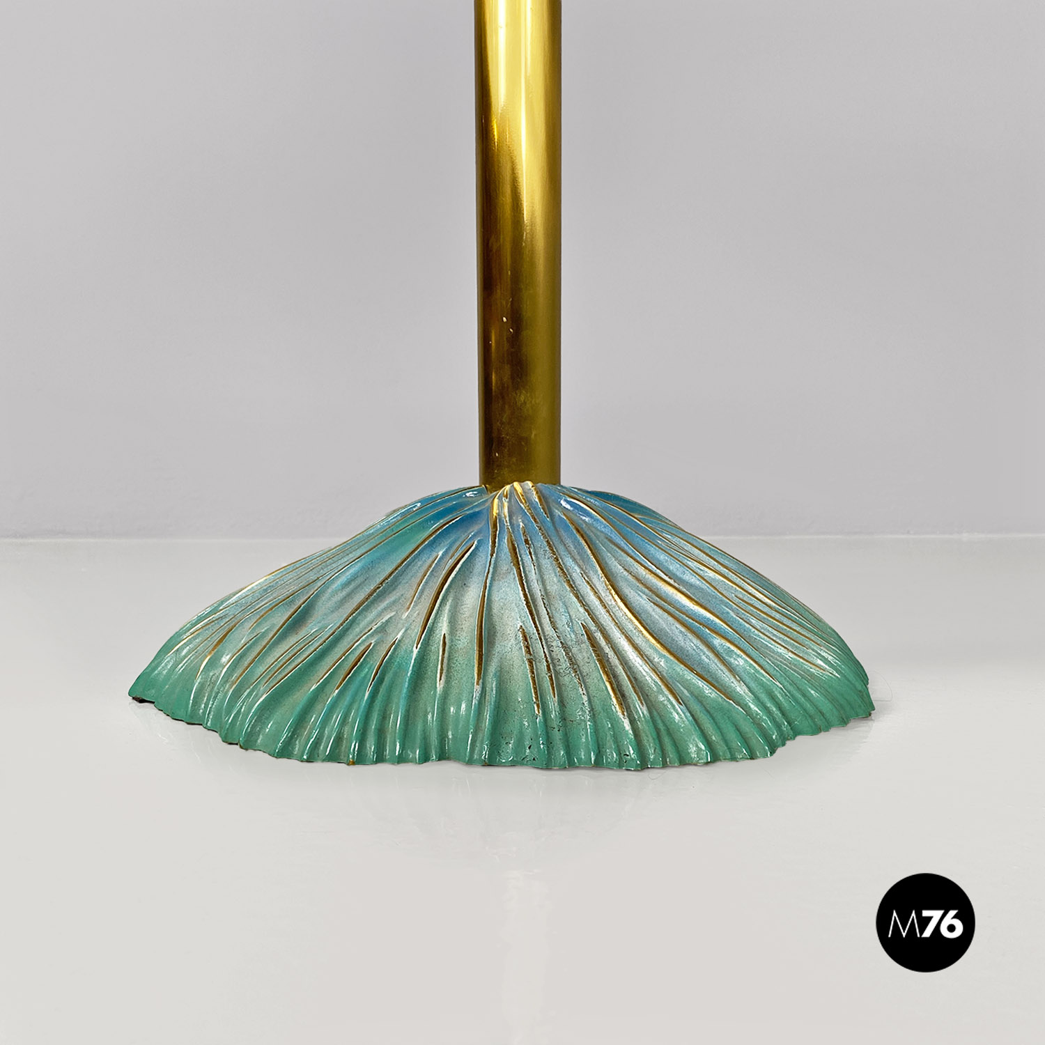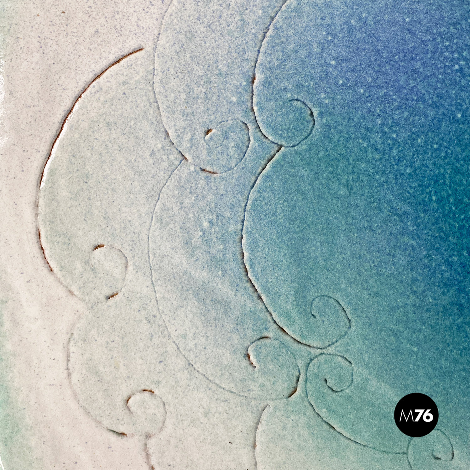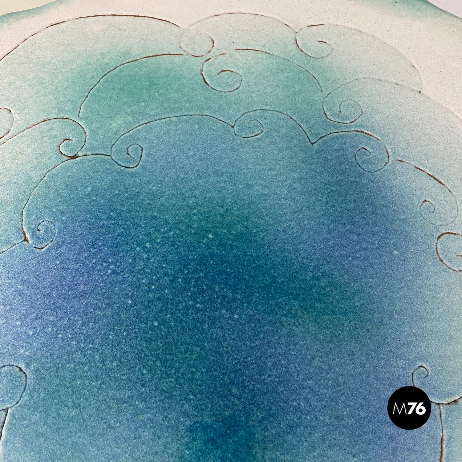 Tavolo da pranzo tondo con piano in ceramica con disegno inciso e colorazione sui toni dell’azzurro del bianco e dell’oro. Stelo centrale in ottone e base d’appoggio sempre in ceramica.