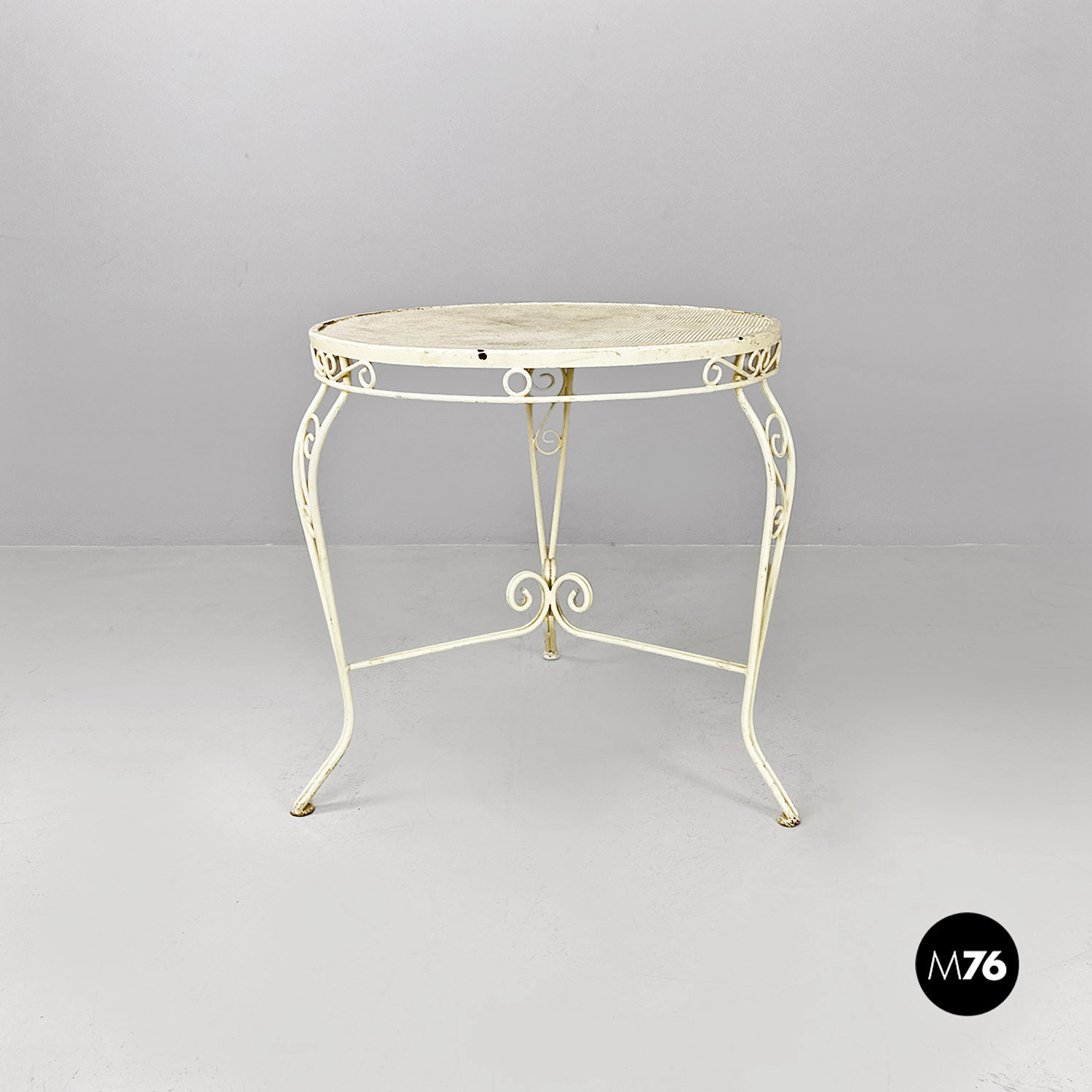 Tavolo da pranzo tondo con struttura in ferro battuto verniciato bianco panna. Il piano tondo è traforato. Il bordo del piano e le tre gambe sono finemente lavorate con riccioli. Utilizzabile in un ambiente esterno come un terrazzo o un giardino.