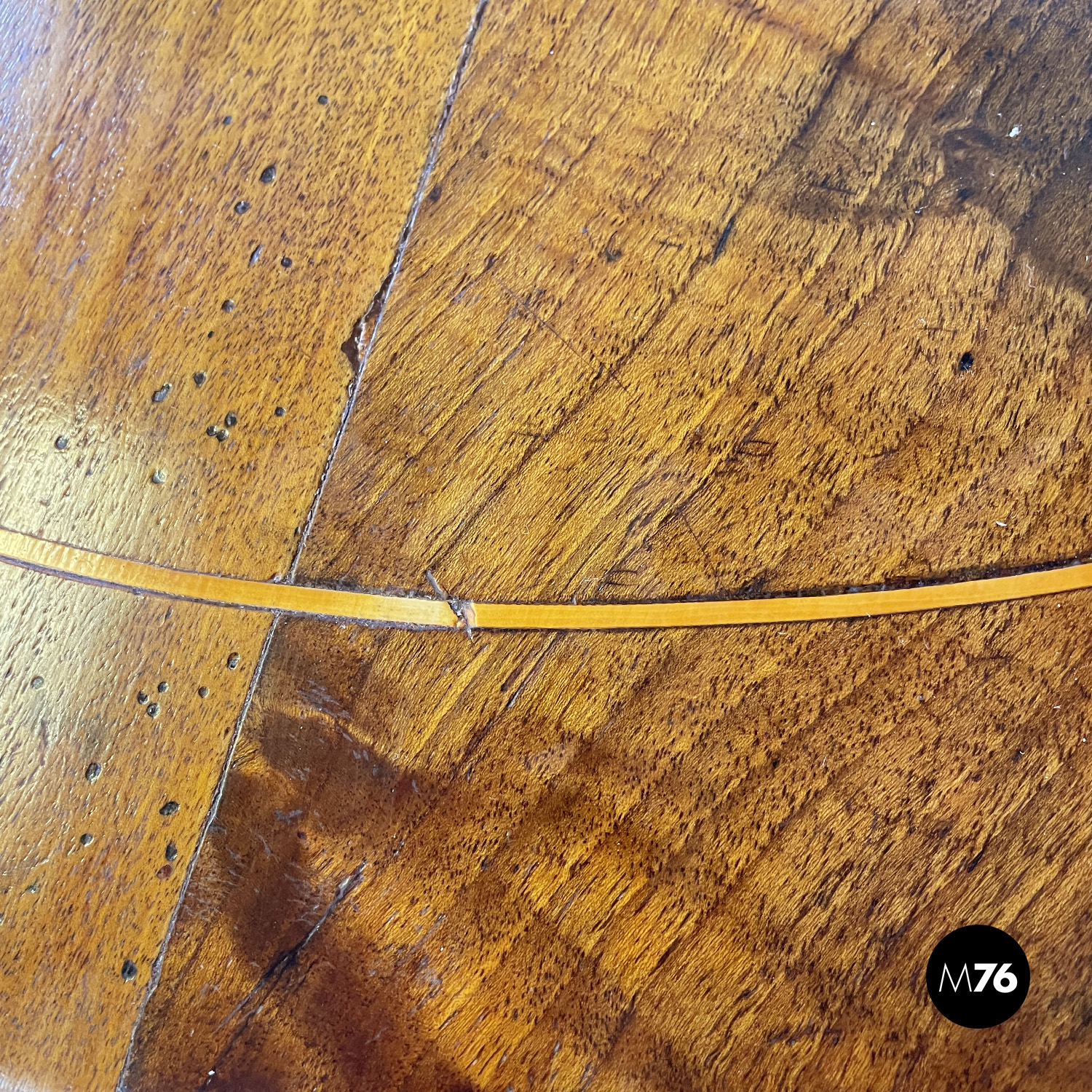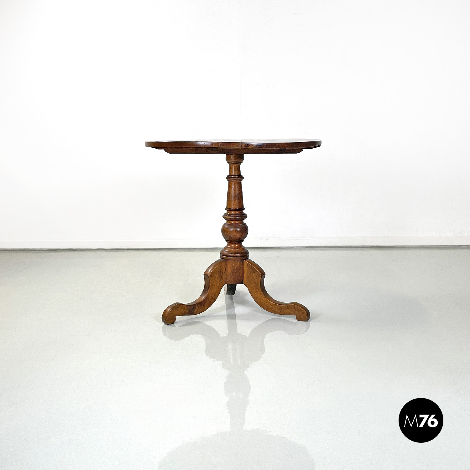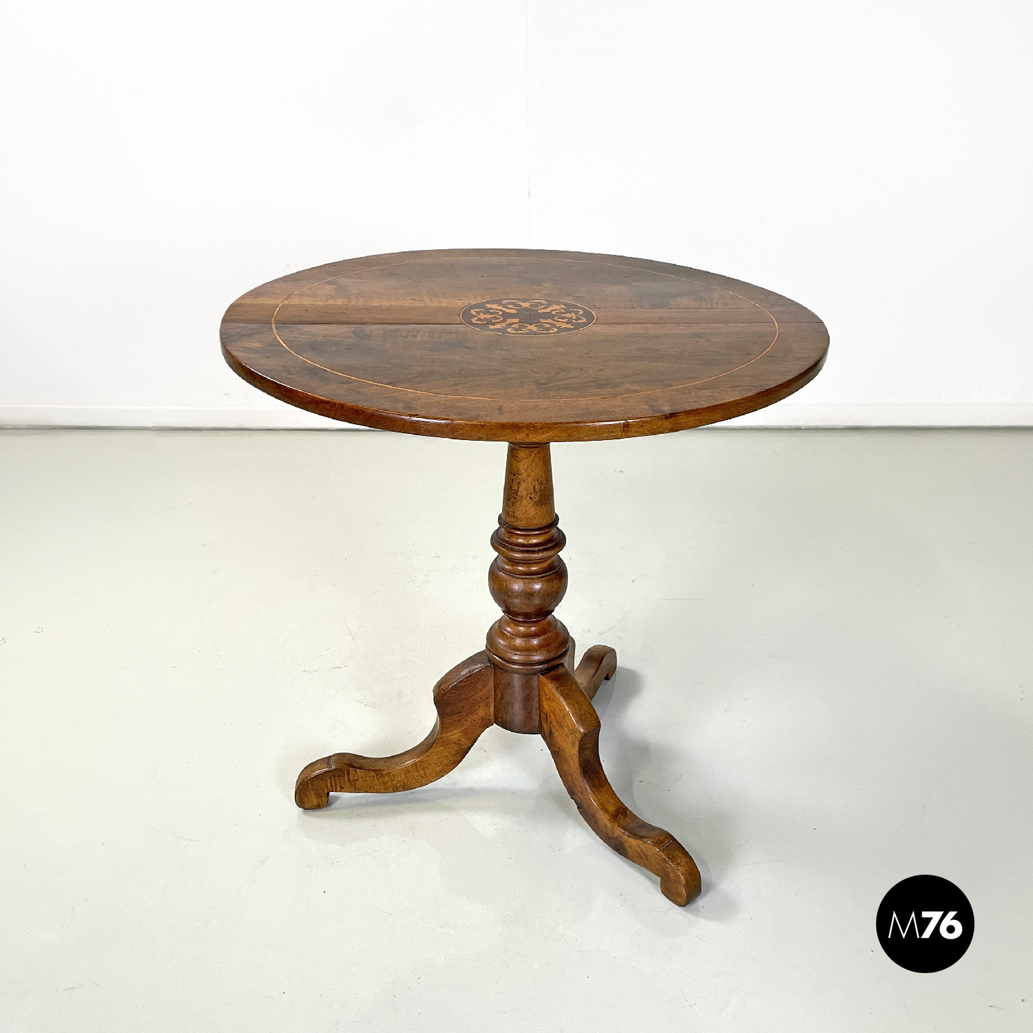 Tavolo da pranzo tondo in legno. Sul piano presenta nella parte centrale una decorazione floreale damascata tonda intarsiata e vicino al bordo una linea decorativa anch’essa intarsiata. Lo stelo centrale finemente lavorato ha linee tondeggianti e termina con tre razze a sezione rettangolare che curvano all’appoggio a terra.
