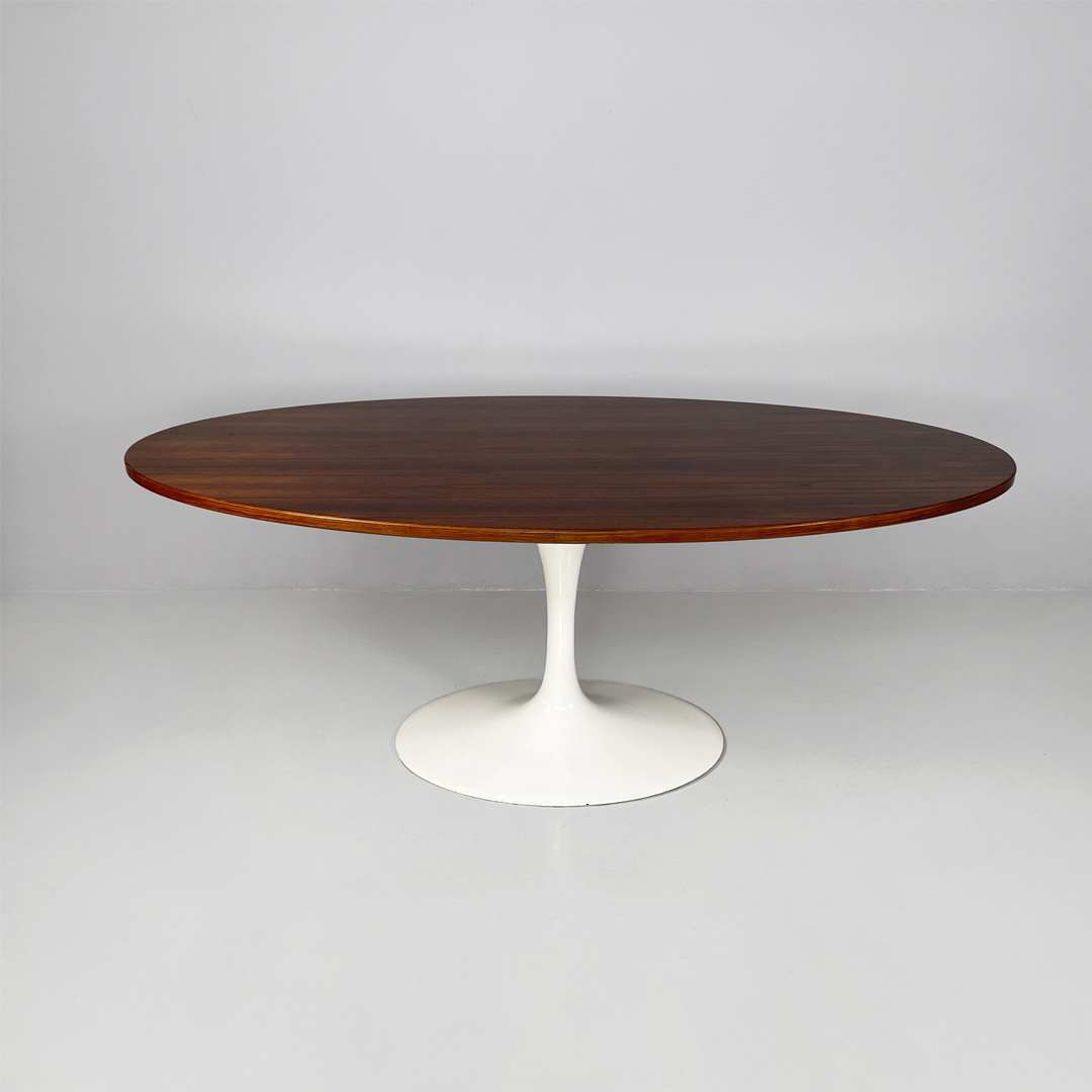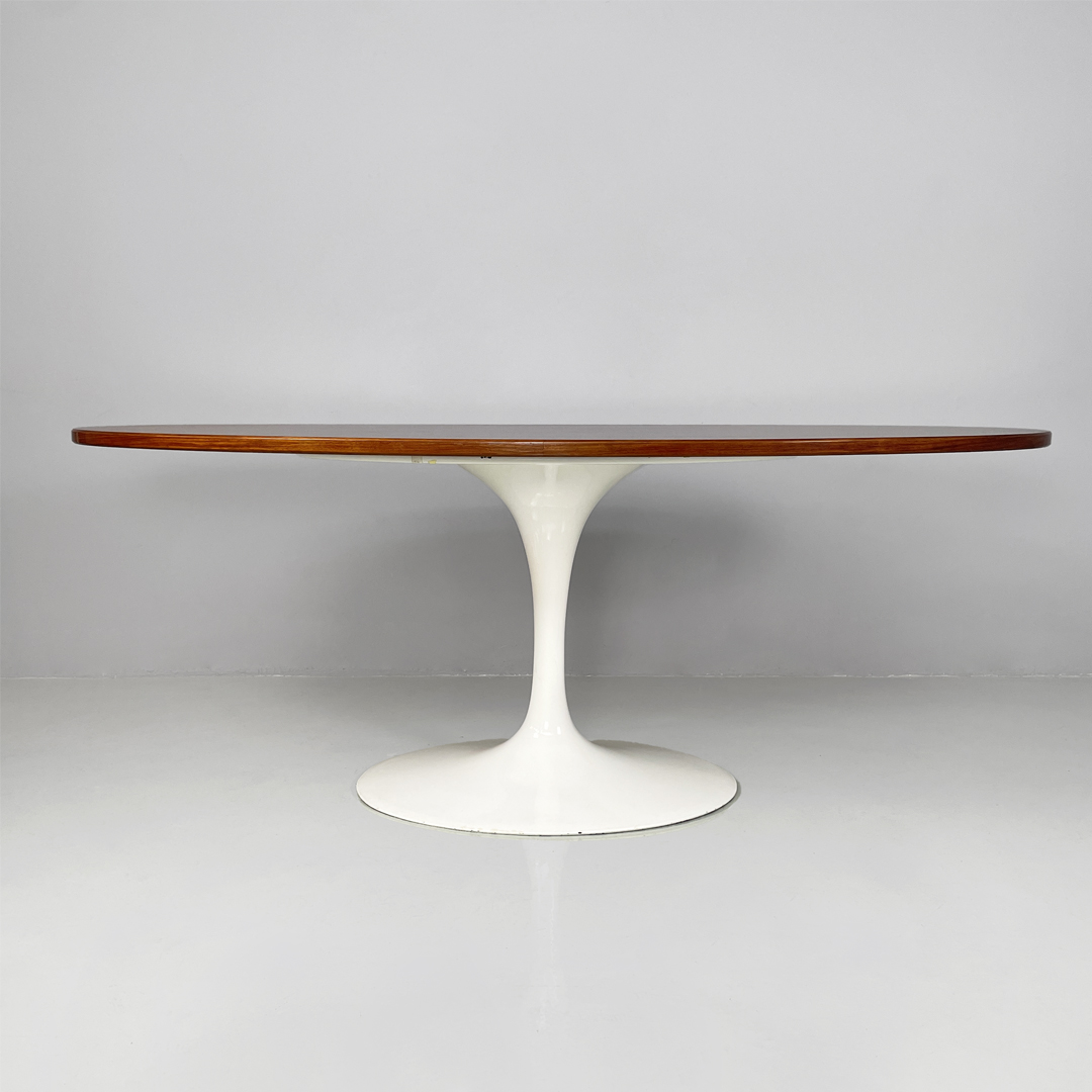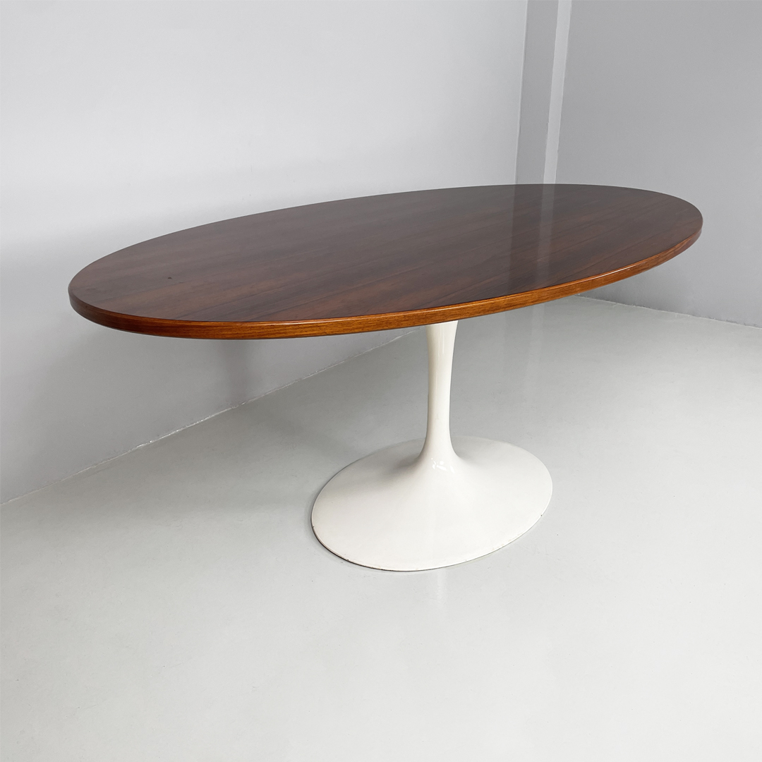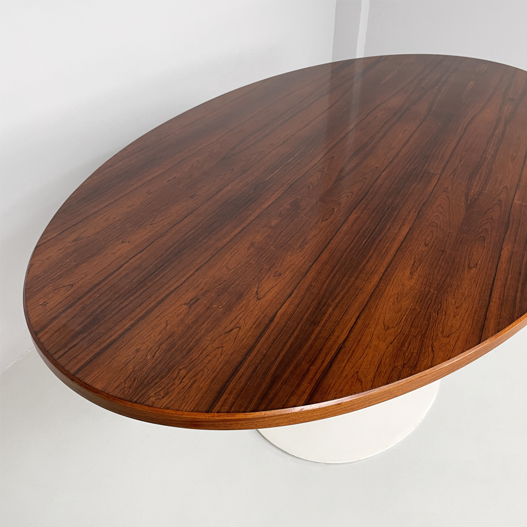 Tavolo da pranzo con piano ovale in legno. La zampa dal tavolo è a base tonda in metallo verniciato bianco.